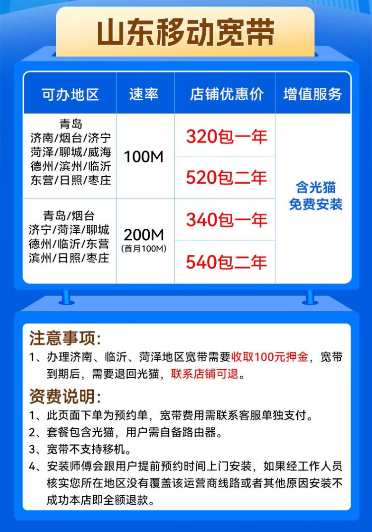 China Mobile Shandong 100M 200M mobile broadband installation installation King Kong Mobile 100M single broadband 520 yuan package for two years, free installation fee