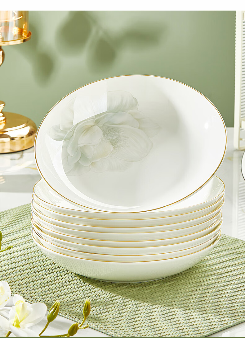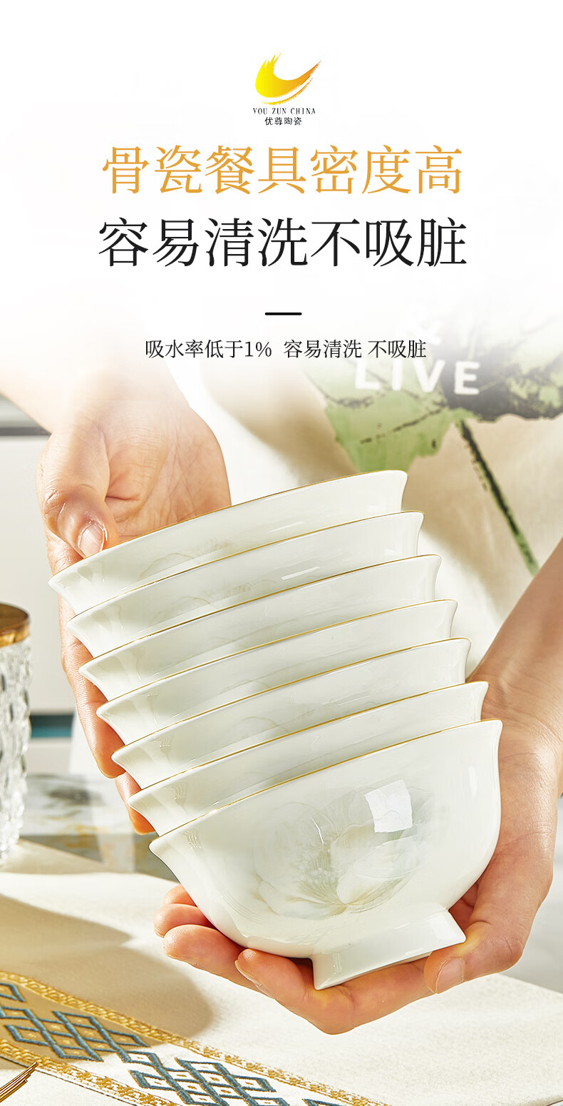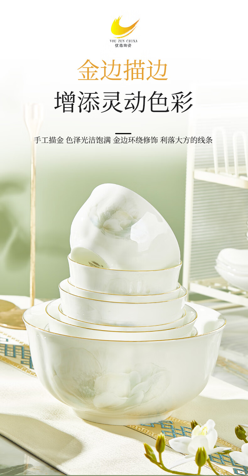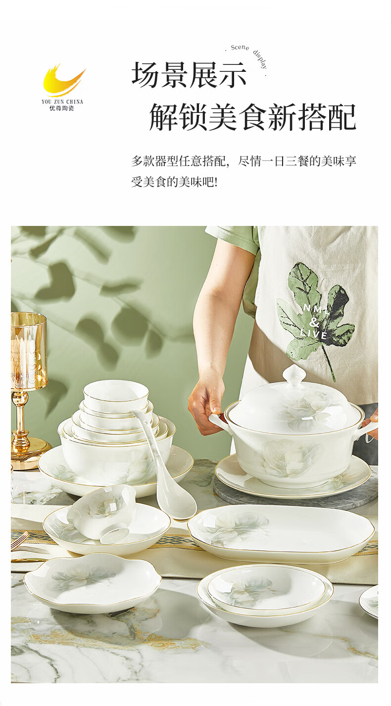 Youzun Ceramics bone china bowl and dish set for home move-in and new home gift new light luxury high-end tableware plate and dish set 60-piece gift box Begonia bowl series soup bowl version
