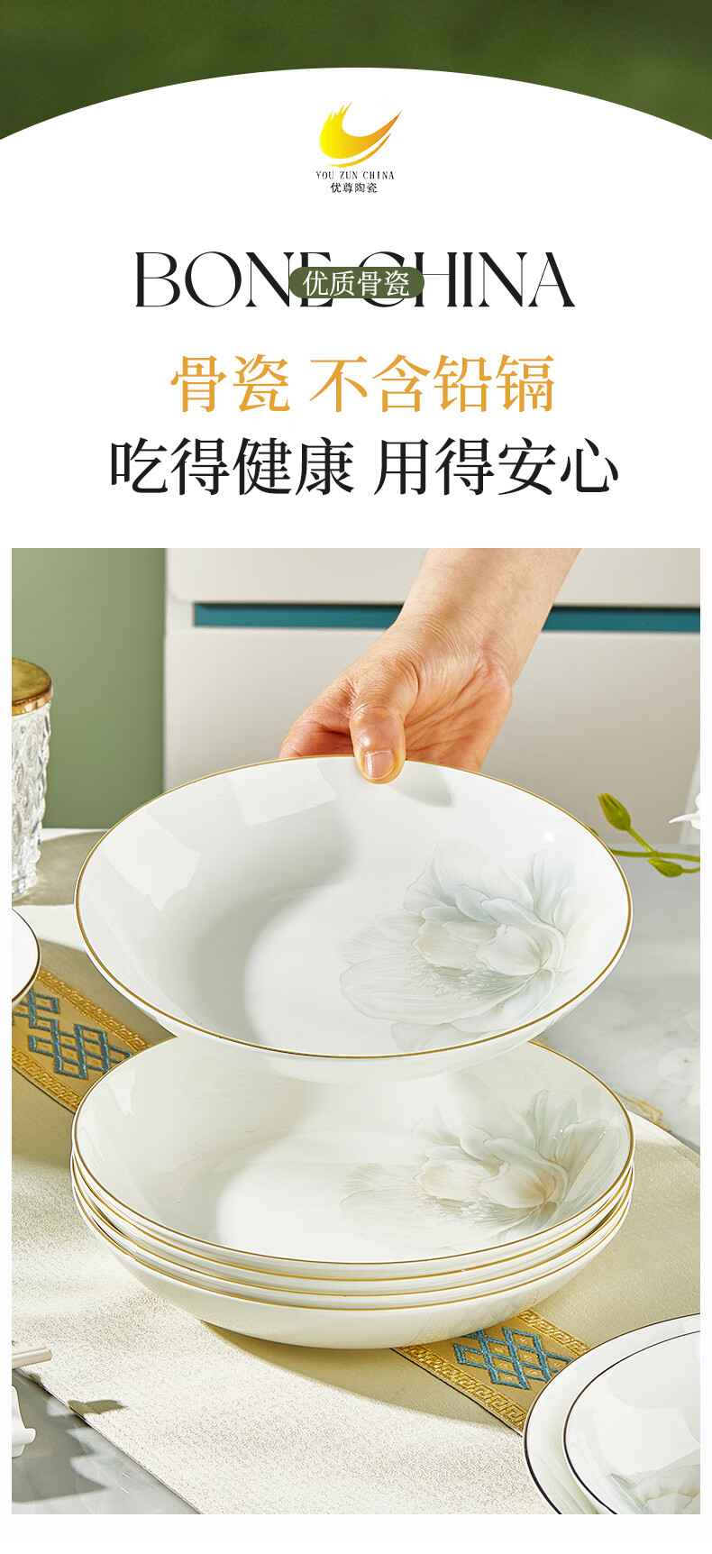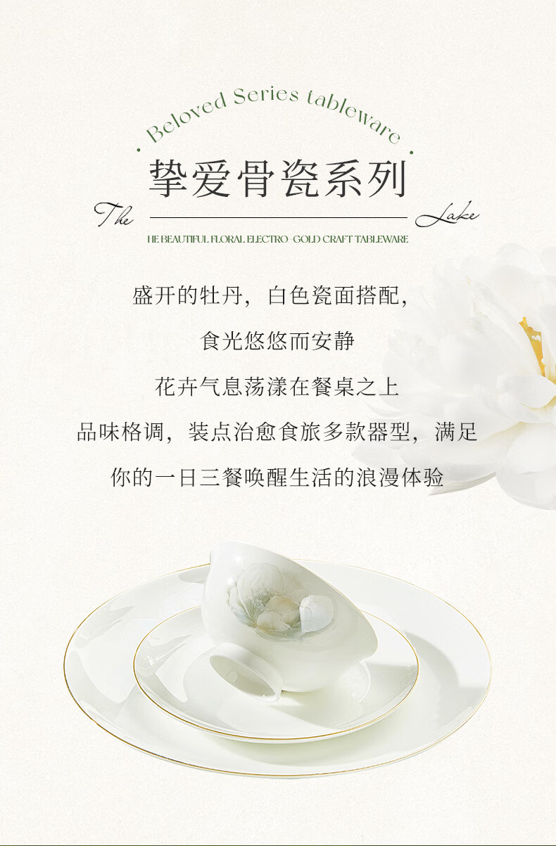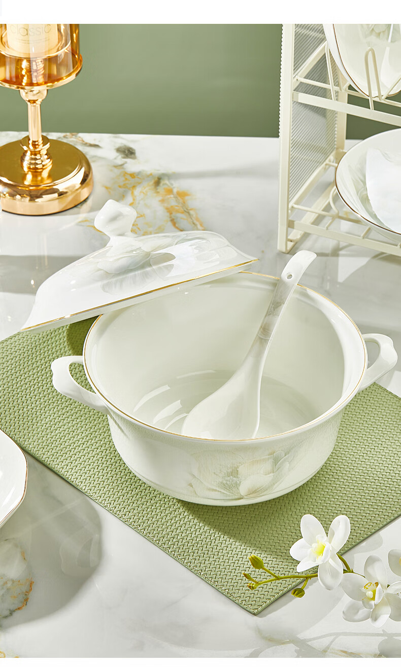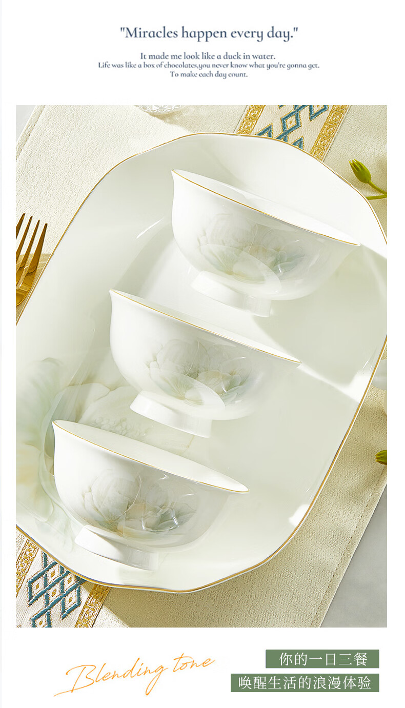 Youzun Ceramics bone china bowl and dish set for home move-in and new home gift new light luxury high-end tableware plate and dish set 60-piece gift box Begonia bowl series soup bowl version