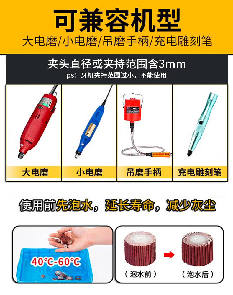 He Jiagong 6mm live handle louver wheel grinding head with handle emery cloth wheel grinding head woodworking sandpaper polishing wheel hundred-page wheel electric grinding head 20*16*6 handle 80 mesh 100 pieces (10 rods included)