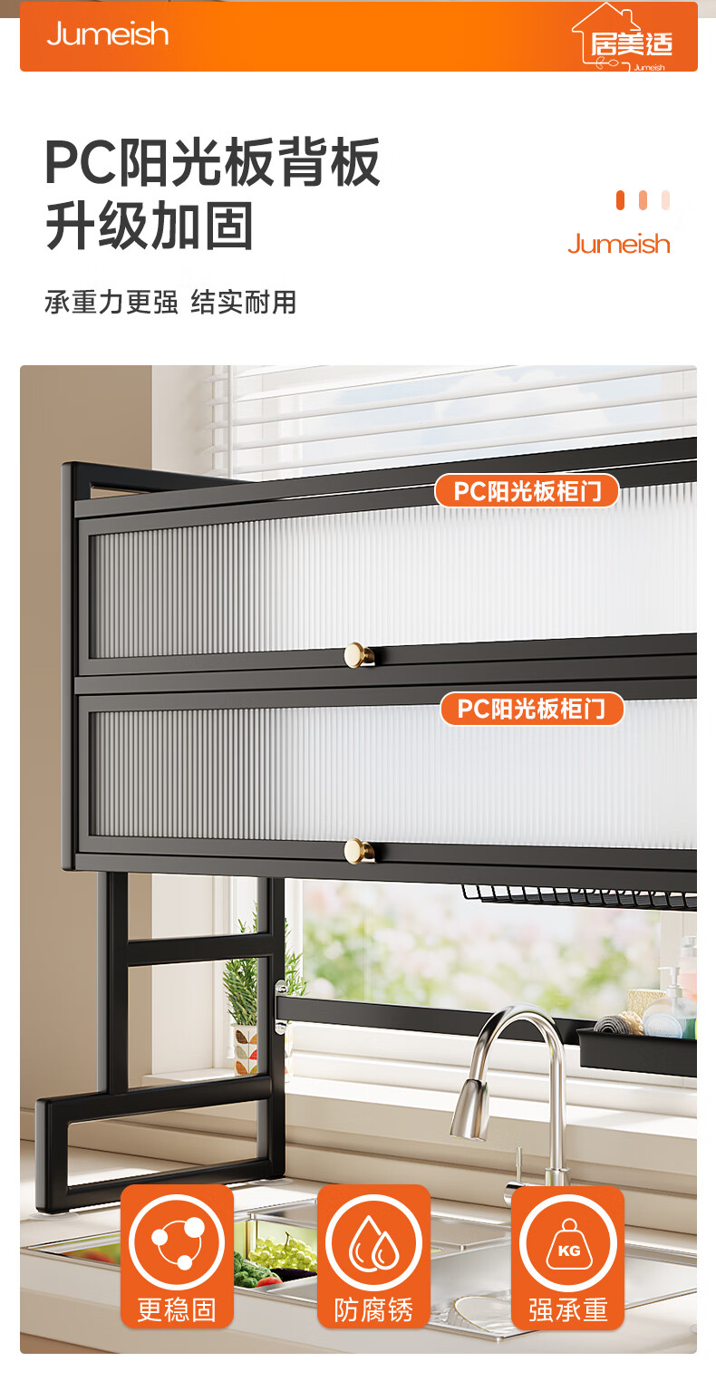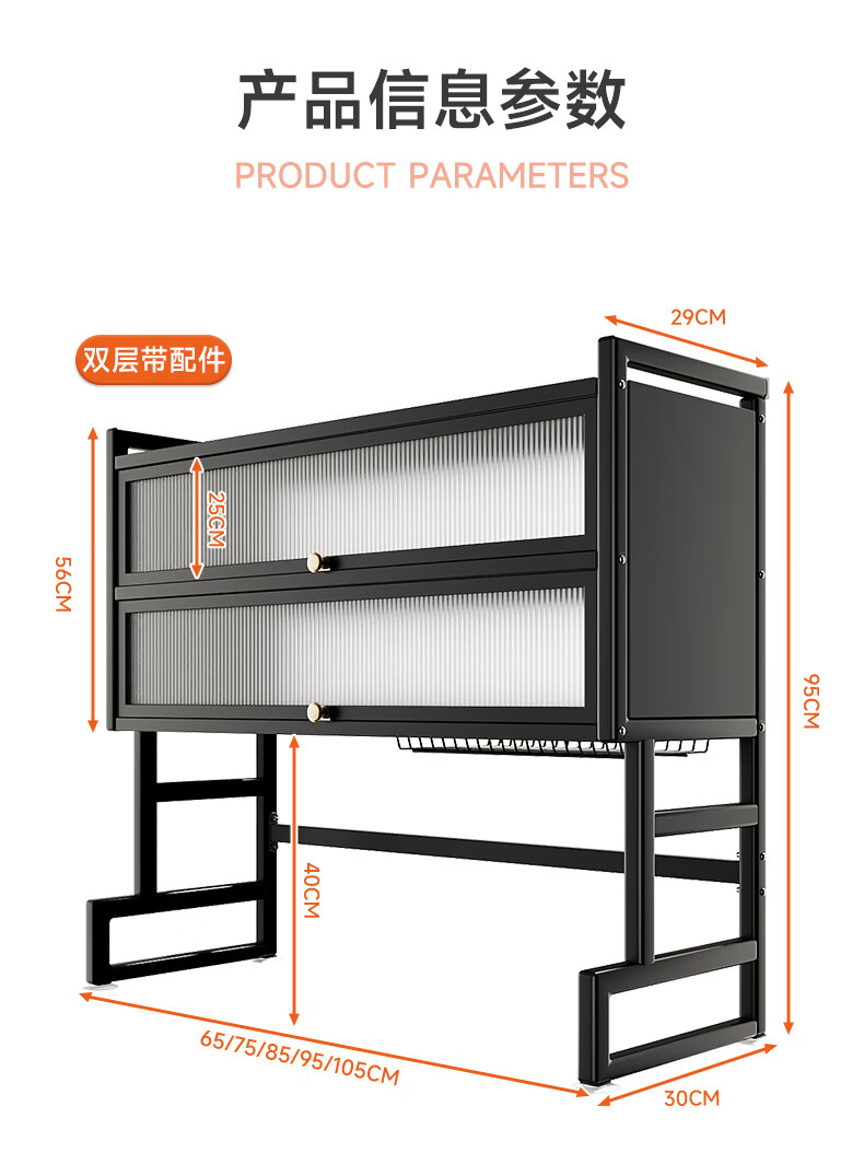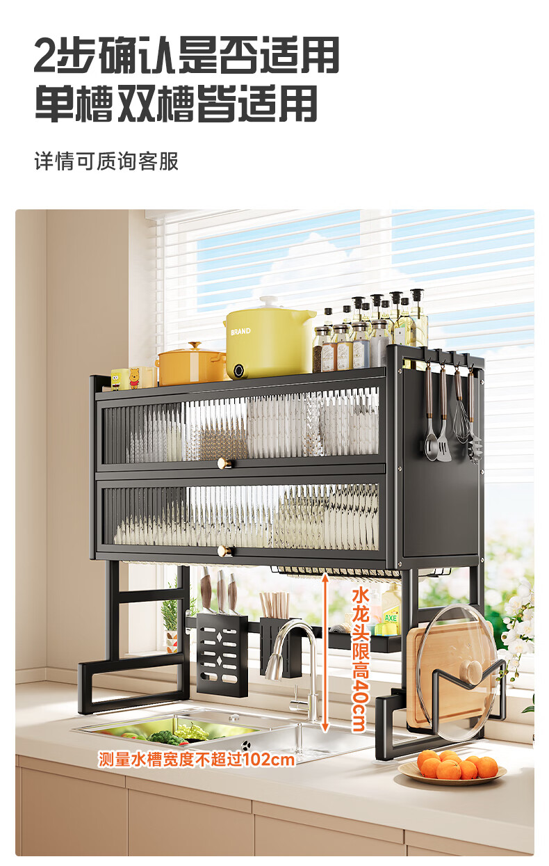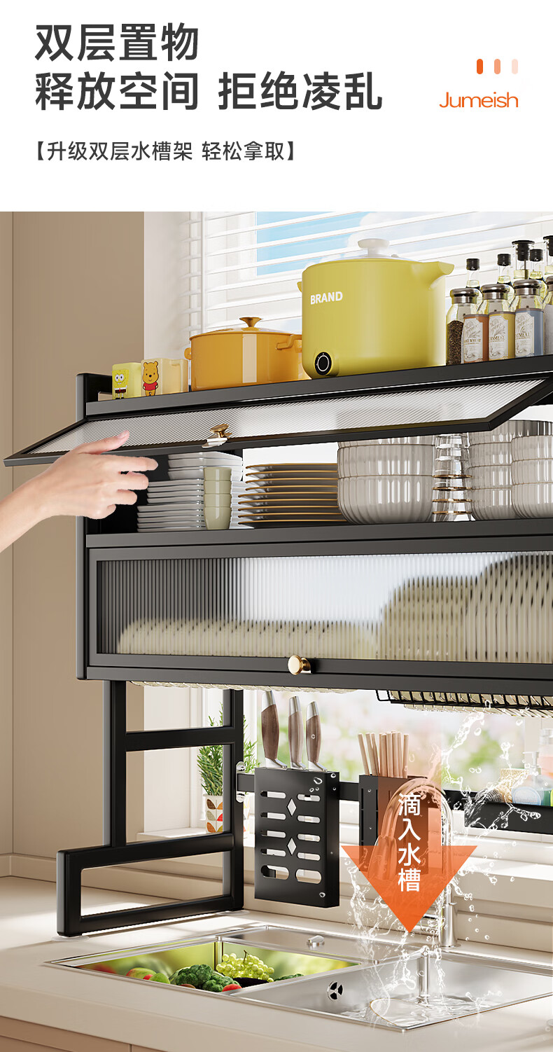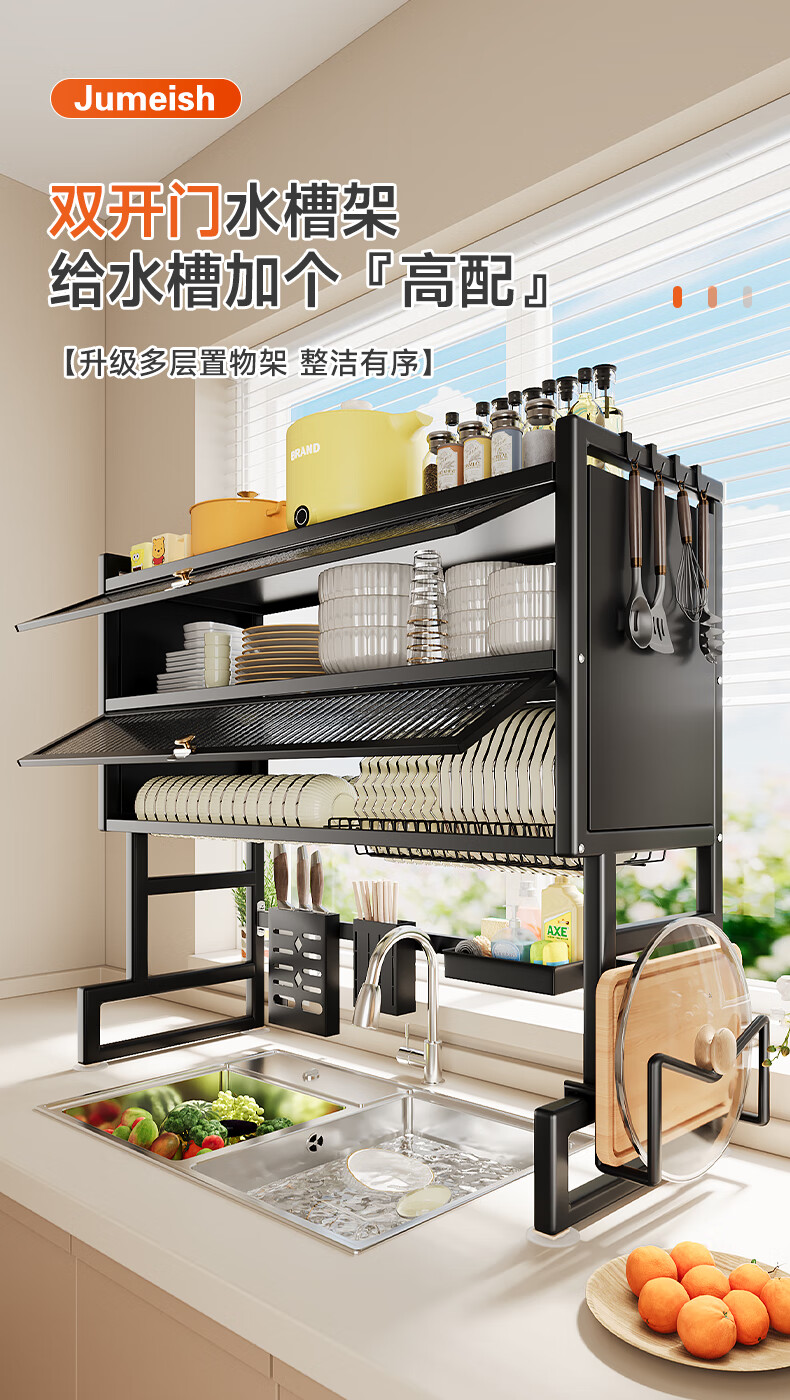 Jumeishi kitchen sink rack dish drainer with door dust-proof rack above cabinet countertop cupboard multi-functional storage rack Yaohei-double layer length 65cm+6 hooks+luxury set