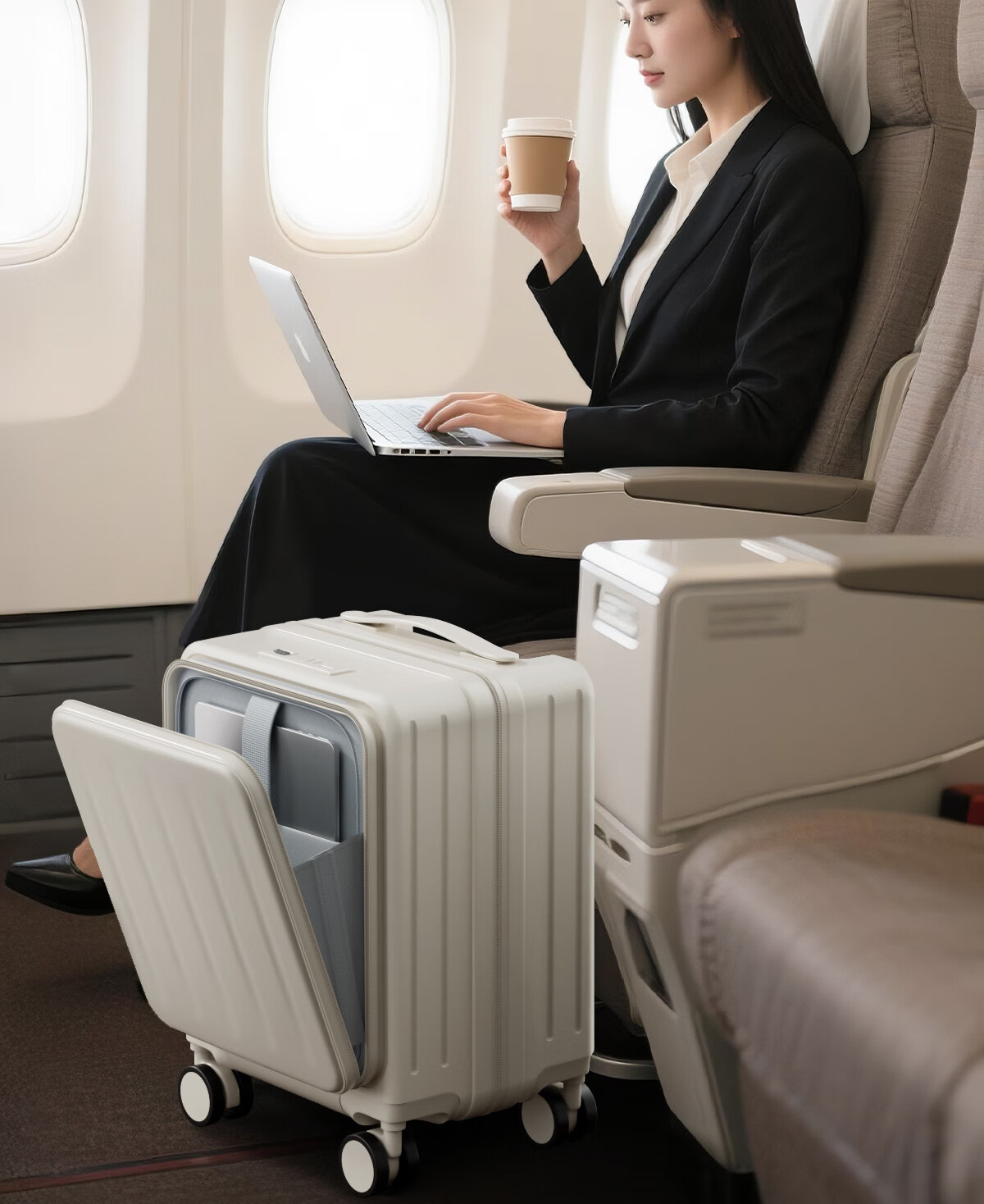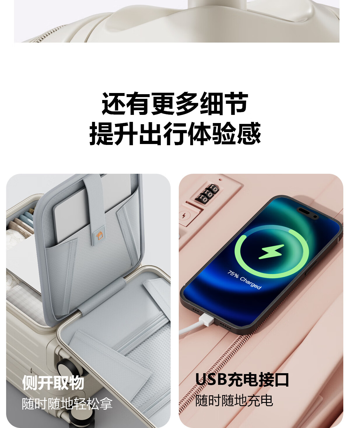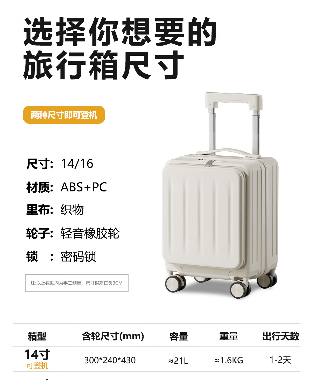 Kangaroo (KANGAROO) 14-inch suitcase can get on the plane, front opening boarding case, small lightweight portable trolley case, low-cost airline business trip suitcase, ivory white - front opening computer compartment - USB charging interface 14 inches, free of charge for airlines