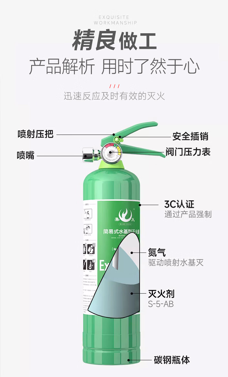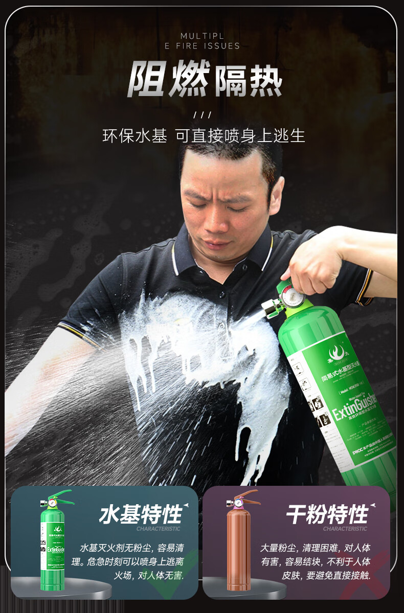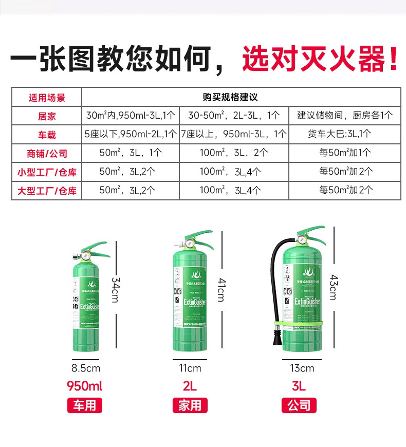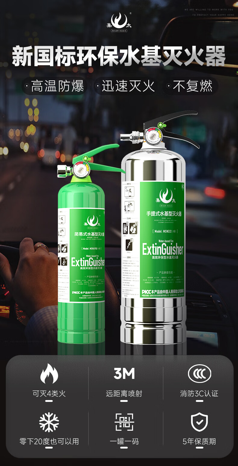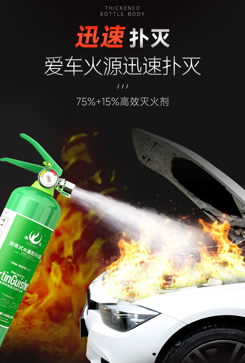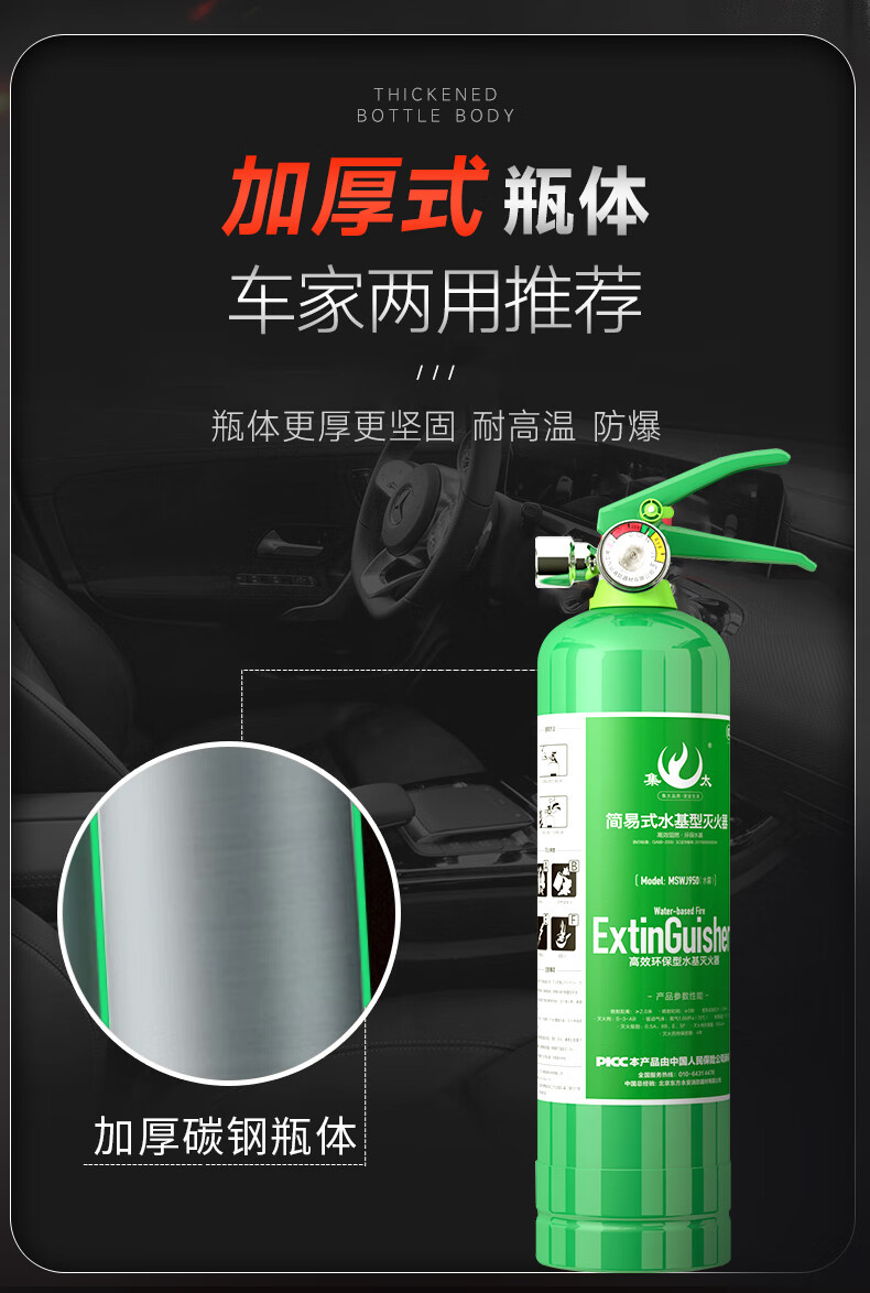 Vehicle-mounted water-based fire extinguisher green portable three-piece set for annual inspection private car small household 2L high temperature explosion-proof dual-use for car and home