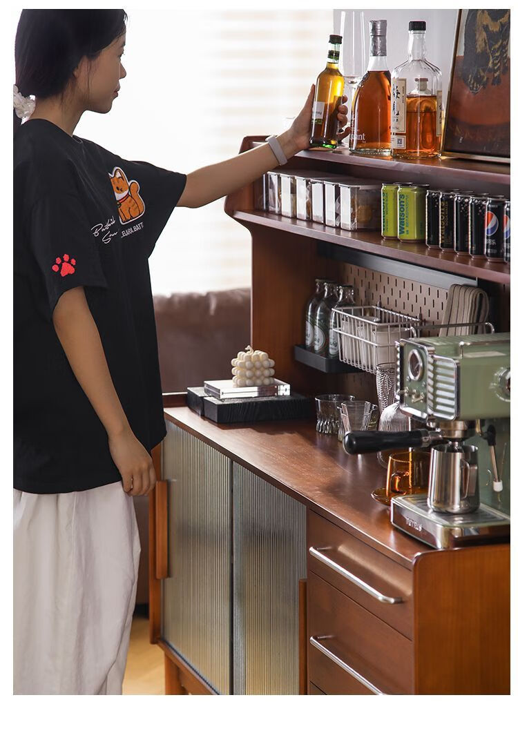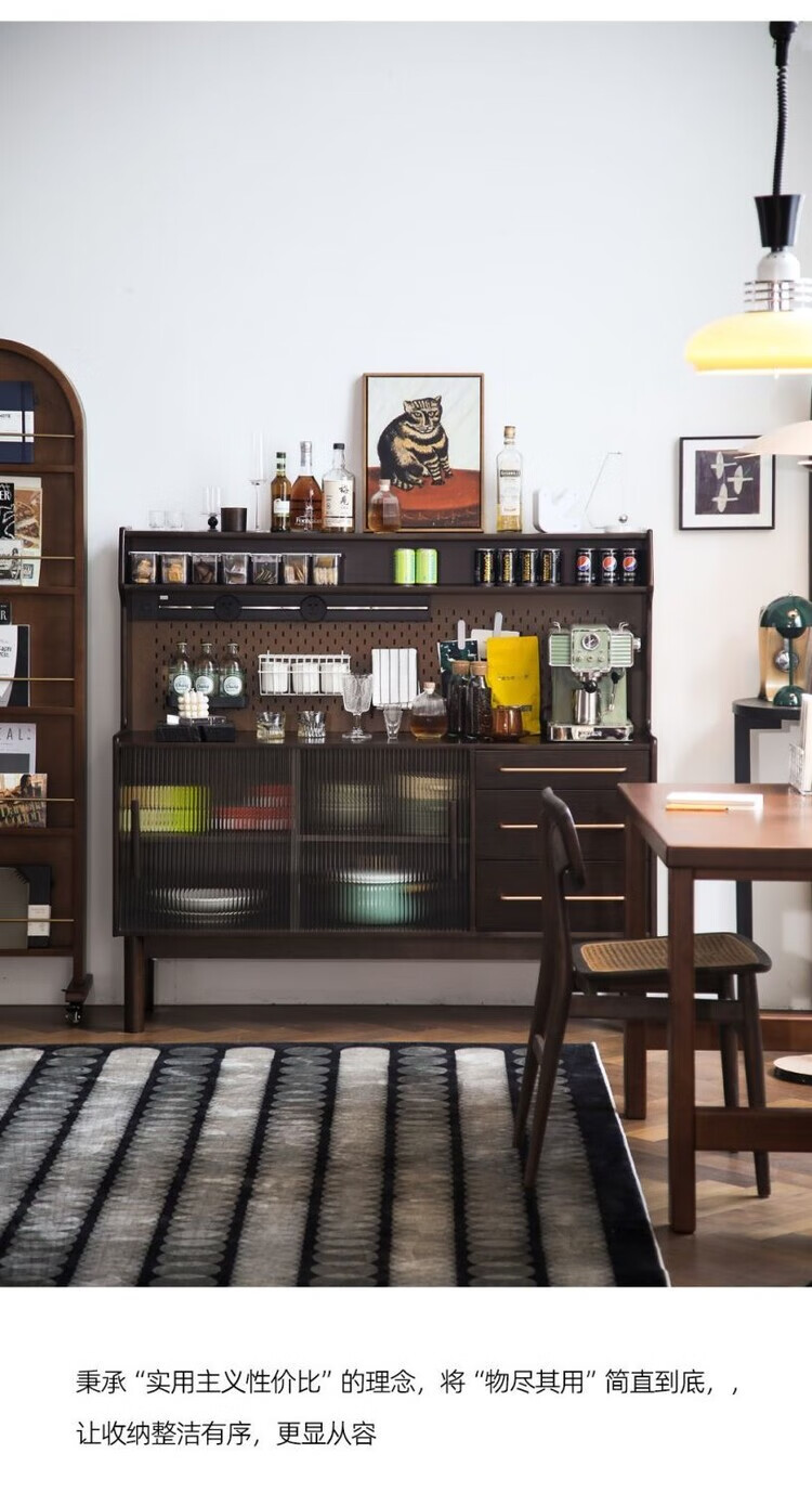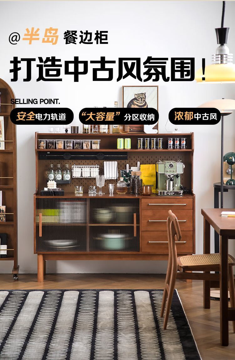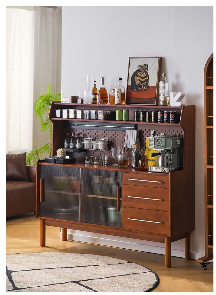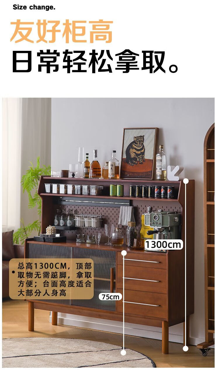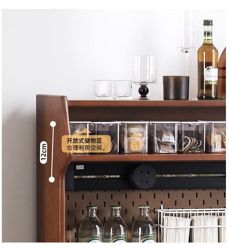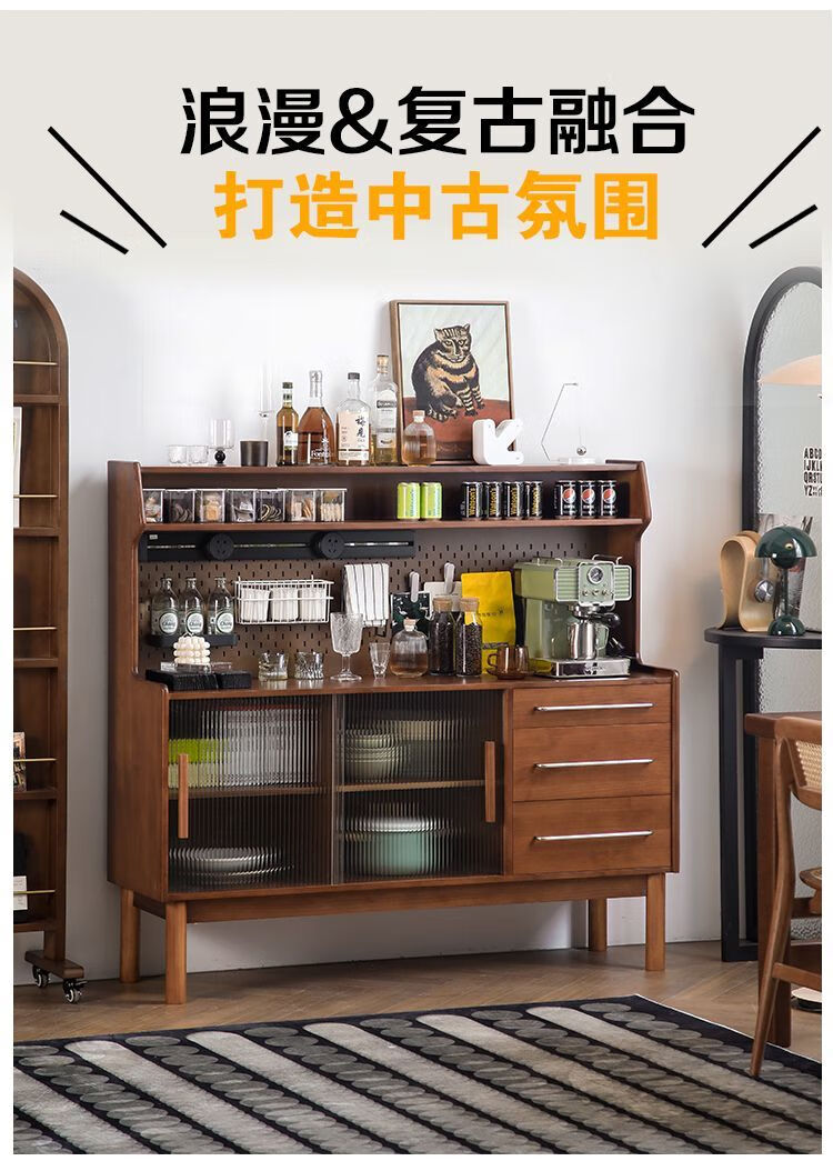 Fu Zhen solid wood sideboard Nordic all-in-one storage wall living room wine cabinet tea multi-function storage cabinet with electric rail 80cm+ hole board style medium antique color