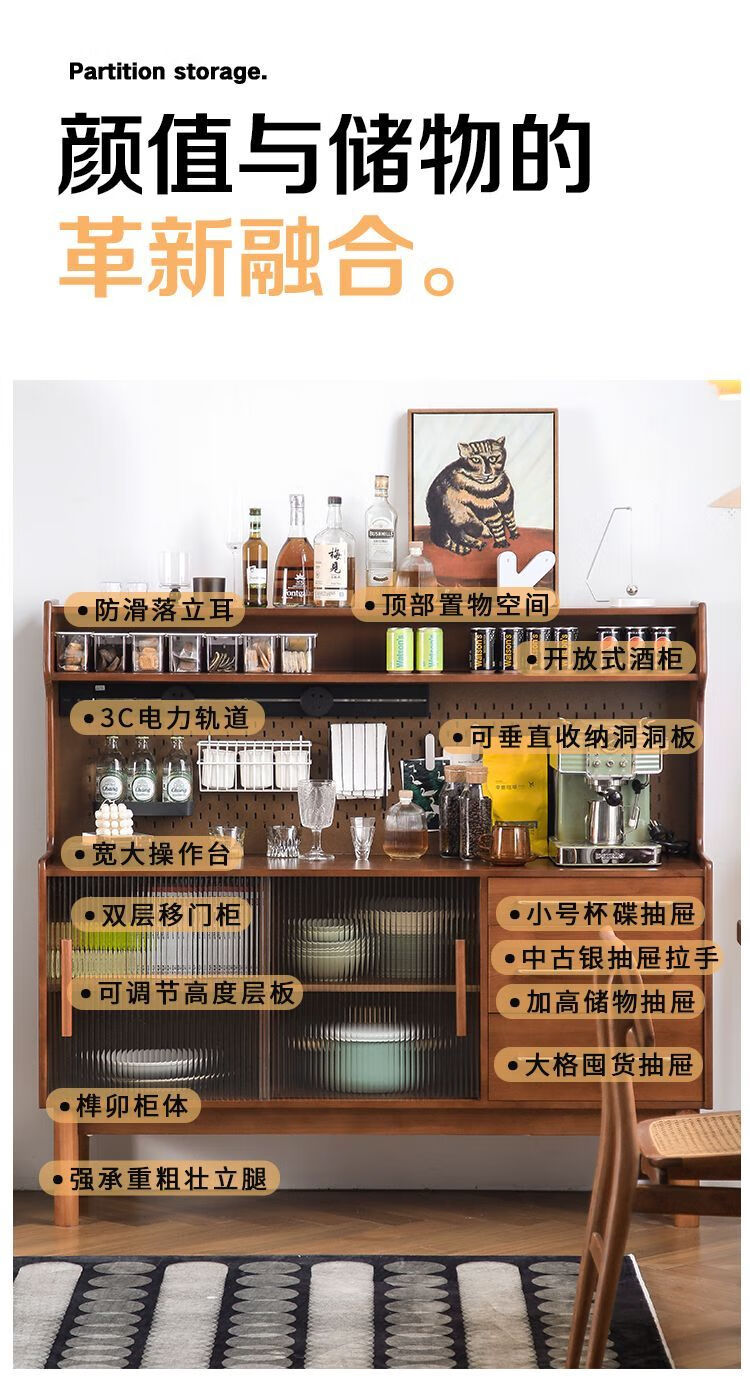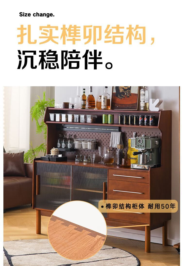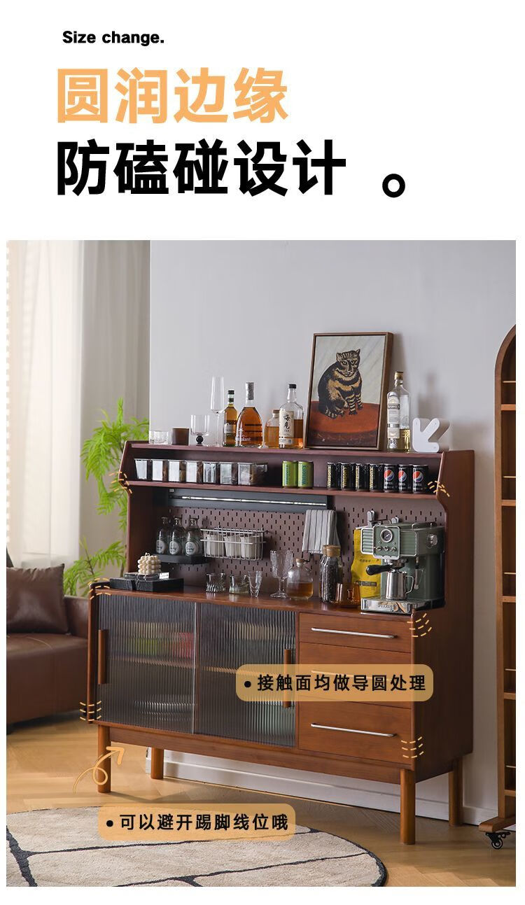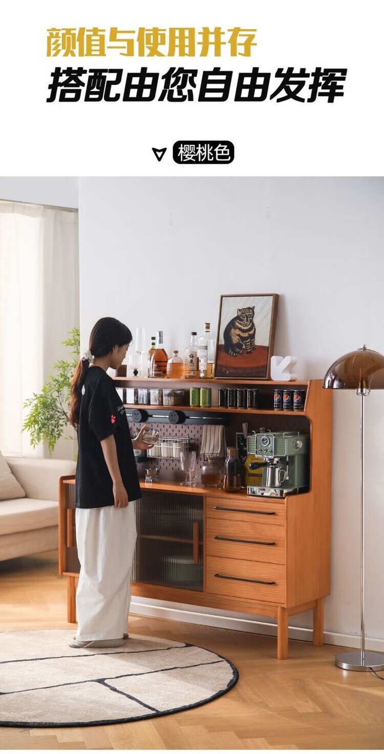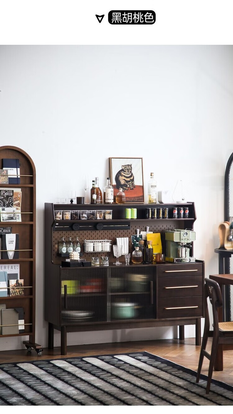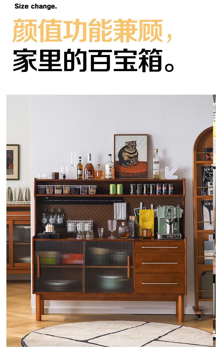 Fu Zhen solid wood sideboard Nordic all-in-one storage wall living room wine cabinet tea multi-function storage cabinet with electric rail 80cm+ hole board style medium antique color