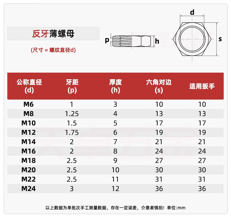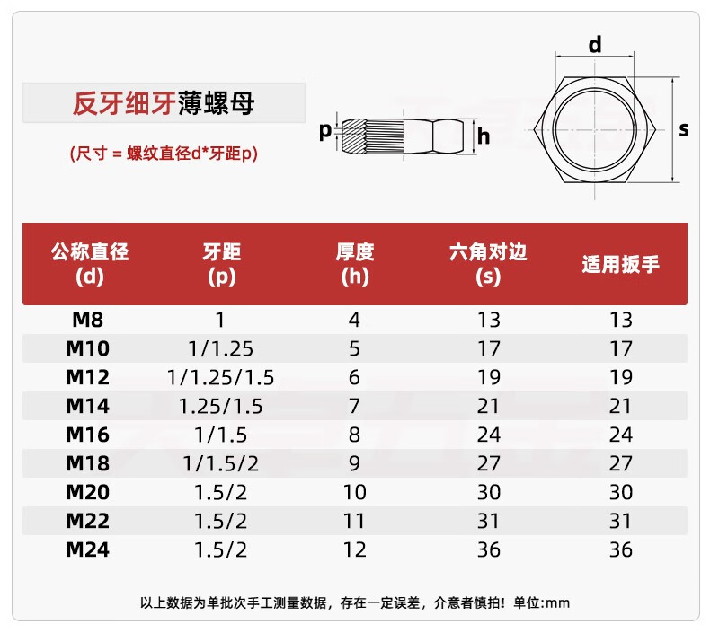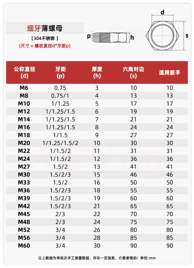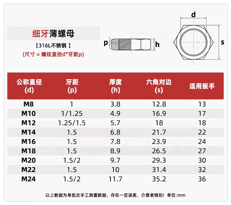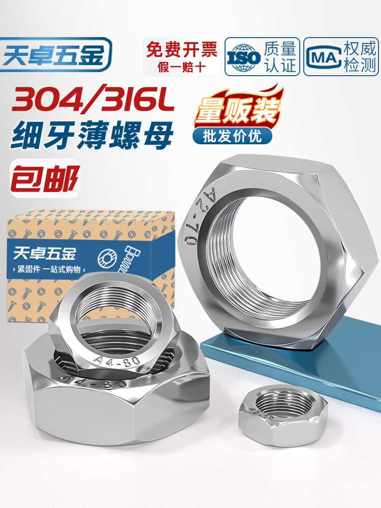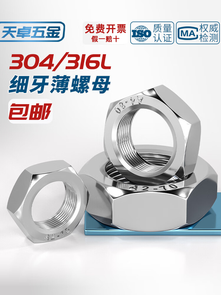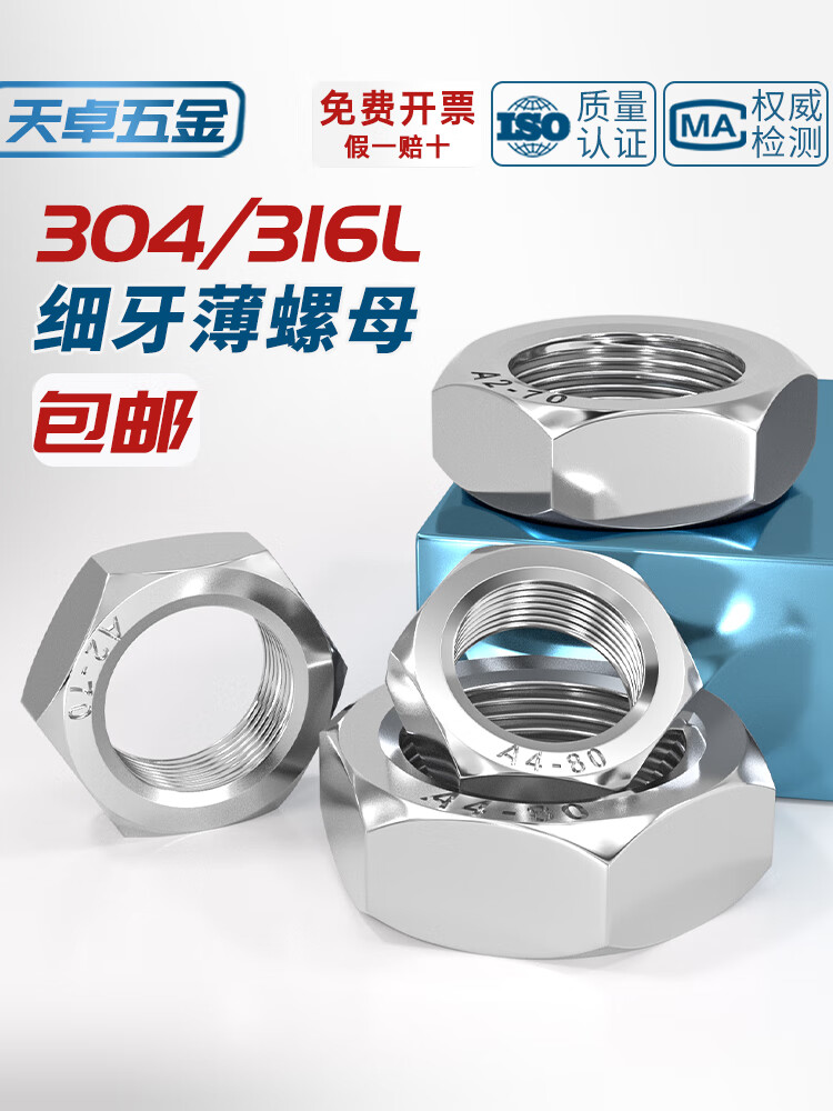 Tianzhuo Hardware 304/316L stainless steel fine thread thin nut hexagonal screw cap M8M10M12M14M16M18 M10*1.25 (thickness 5mm) 30 pieces fine thread reverse thread