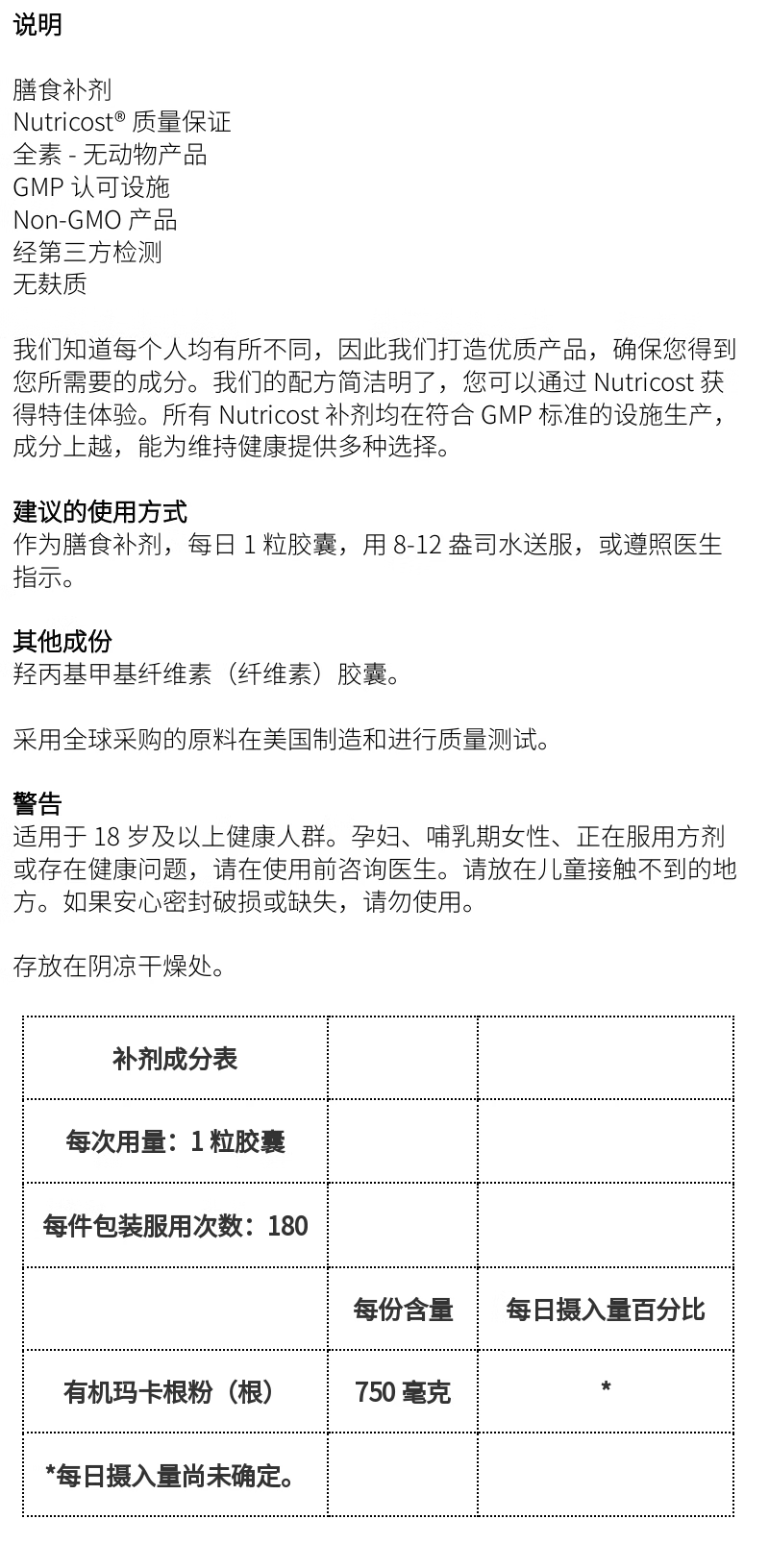 Nutricost USA Nutricost Maca Root organic maca root 750 mg 180 capsules 750 mg 180 capsules
