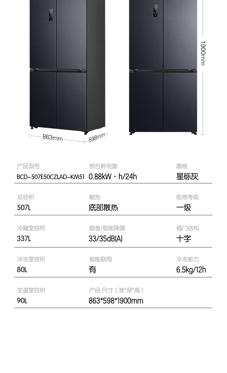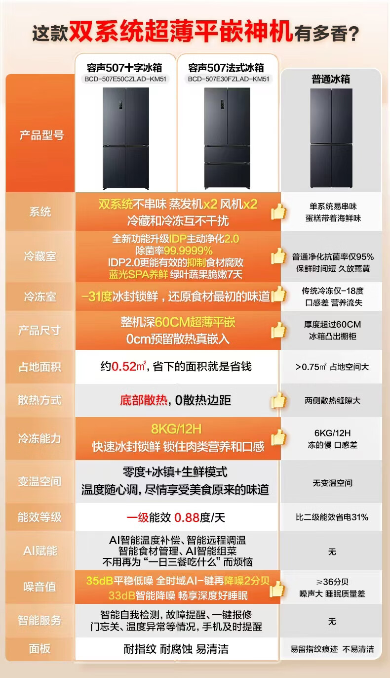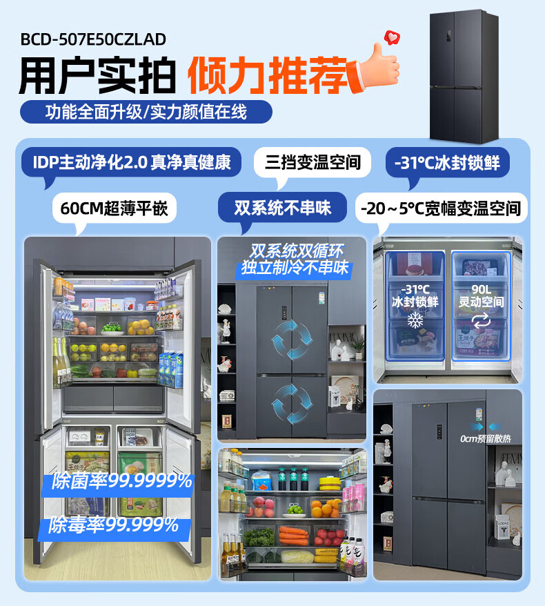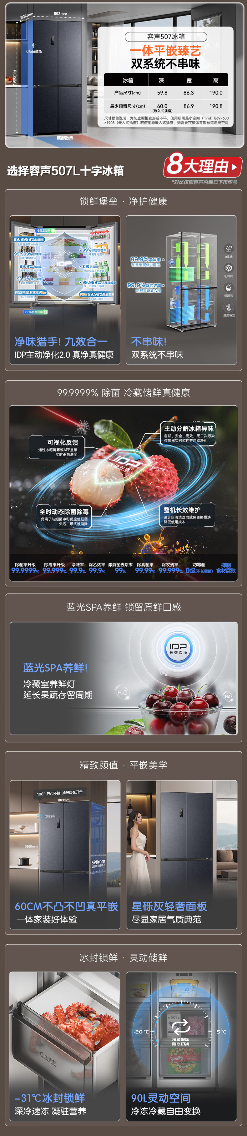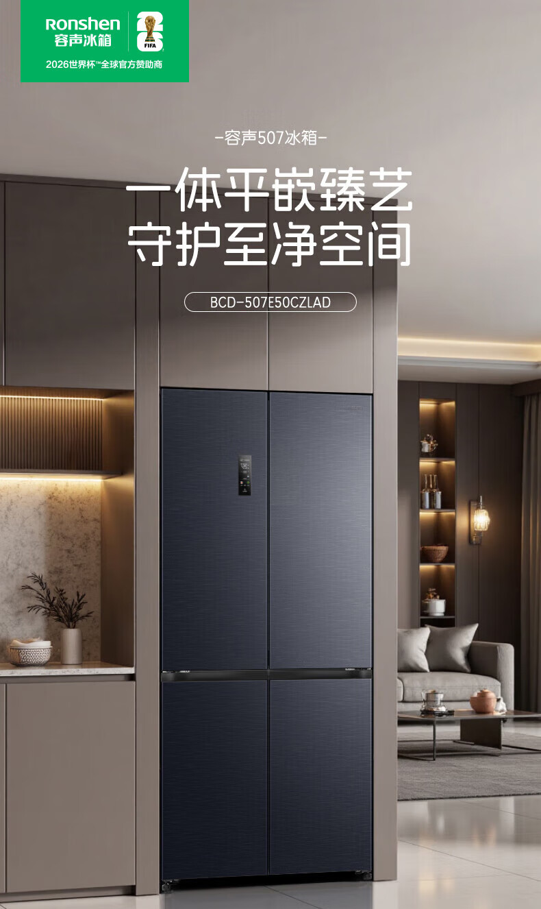 Rongsheng 507-liter IDP2.0 deodorizing dual system cross-fold four-door ultra-thin zero-embedded refrigerator household first-class energy efficiency BCD-507E50CZLAD national subsidy active sterilization | blue light freshness 60cm true zero embedded | bottom heat dissipation
