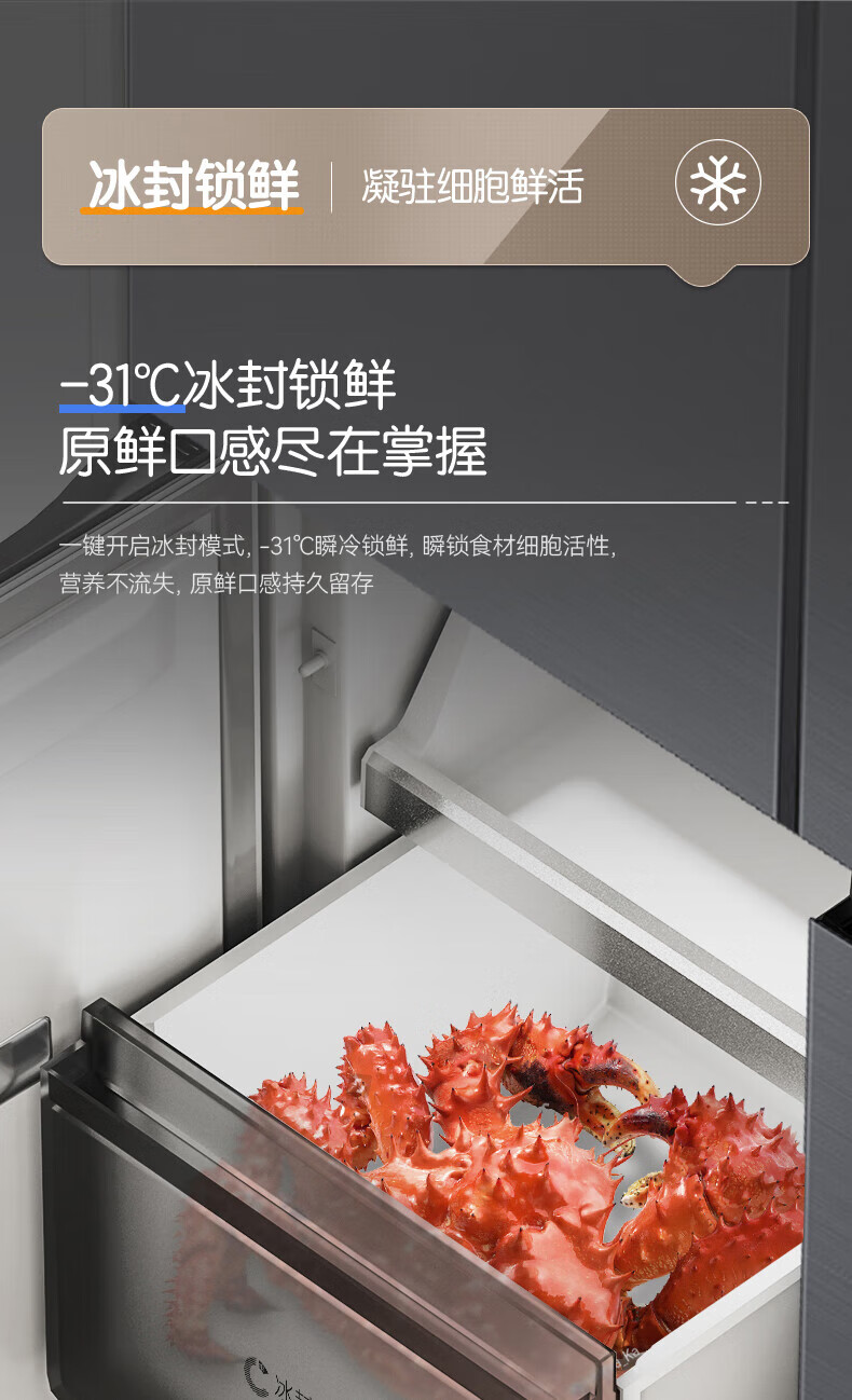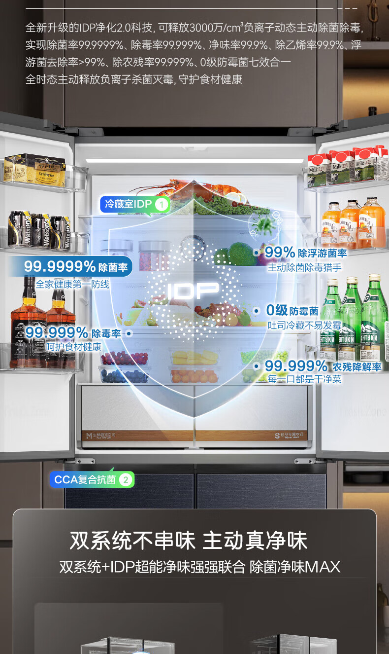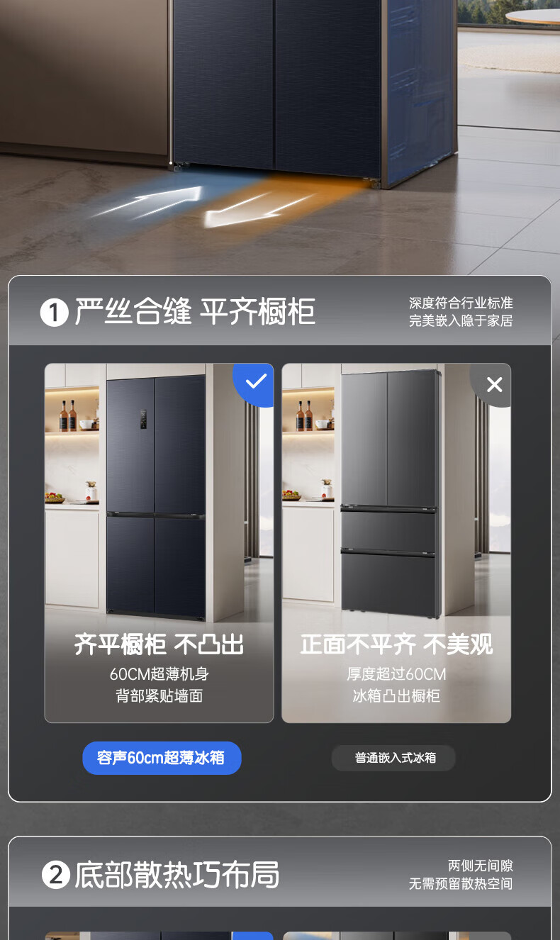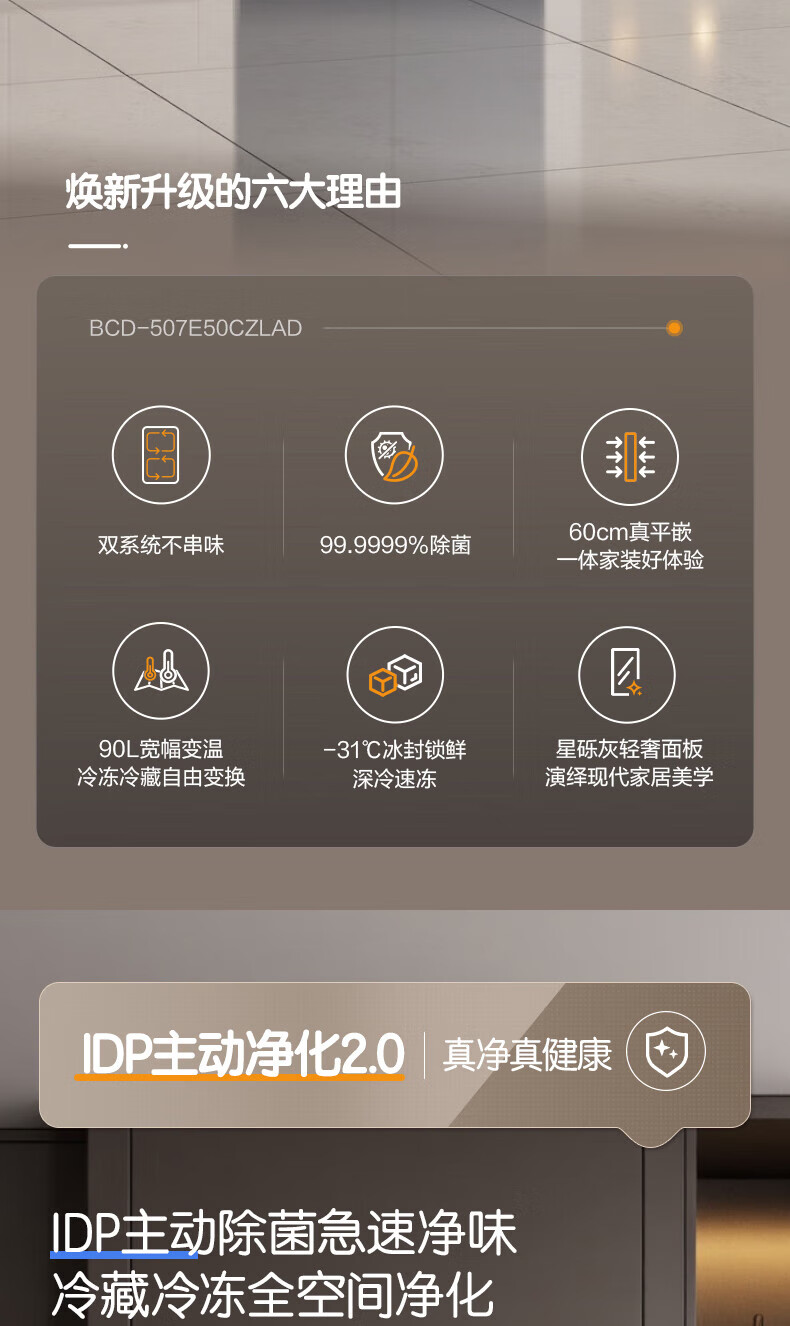 Rongsheng 507-liter IDP2.0 deodorizing dual system cross-fold four-door ultra-thin zero-embedded refrigerator household first-class energy efficiency BCD-507E50CZLAD national subsidy active sterilization | blue light freshness 60cm true zero embedded | bottom heat dissipation