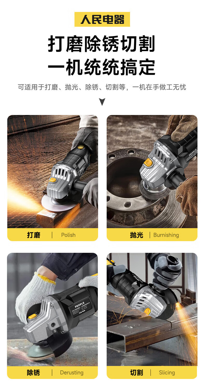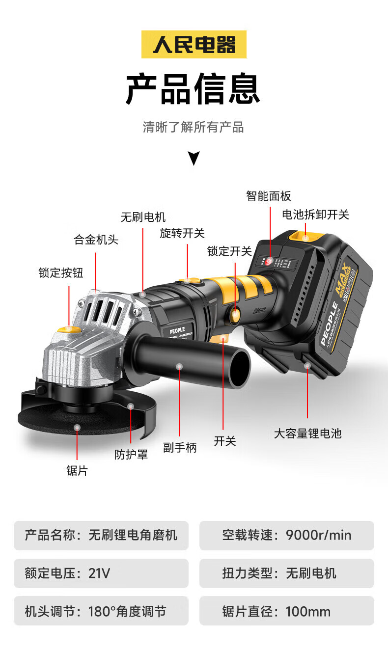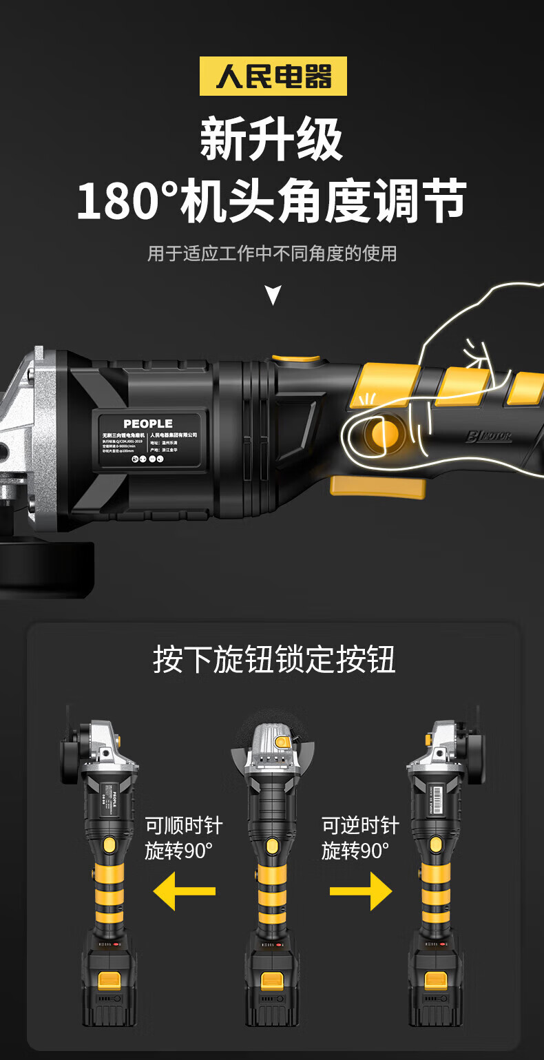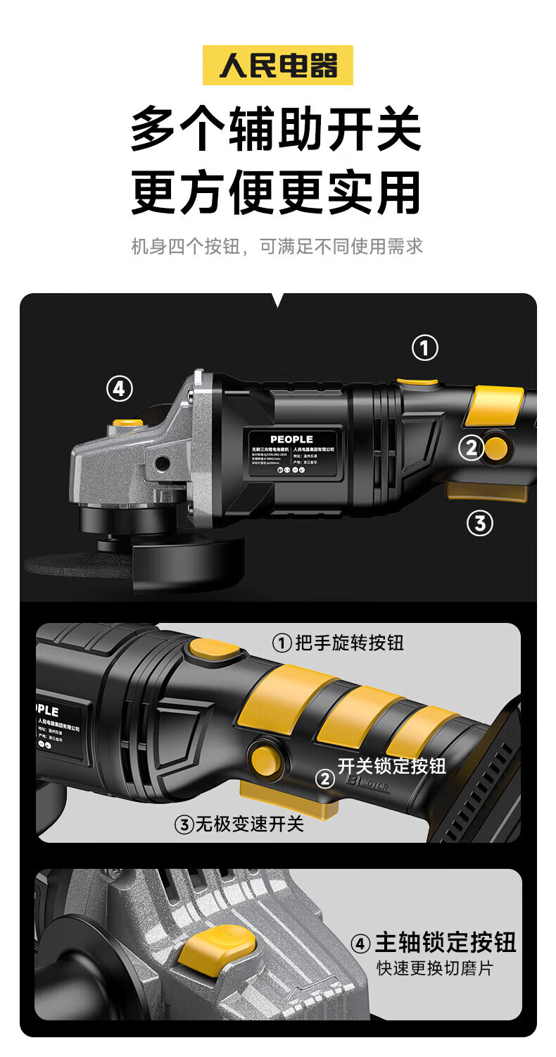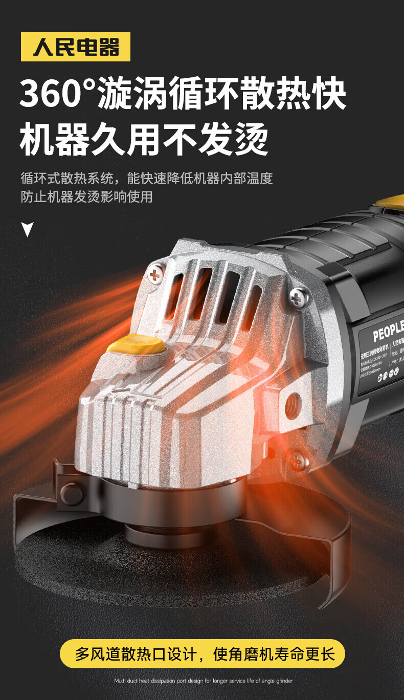 People's Electric Angle Grinder Brushless Lithium Electric Polishing and Grinder Rechargeable Multi-Function Cutting Machine Angle Grinder Set 4.0Ah 1 Battery 1 Charge