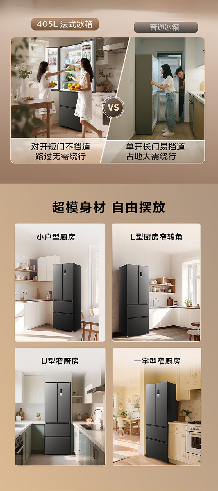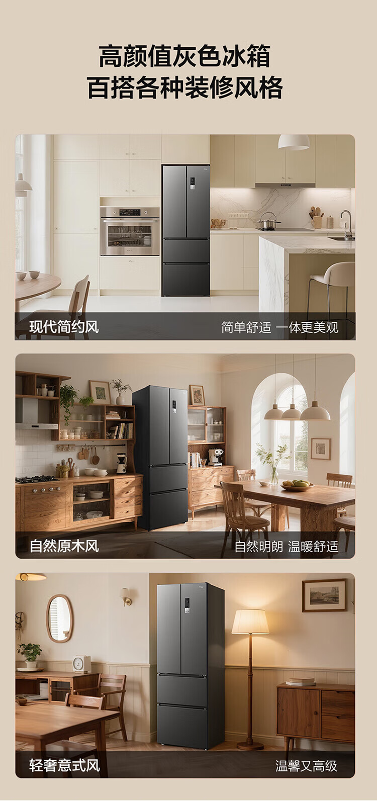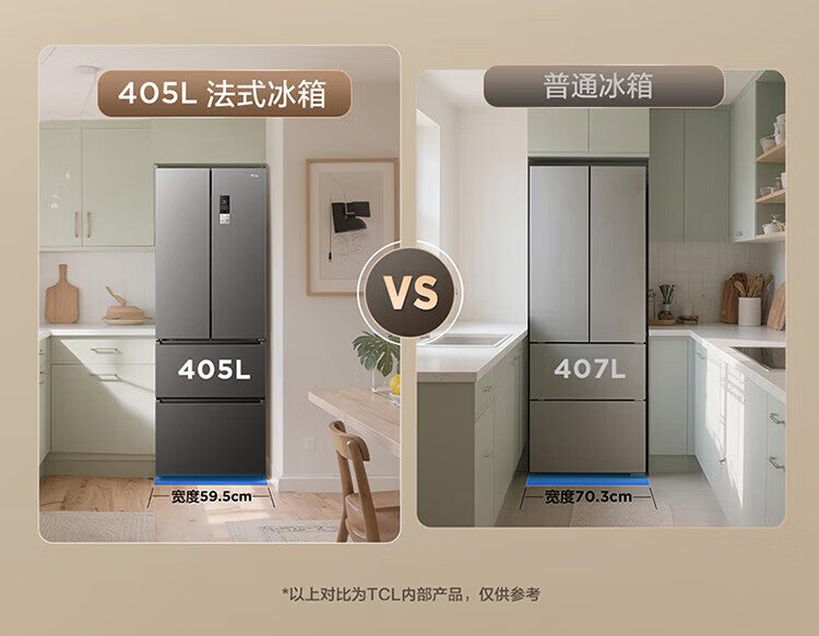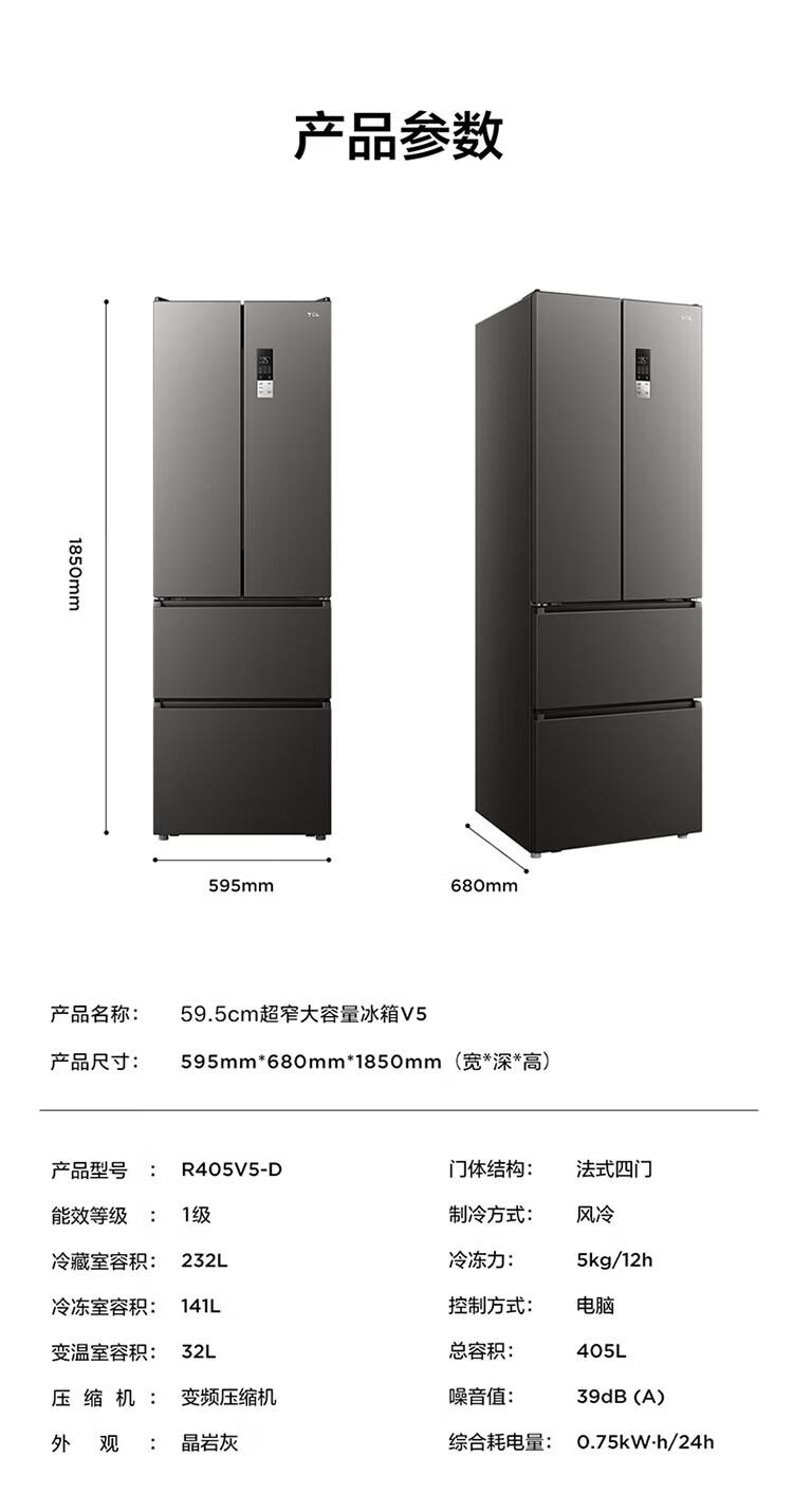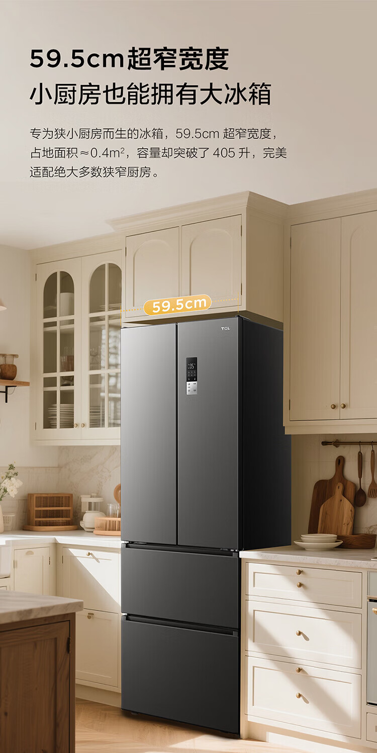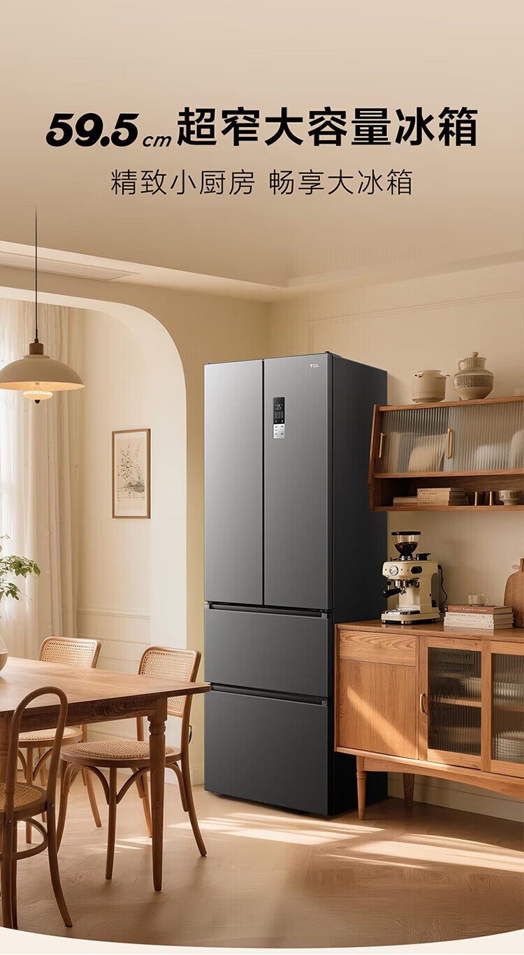 TCL 405 liter French multi-door four-door 59.5cm ultra-narrow large capacity small apartment household refrigerator first-class energy efficiency trade-in R405V5-D crystal ash gray national subsidy