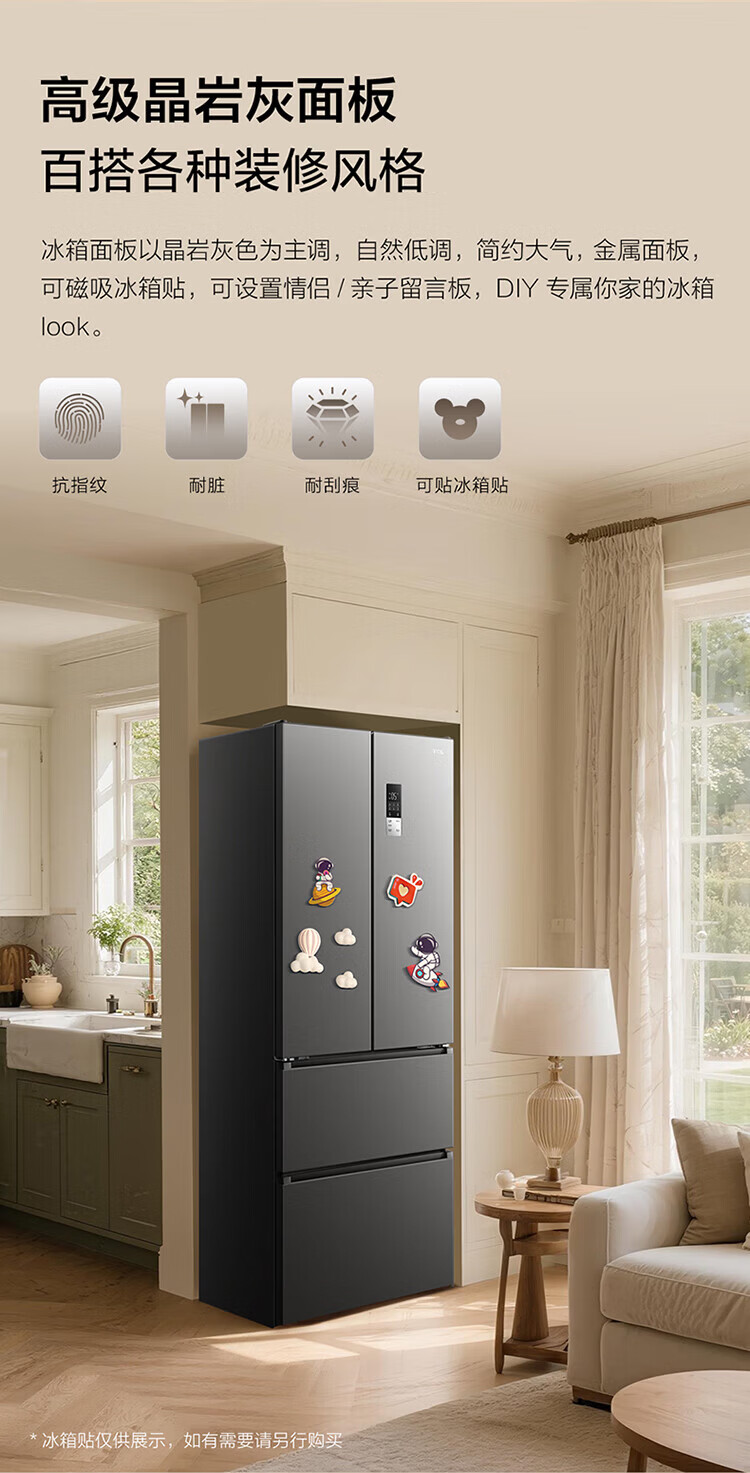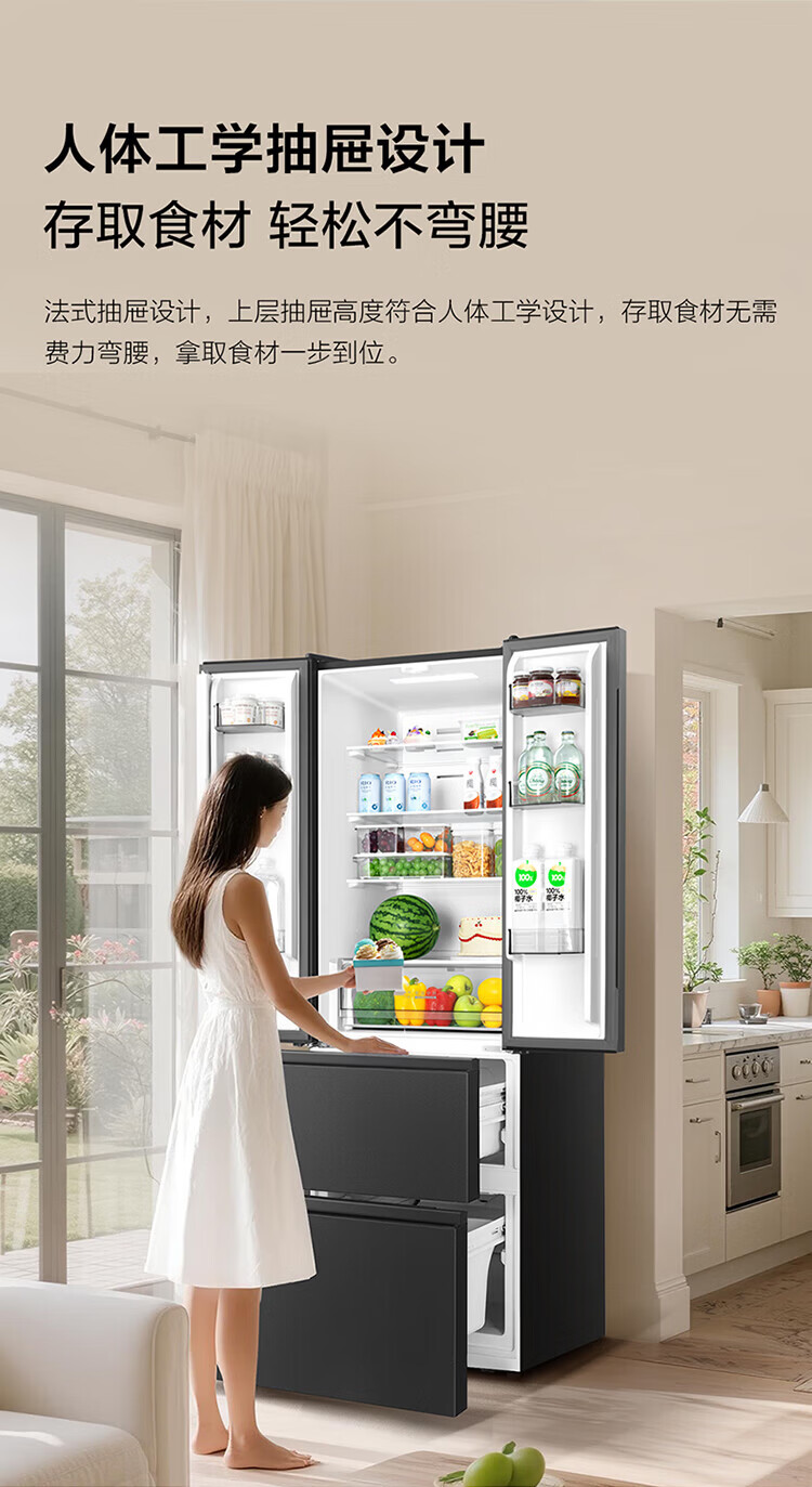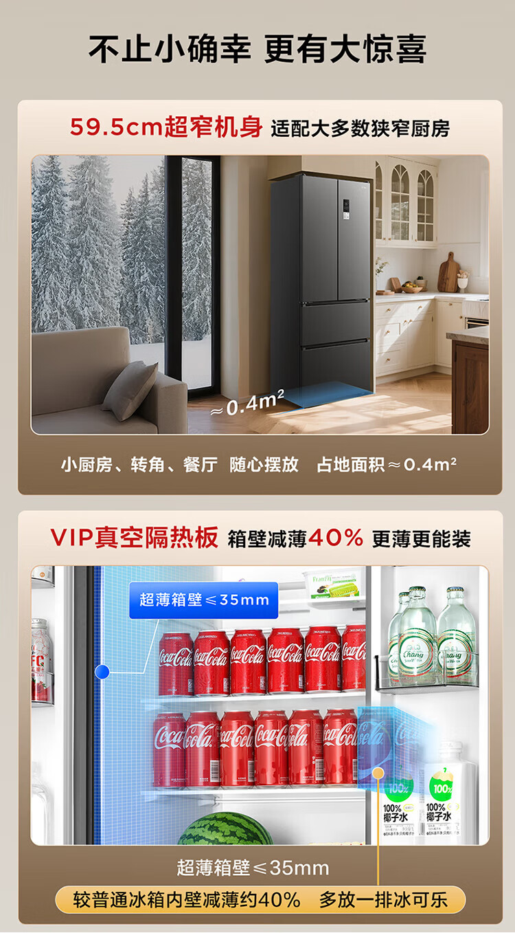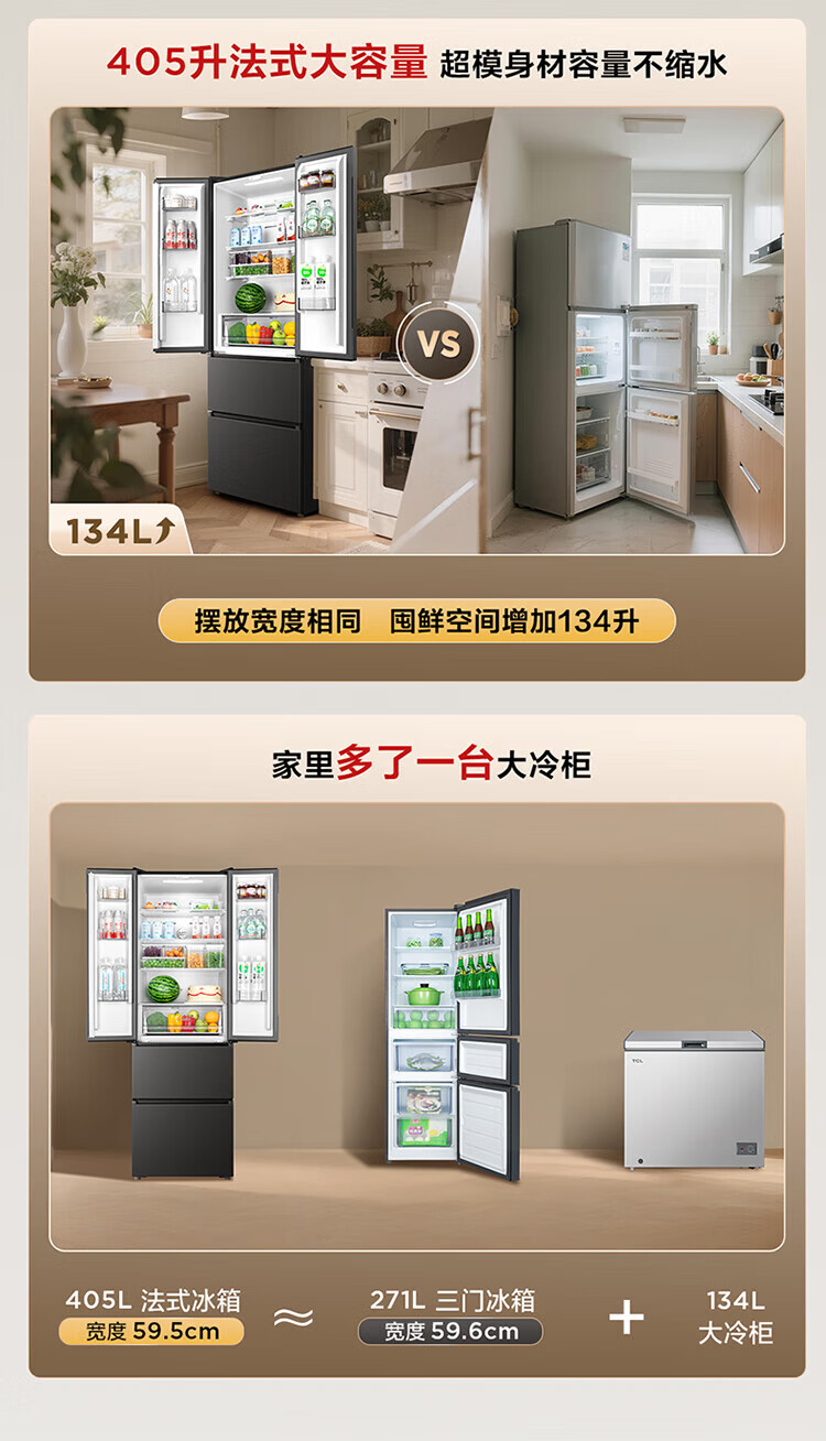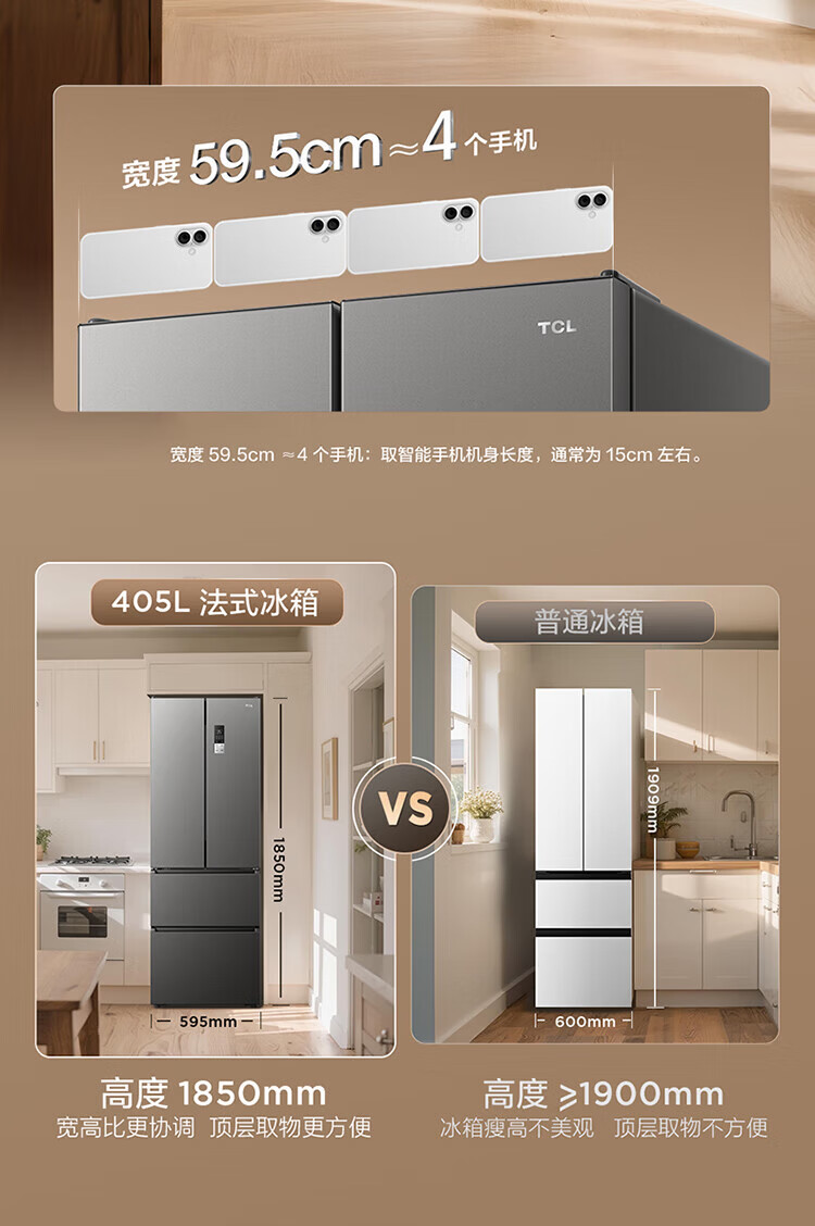 TCL 405 liter French multi-door four-door 59.5cm ultra-narrow large capacity small apartment household refrigerator first-class energy efficiency trade-in R405V5-D crystal ash gray national subsidy