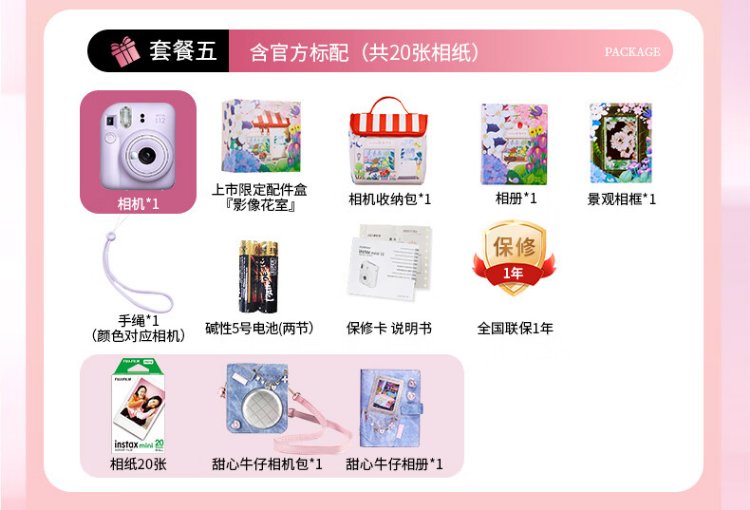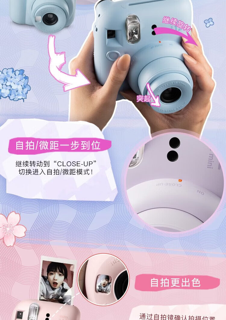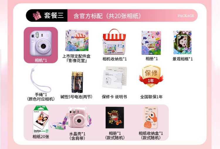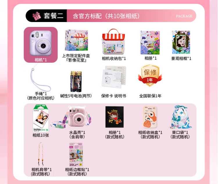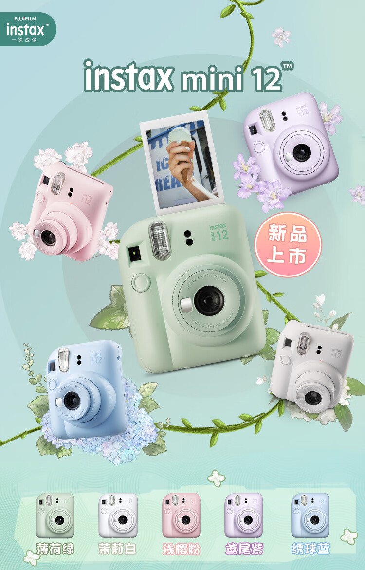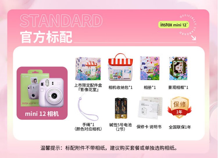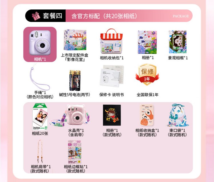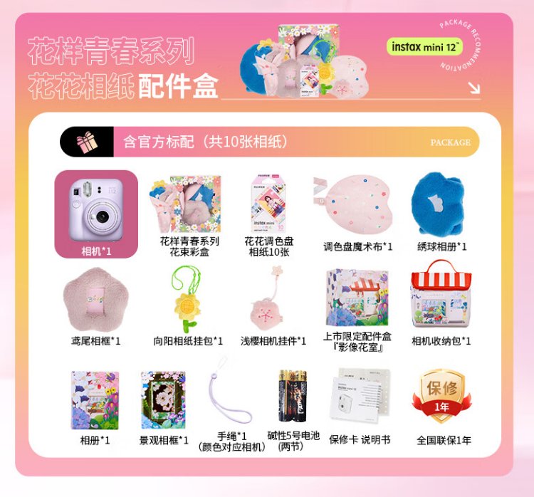 Fuji (FUJIFILM) mini 12 comes with a beauty instant camera package including photo paper, mini 7+/se/9/11/25/90/99 film camera upgraded version, Chinese Valentine's Day gift, hydrangea blue, image flower room set, package 1, standard + 10 pieces of photo paper + crystal case + basic version gift pack
