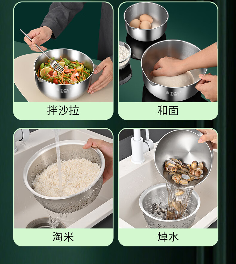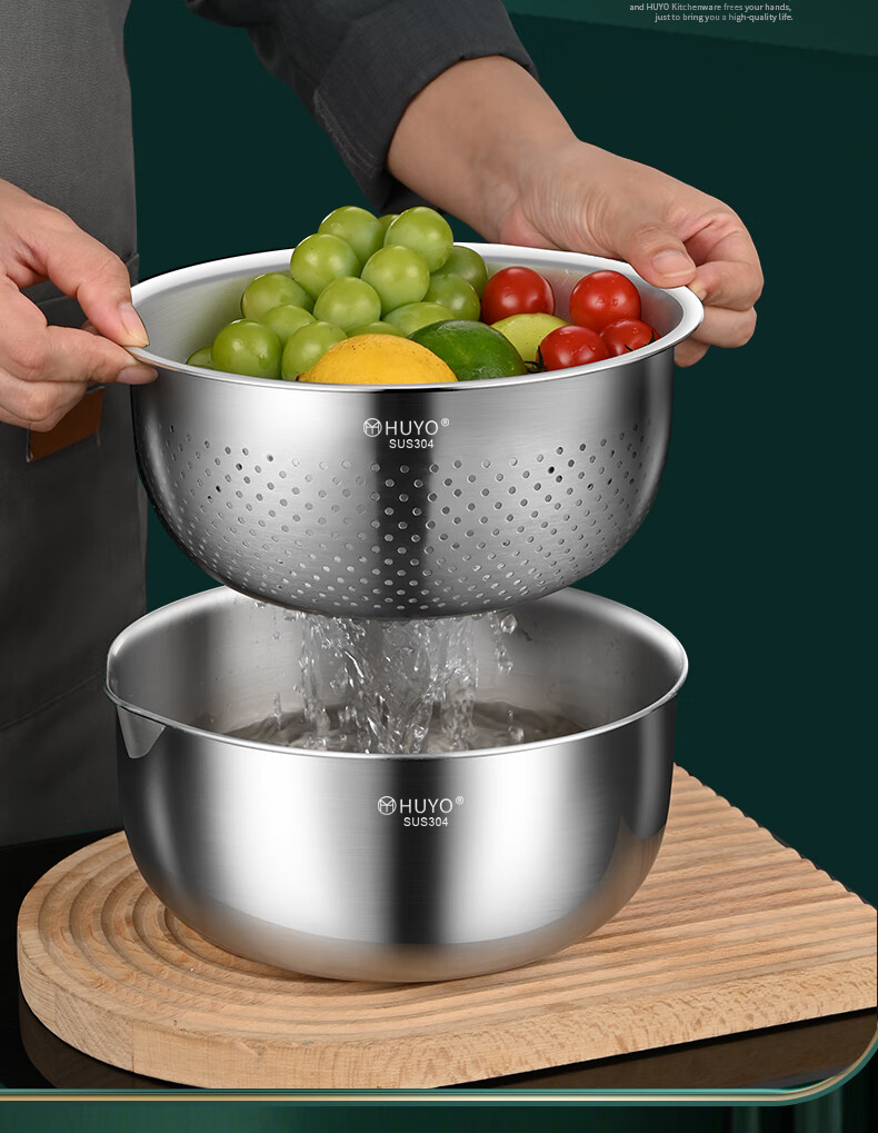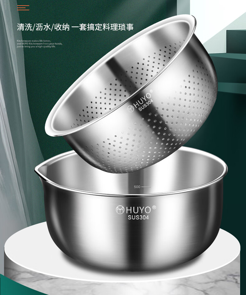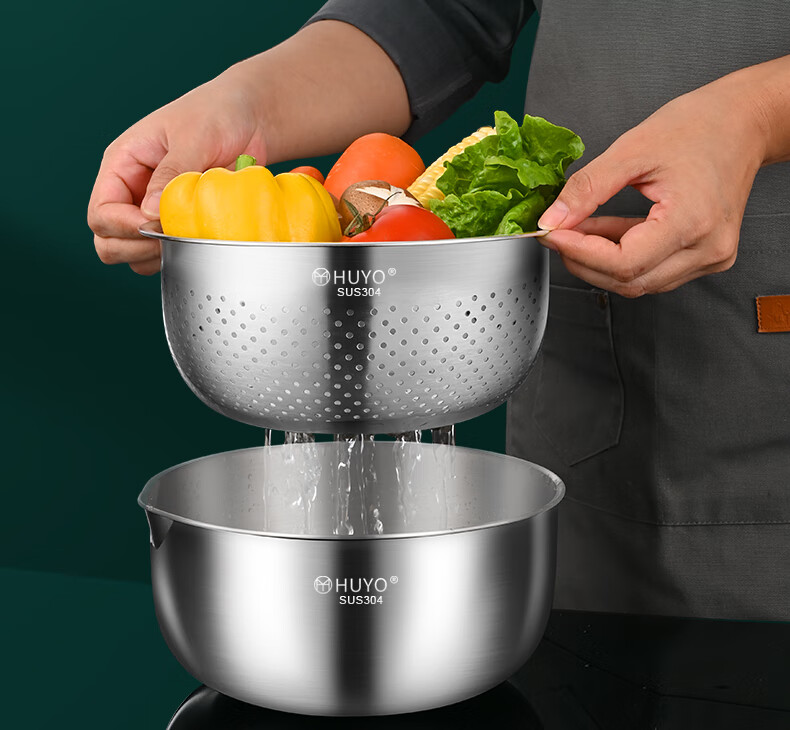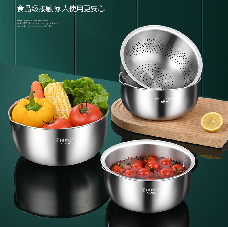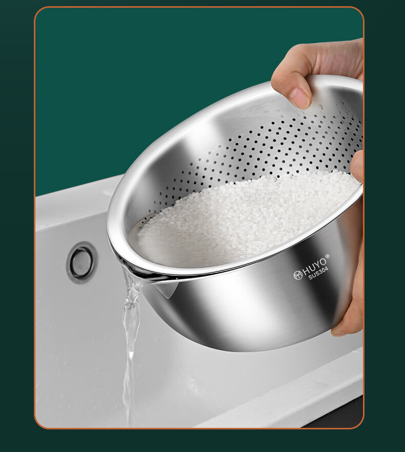 HUYO304 stainless steel sink drain basket household rice washing sieve drain basin set kitchen salad egg beater and basin set 21cm sink + water filter basin