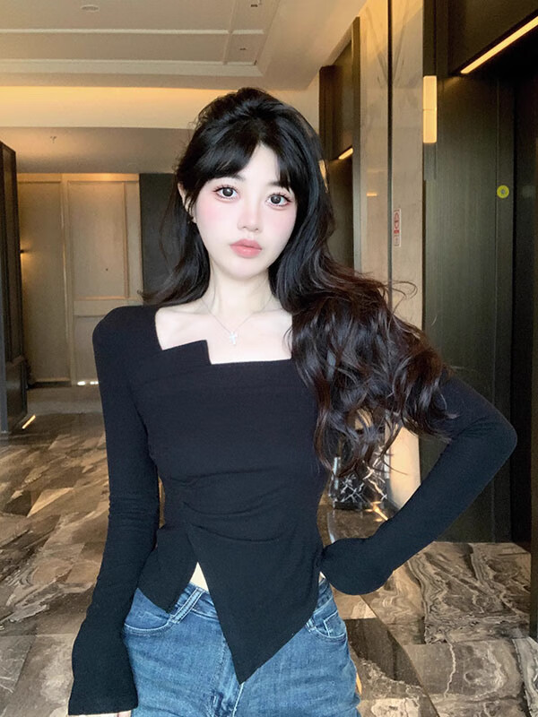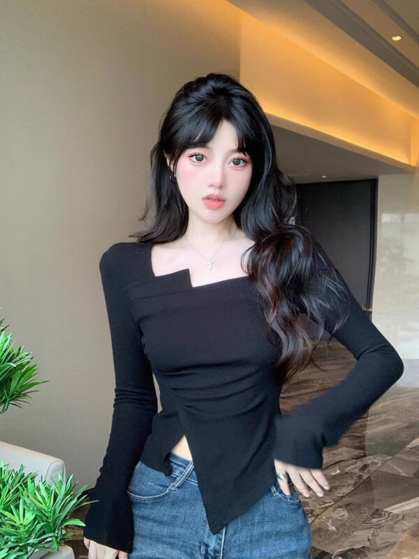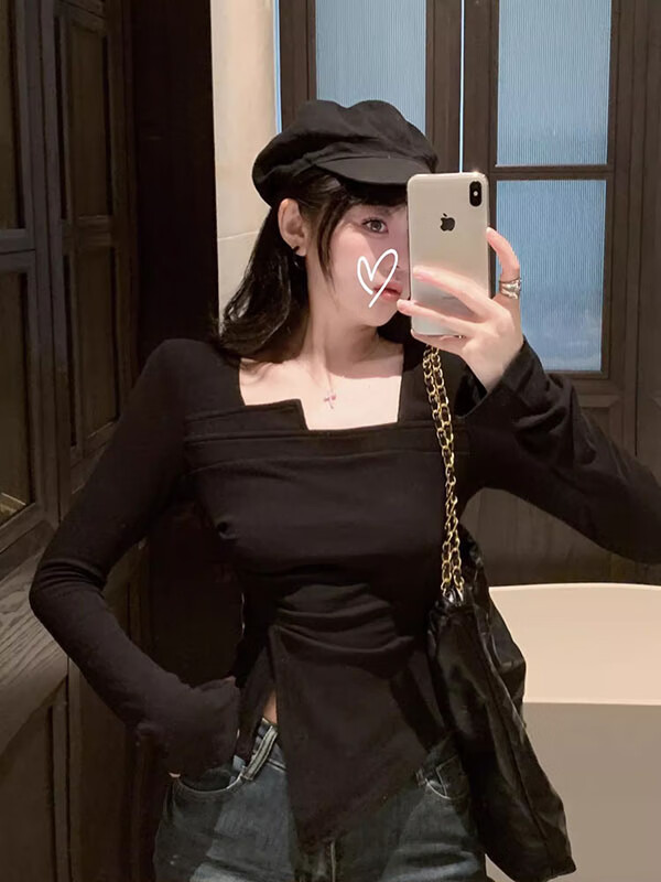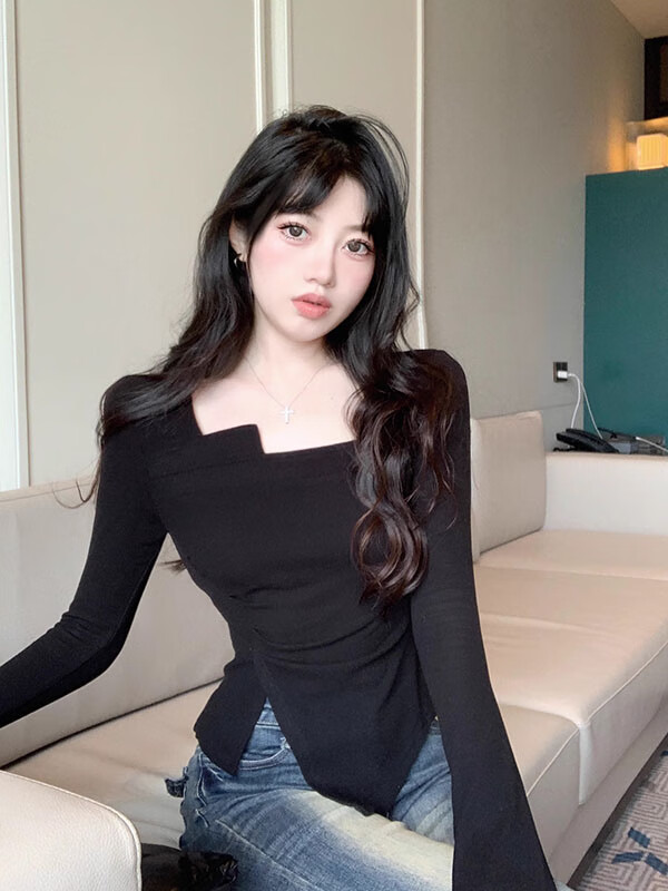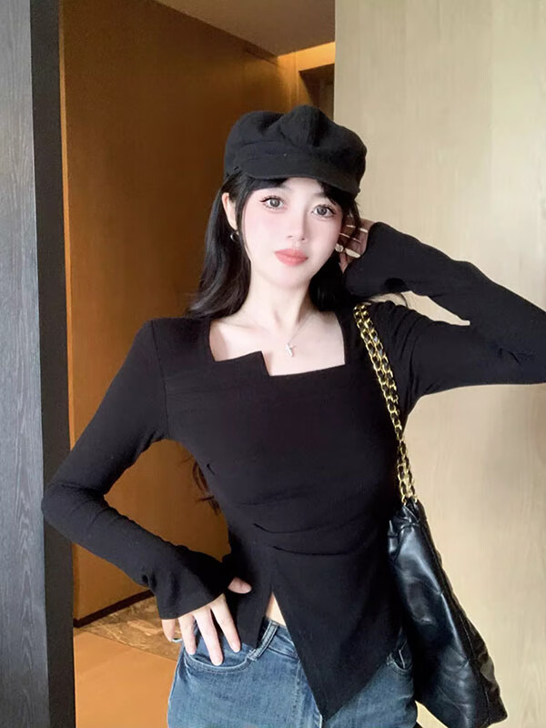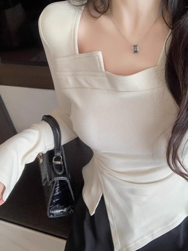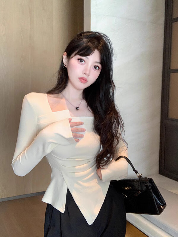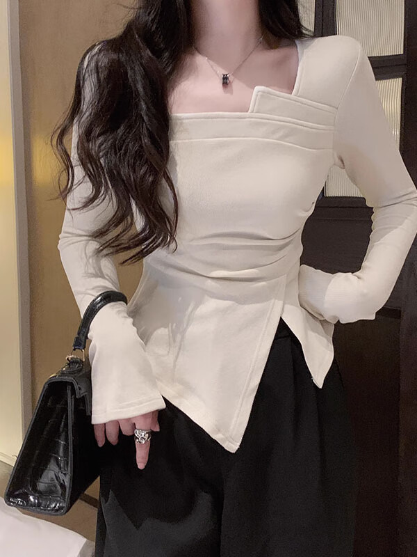 Hong Kong style high-end Royal Sister square collar long-sleeved T-shirt for women autumn slit design slim irregular pleated top XXC apricot German velvet high-quality fabric S 70-90 catties