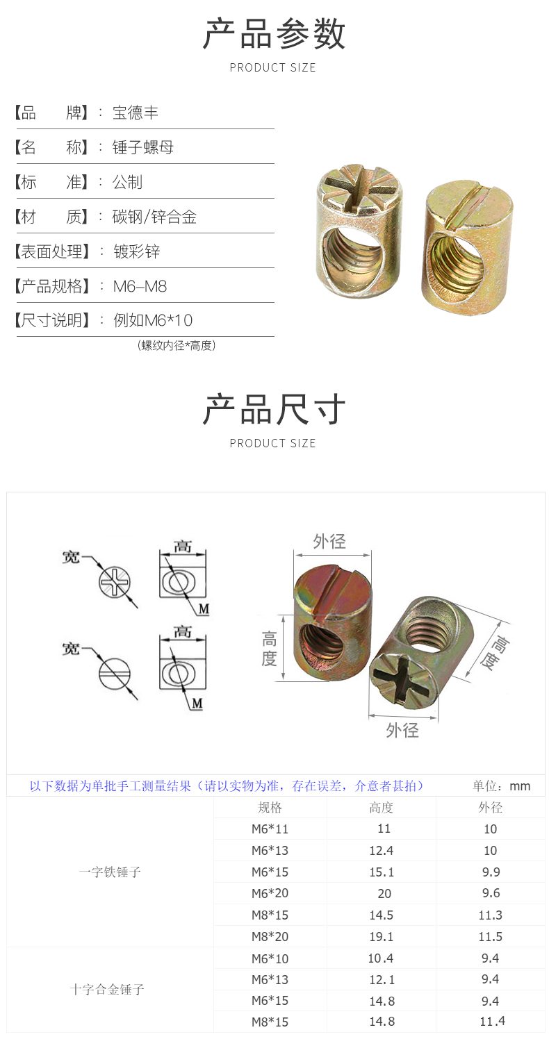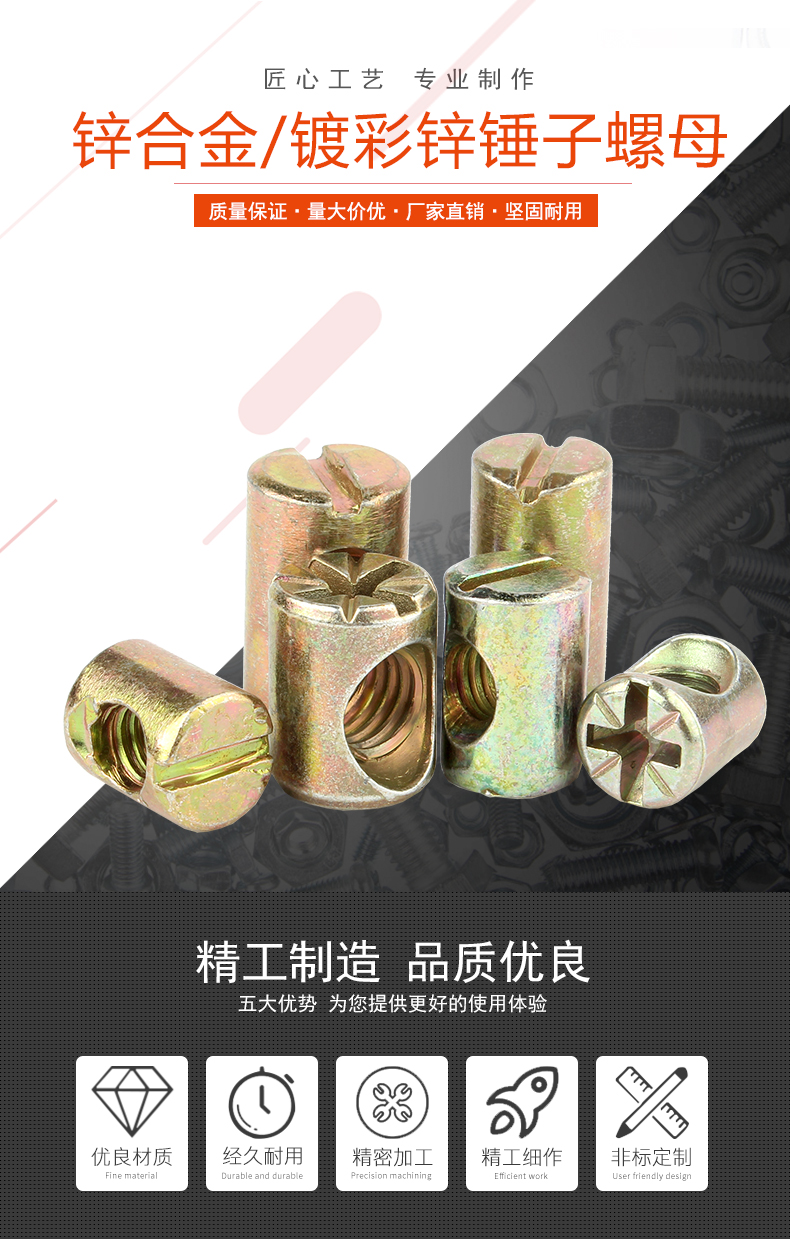 Baodefeng Hammer Nut Hammer Head Nut Furniture Two-in-One Connector Collection Yuanzhu Hammer Nut Embedded Screw Cap One-word Colored Zinc Hammer Nut M6x11 10 pieces