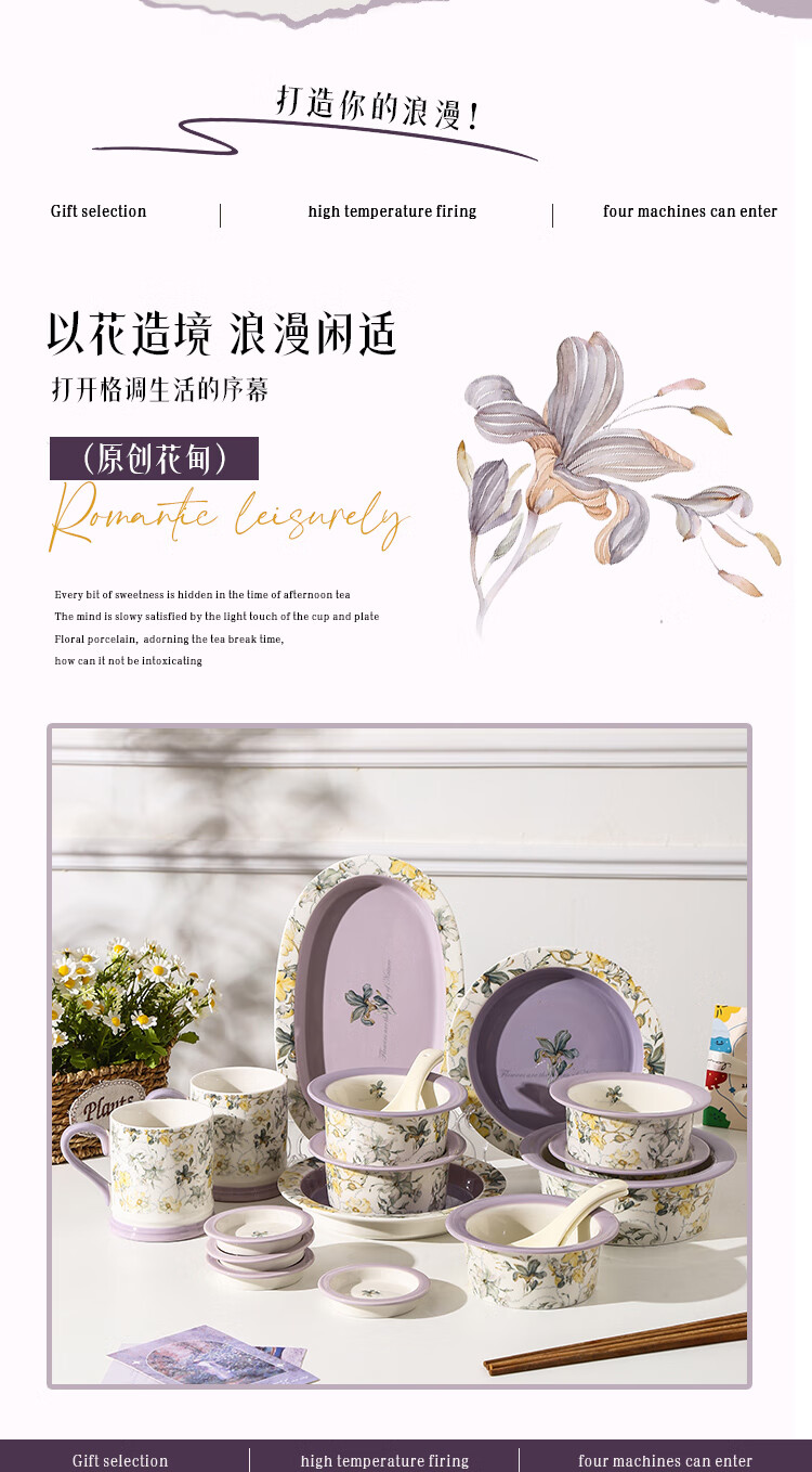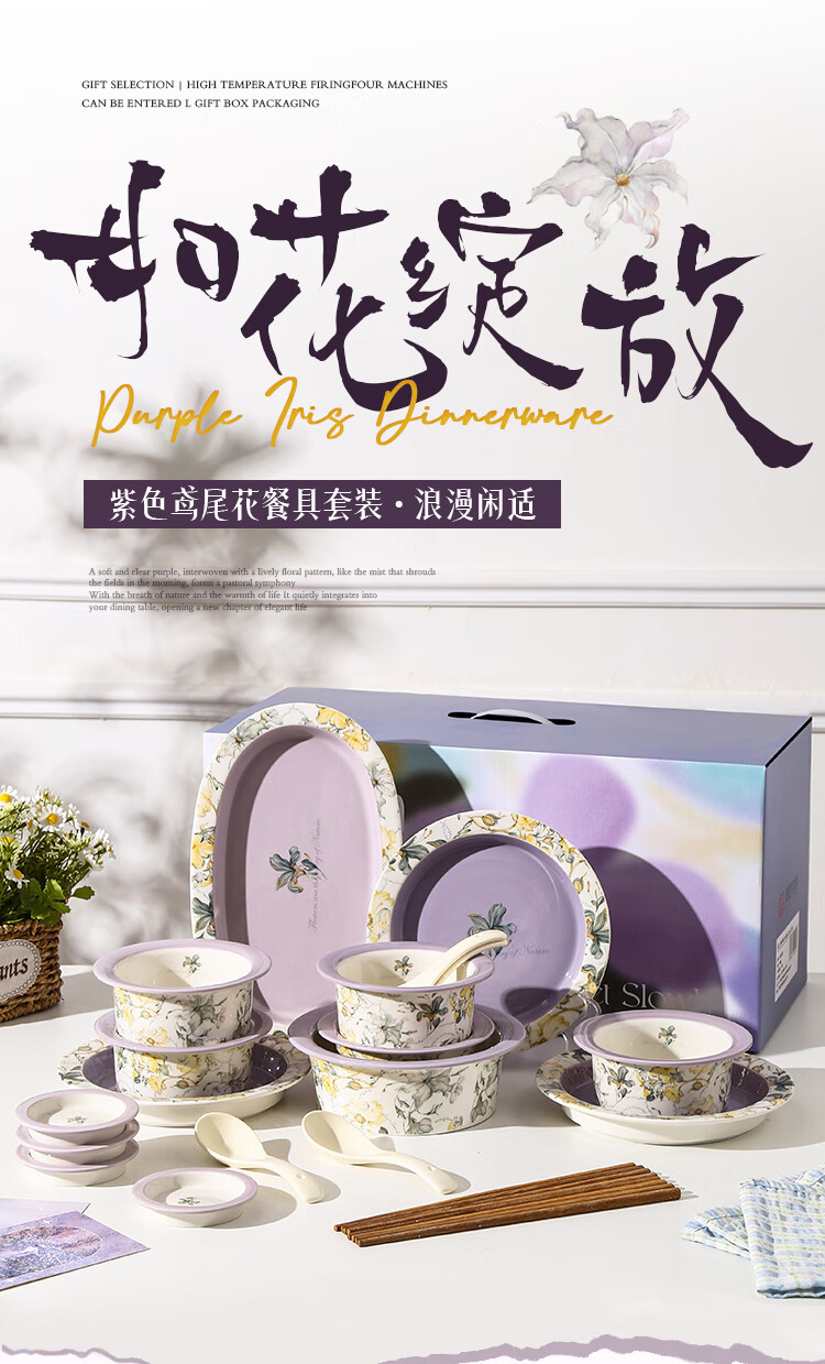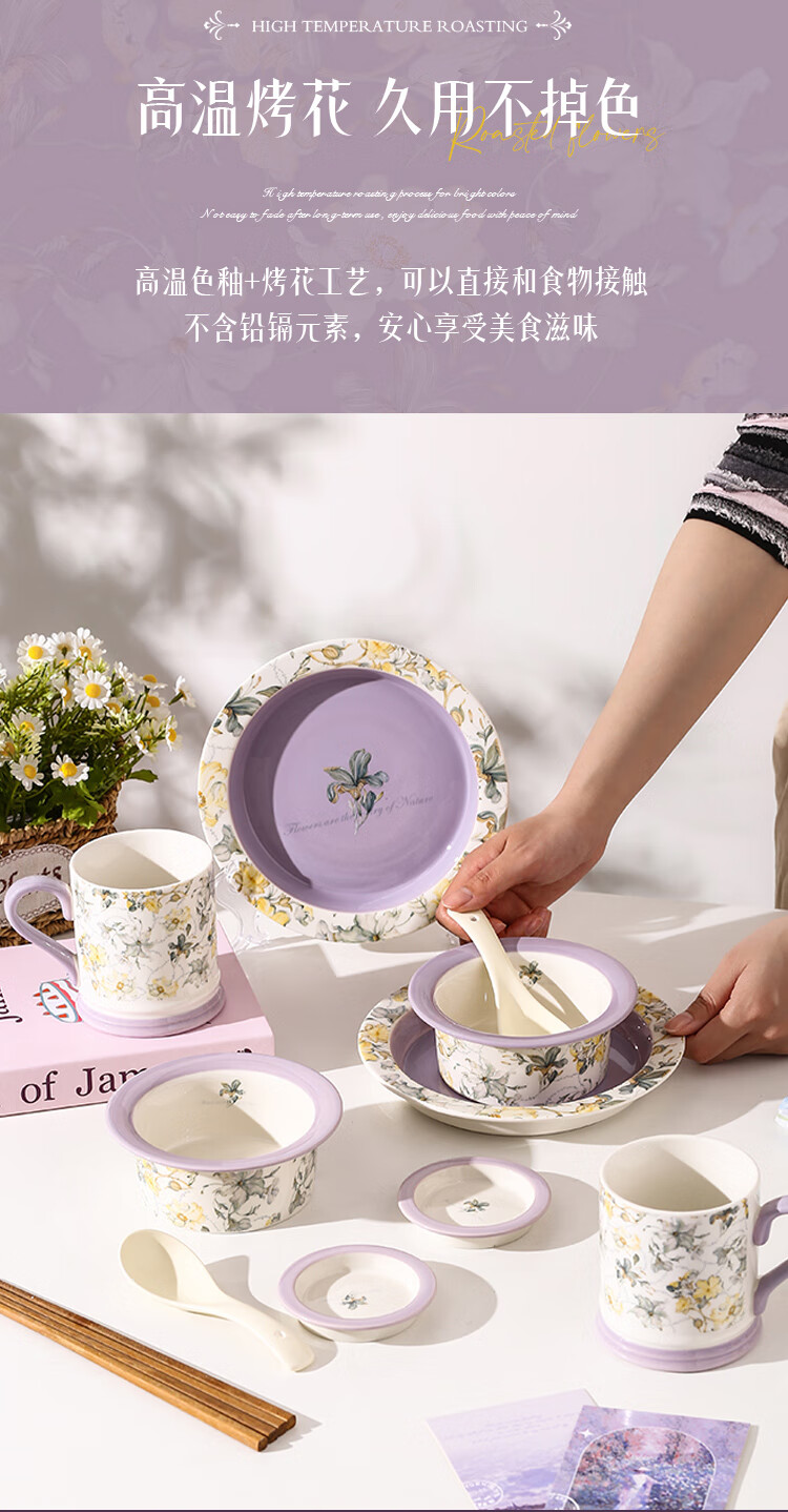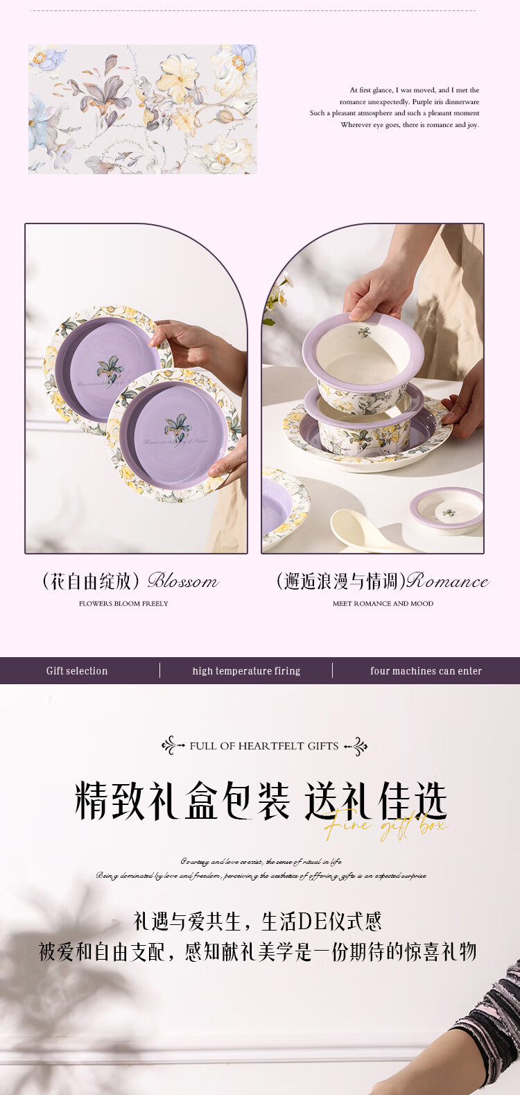 Xiderun underglaze colored iris flower bowl and plate set for home move-in, new home bowl and plate, wedding gift tableware, chopsticks and bowls gift box, 6-piece set for one person - iris flower