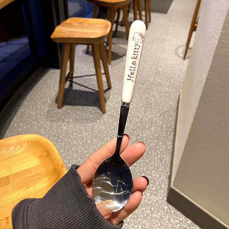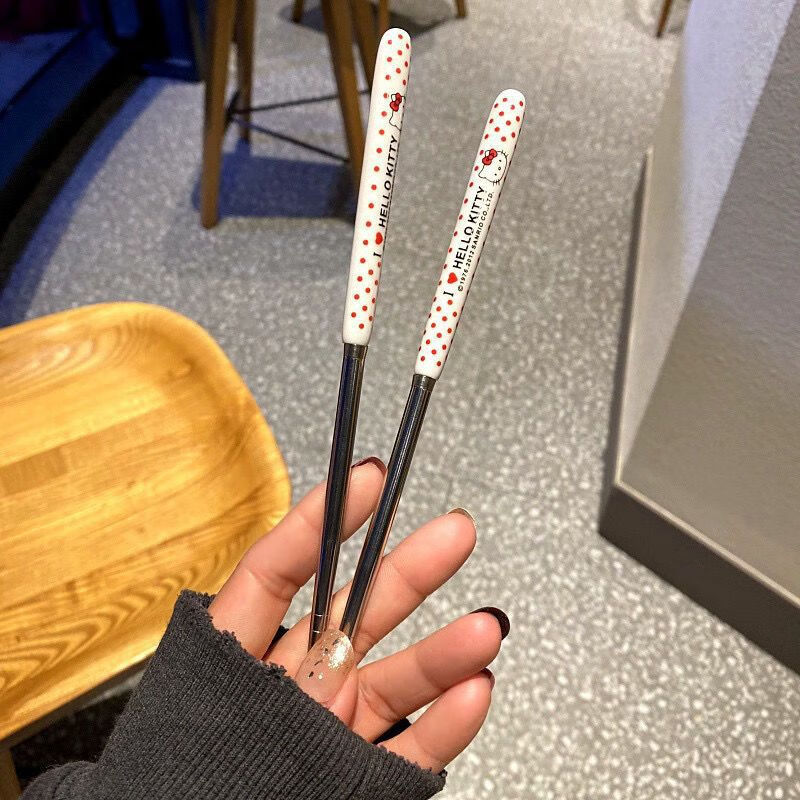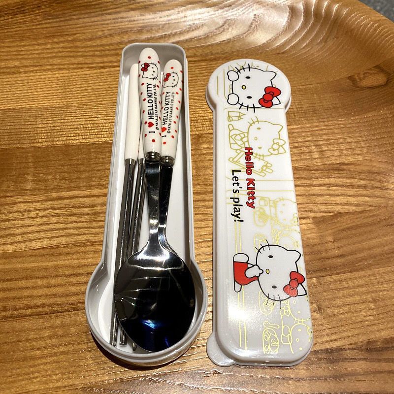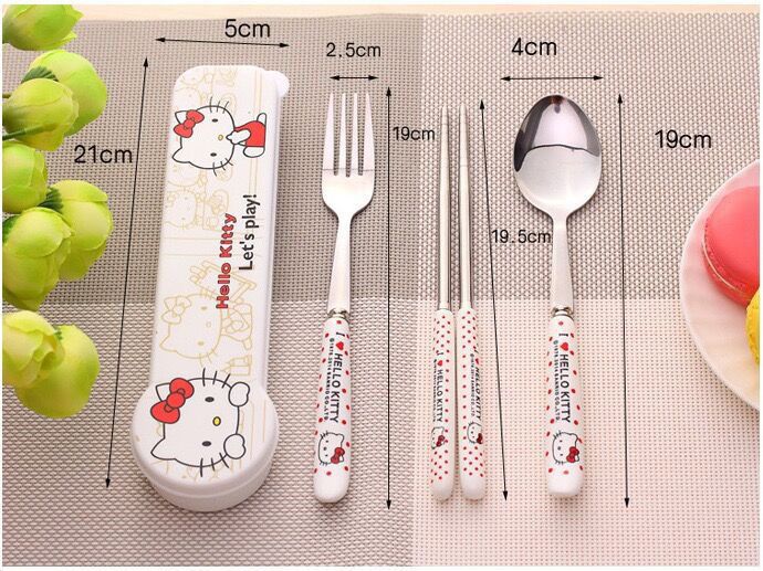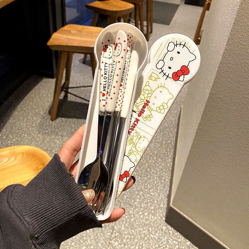 Complete Hello Kitty tableware set, stainless steel fork and spoon, student plastic handle, Hello Kitty chopsticks, KT cat spoon + chopsticks + fork (free box)