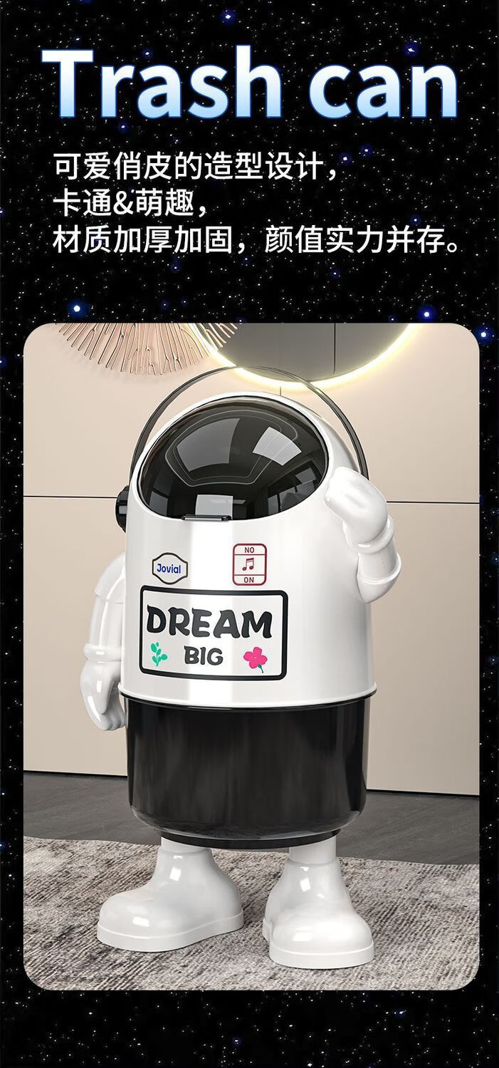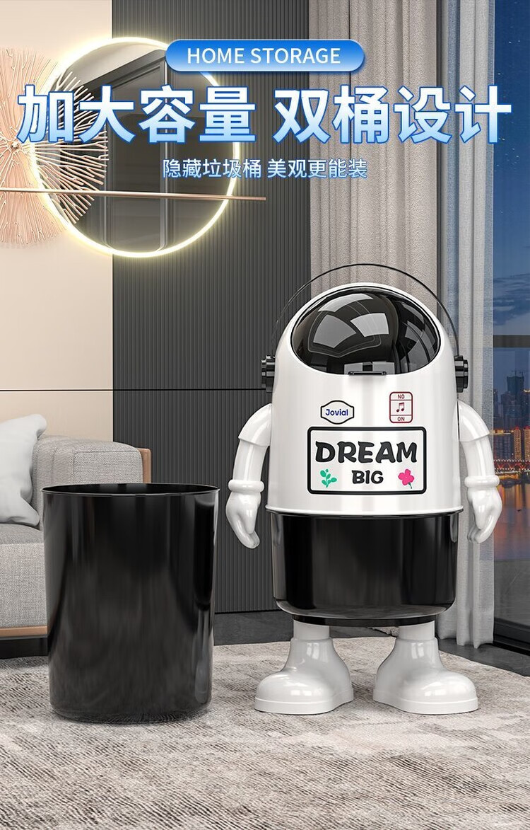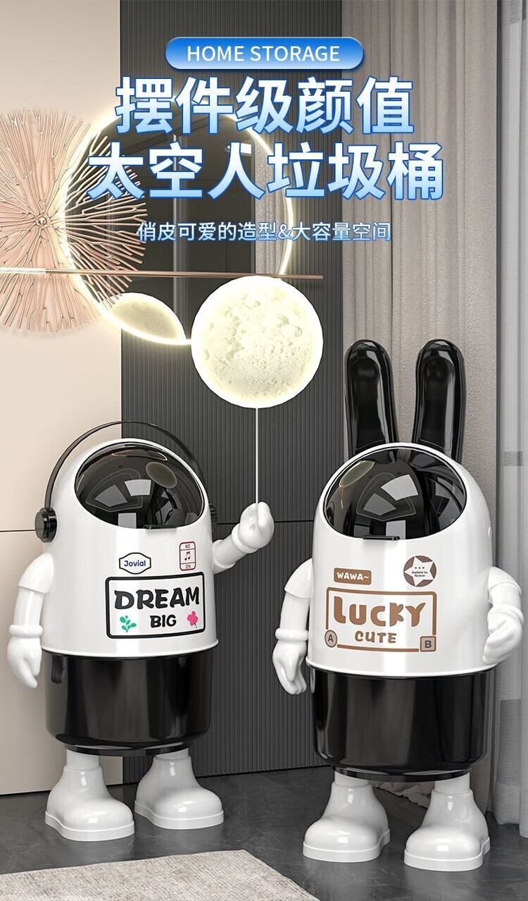 Large size trash can for home use 2025 new style living room, bedroom, bathroom, creative kitchen, cute, good-looking, large-capacity wastebasket, Astronaut-Dream-Black and white color combination, inner and outer double buckets