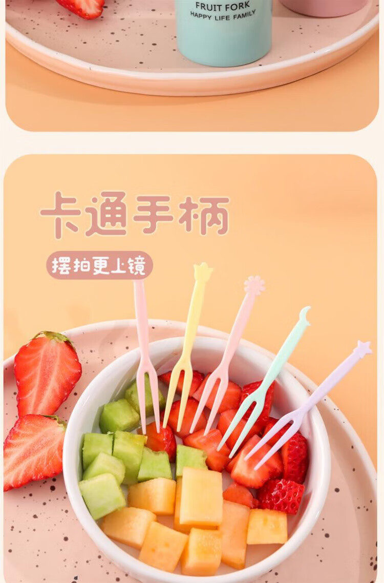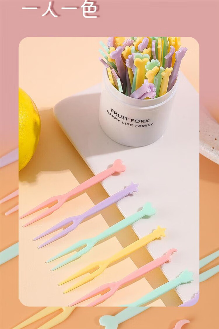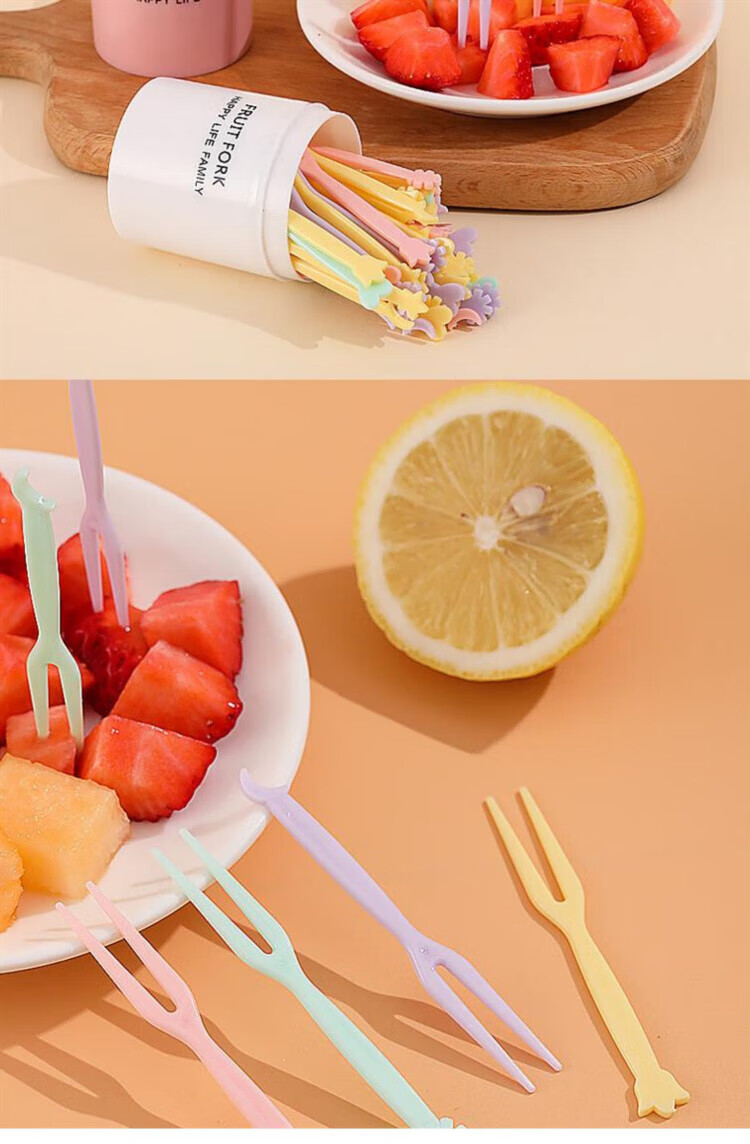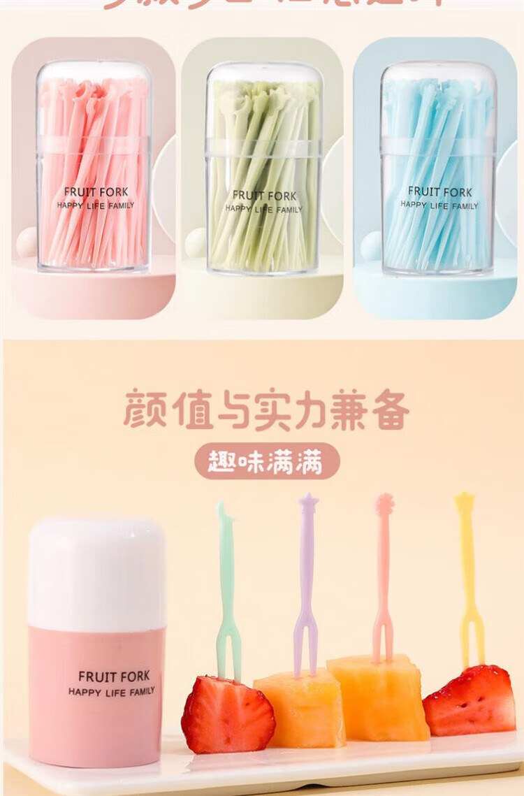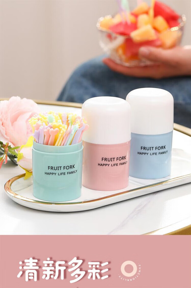 Qingchen Fruit Fork Set Fruit Pick Disposable Plastic Two-Tine Household Fruit Cake Dessert Fork Dessert Small Fork Grass Green + Ocean Blue + Cherry Blossom Pink - Mixed Color 3 Bottles