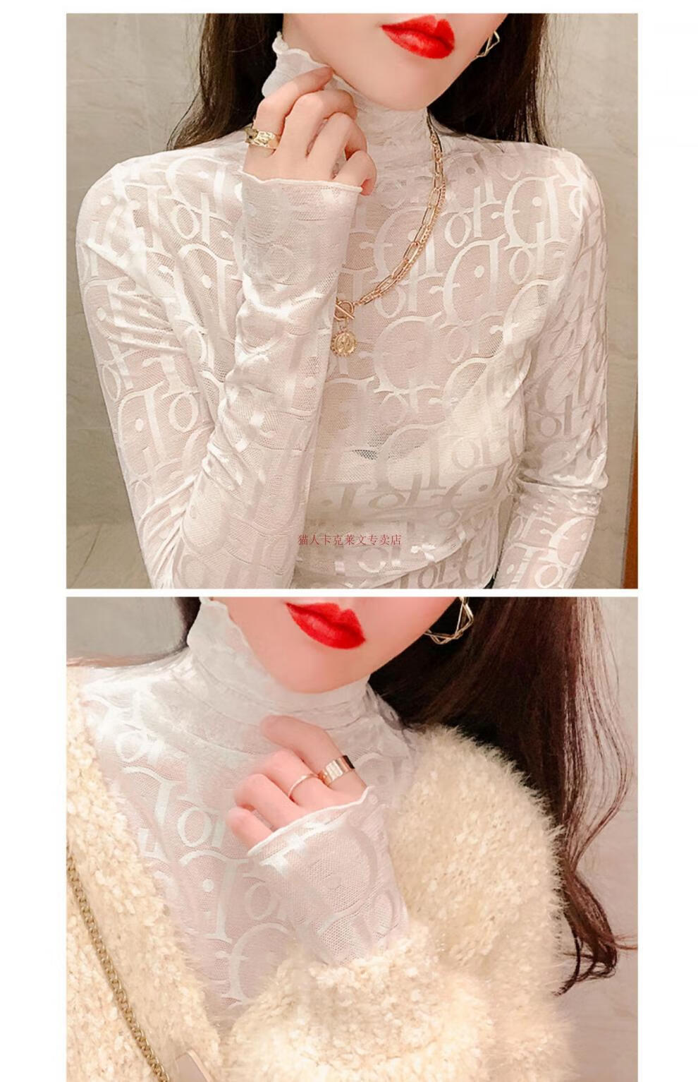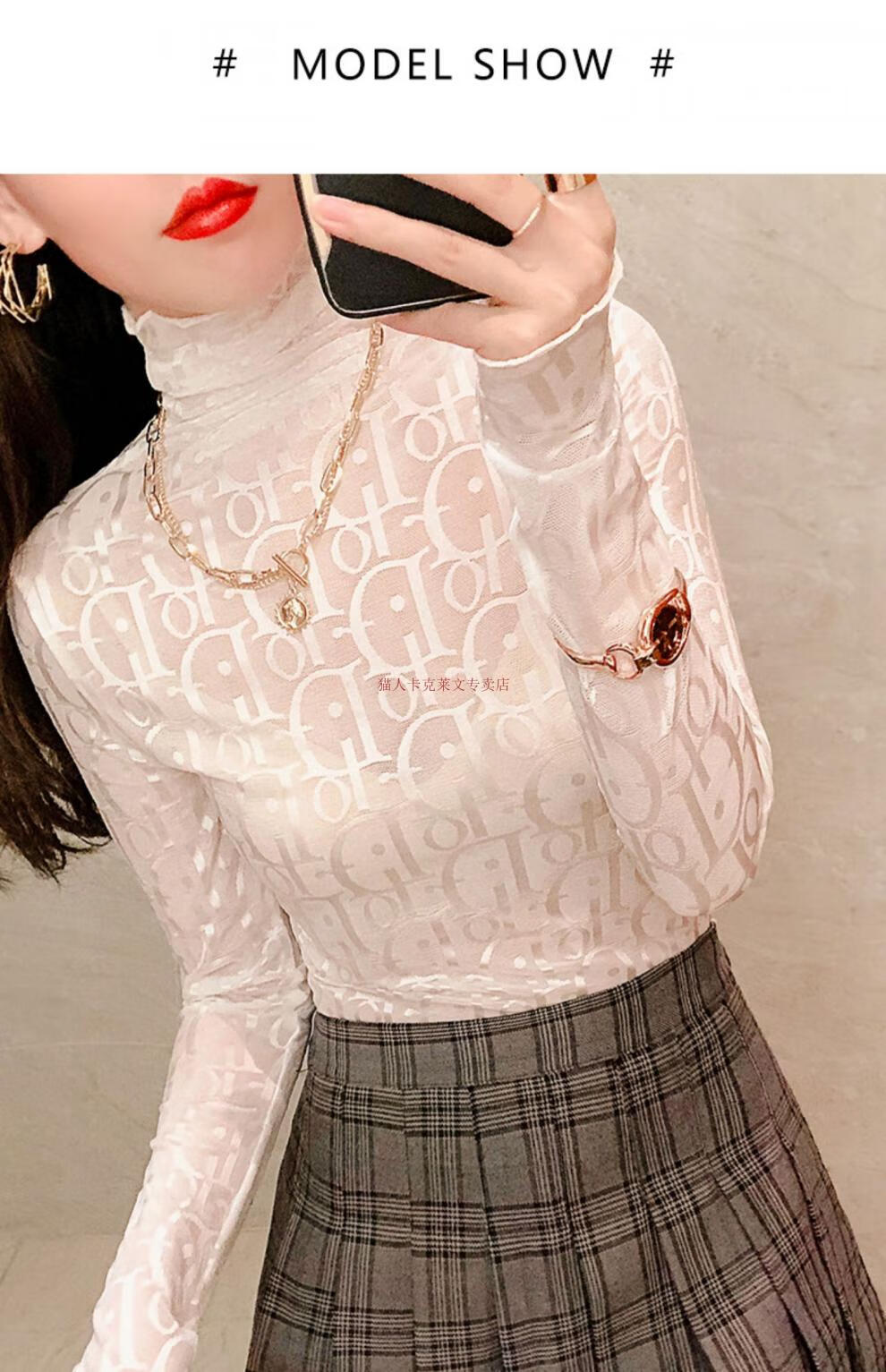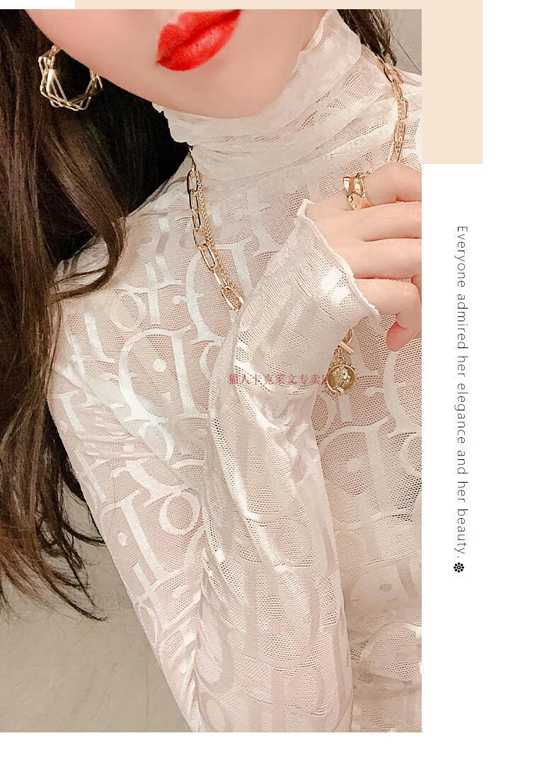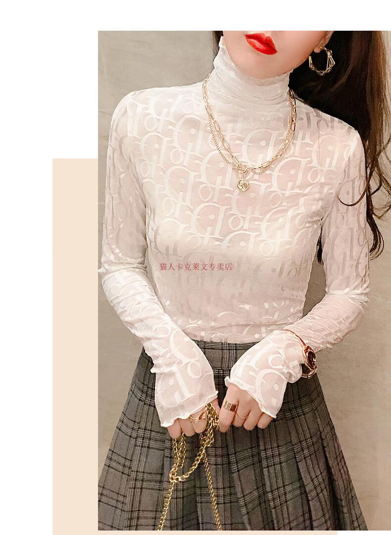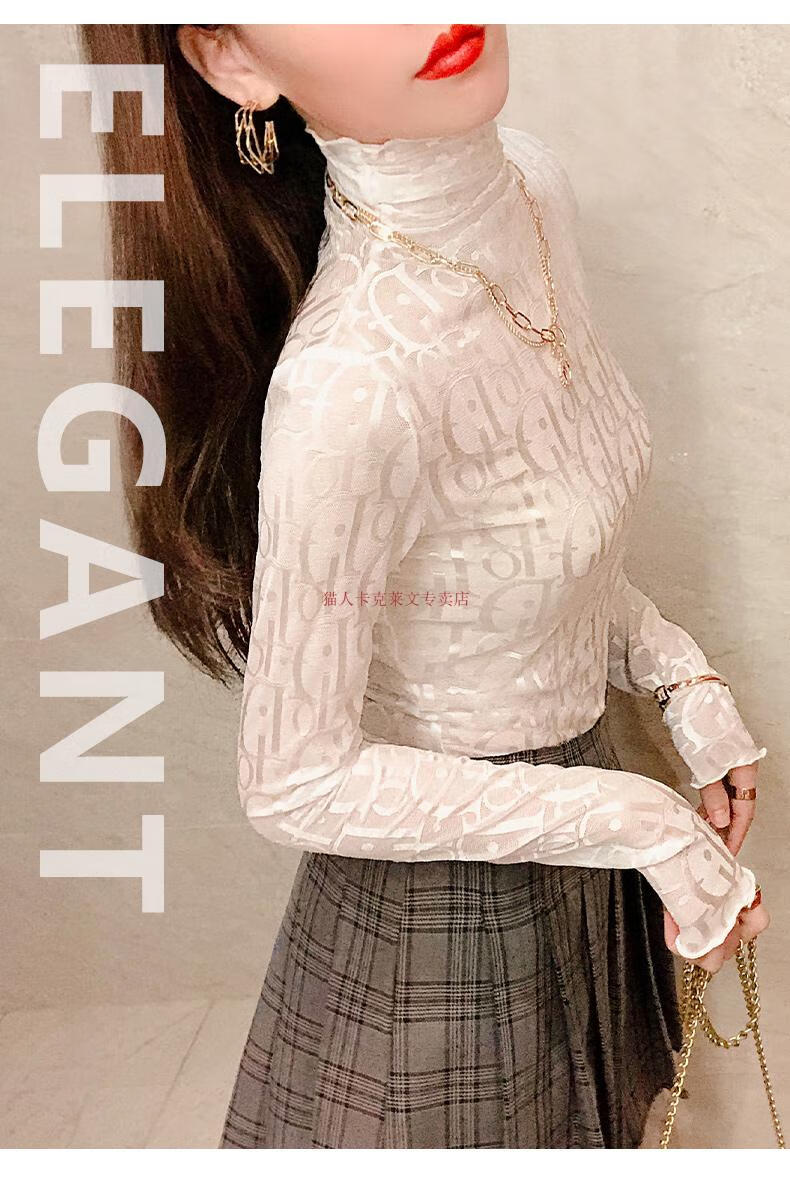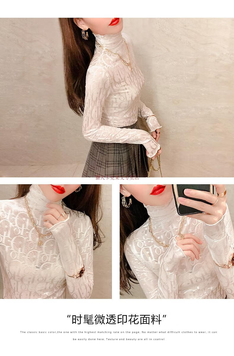 Xia Dian Suding Queen (SE.PSTP) high-neck mesh bottoming shirt for women, autumn and winter style long-sleeved sweater with velvet thickened lace warm fashionable top, white velvet S