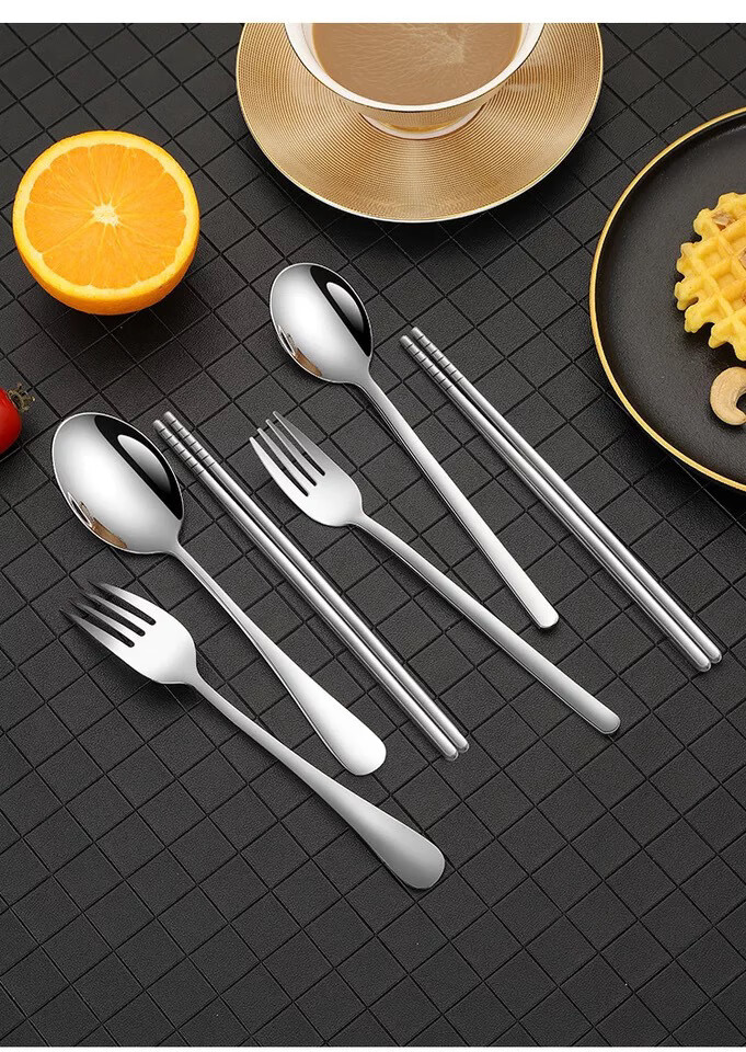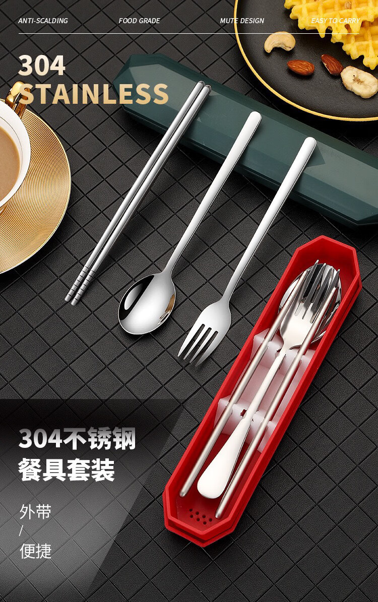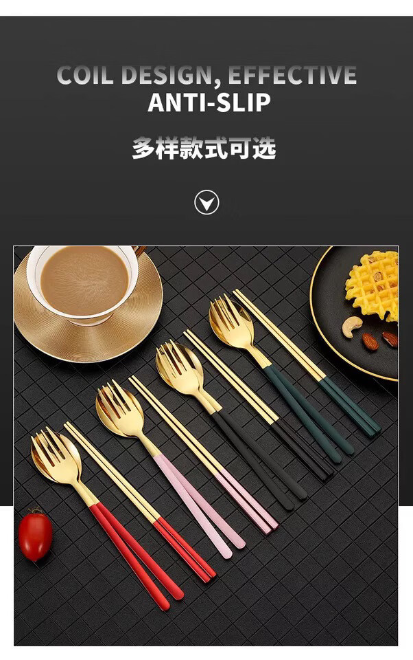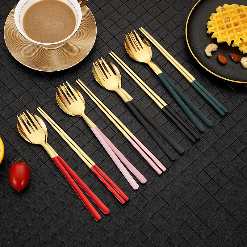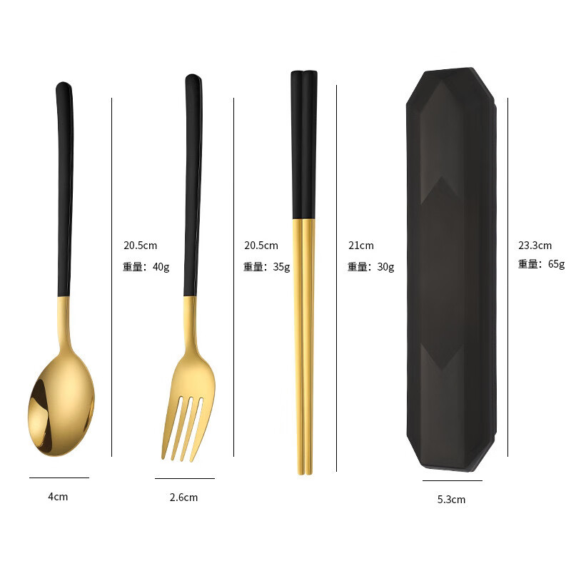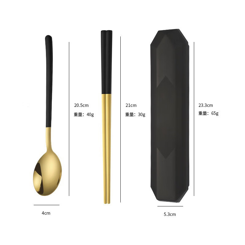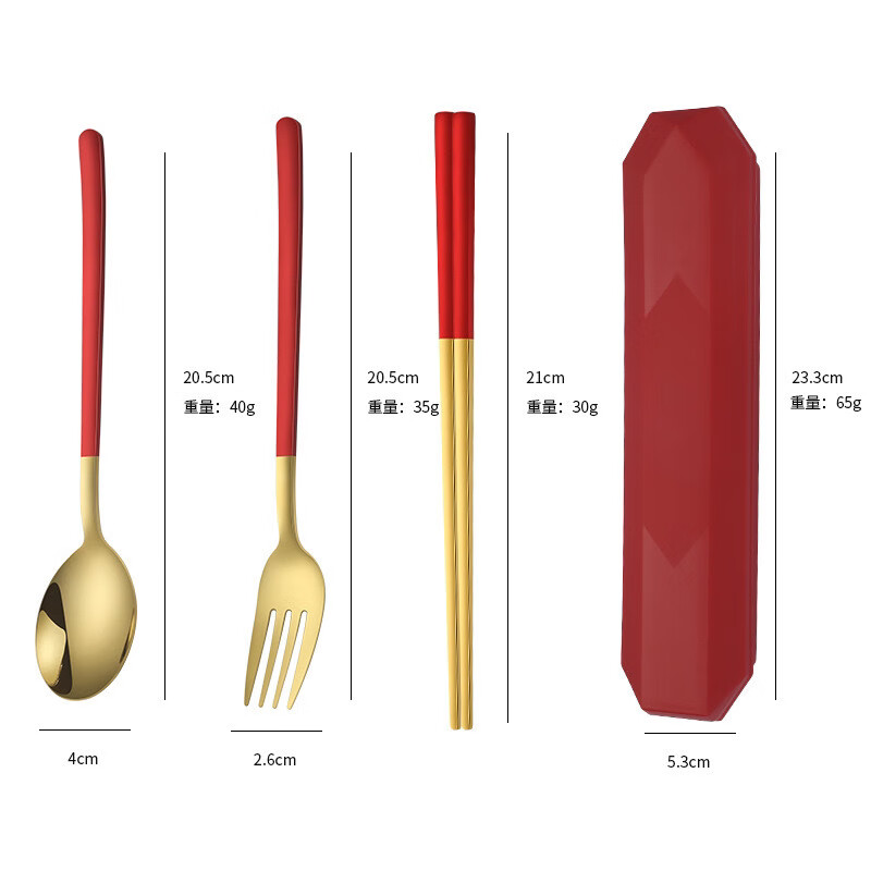 Tuojin imported quality 304 stainless steel forks, spoons and chopsticks tableware imported from Germany, Korean-style titanium-plated spoons and chopsticks set, convenient travel meal, rose red + rich gold, two-piece set (spoon + chopsticks + box)