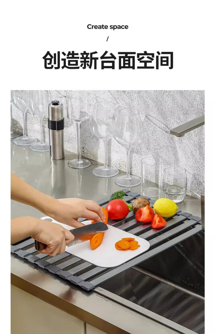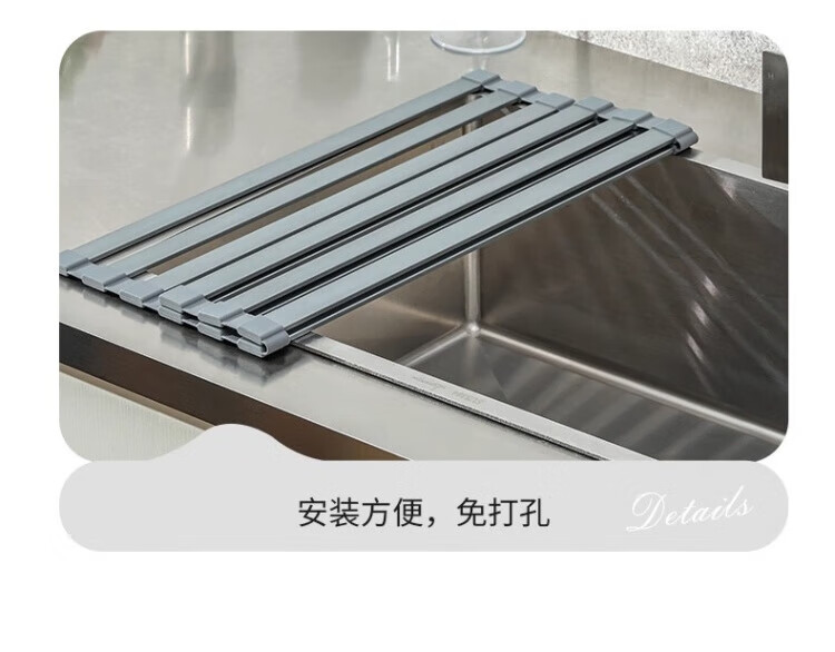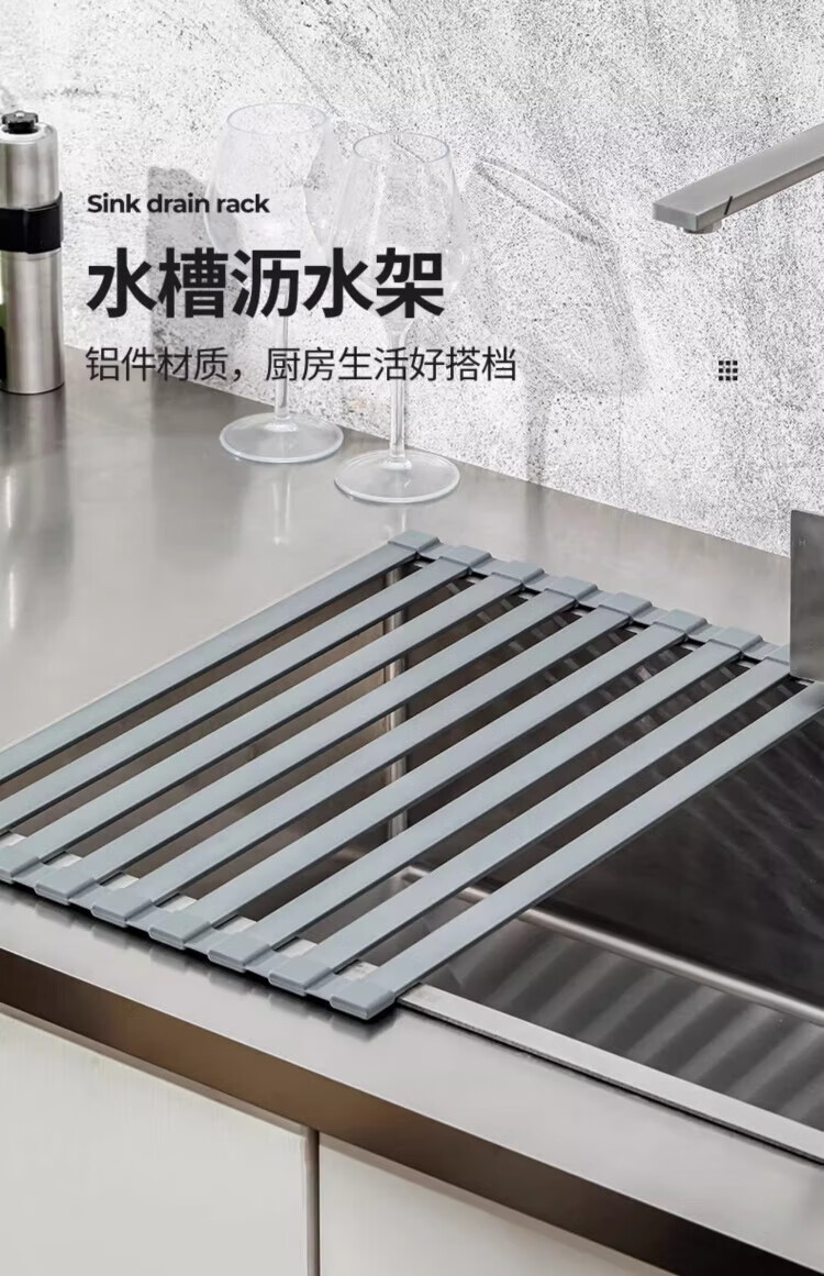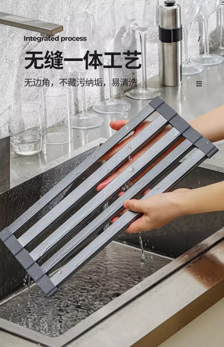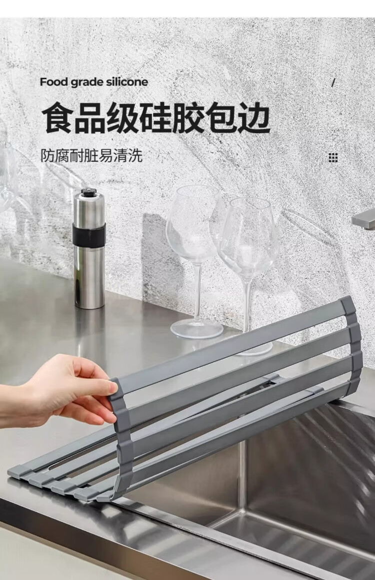 Yingtang Kitchen Sink Dish Rack Silicone Drain Rack Stainless Steel Folding Storage Rack Pool Light Luxury Silicone Water Control Roller Curtain 48*34.5CM Gun Ash-Drain Rack