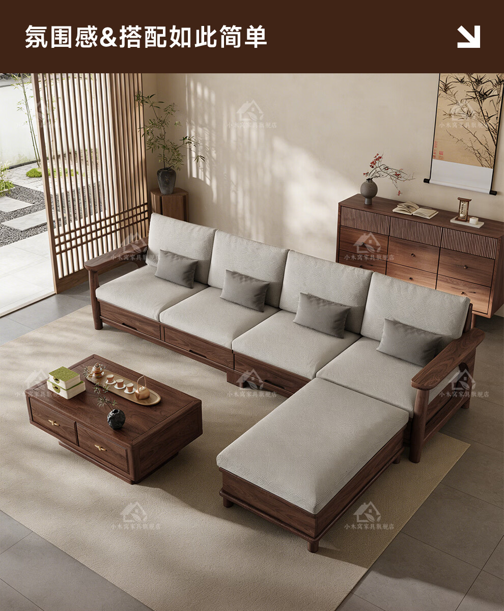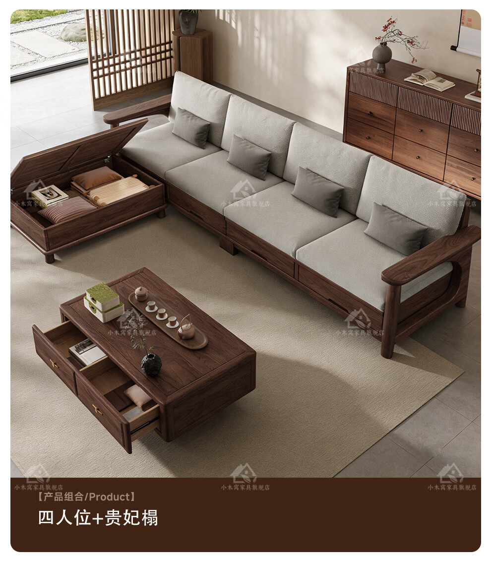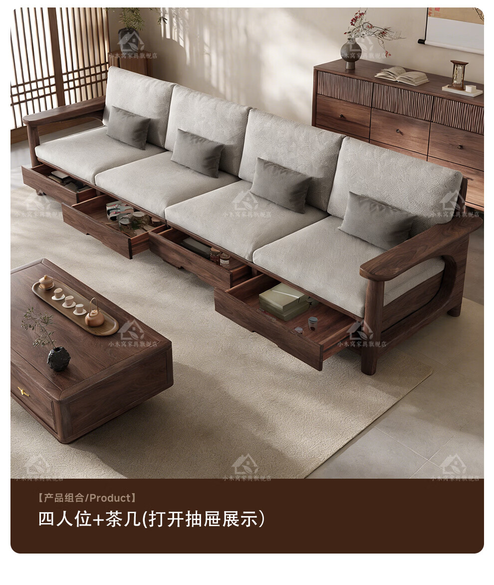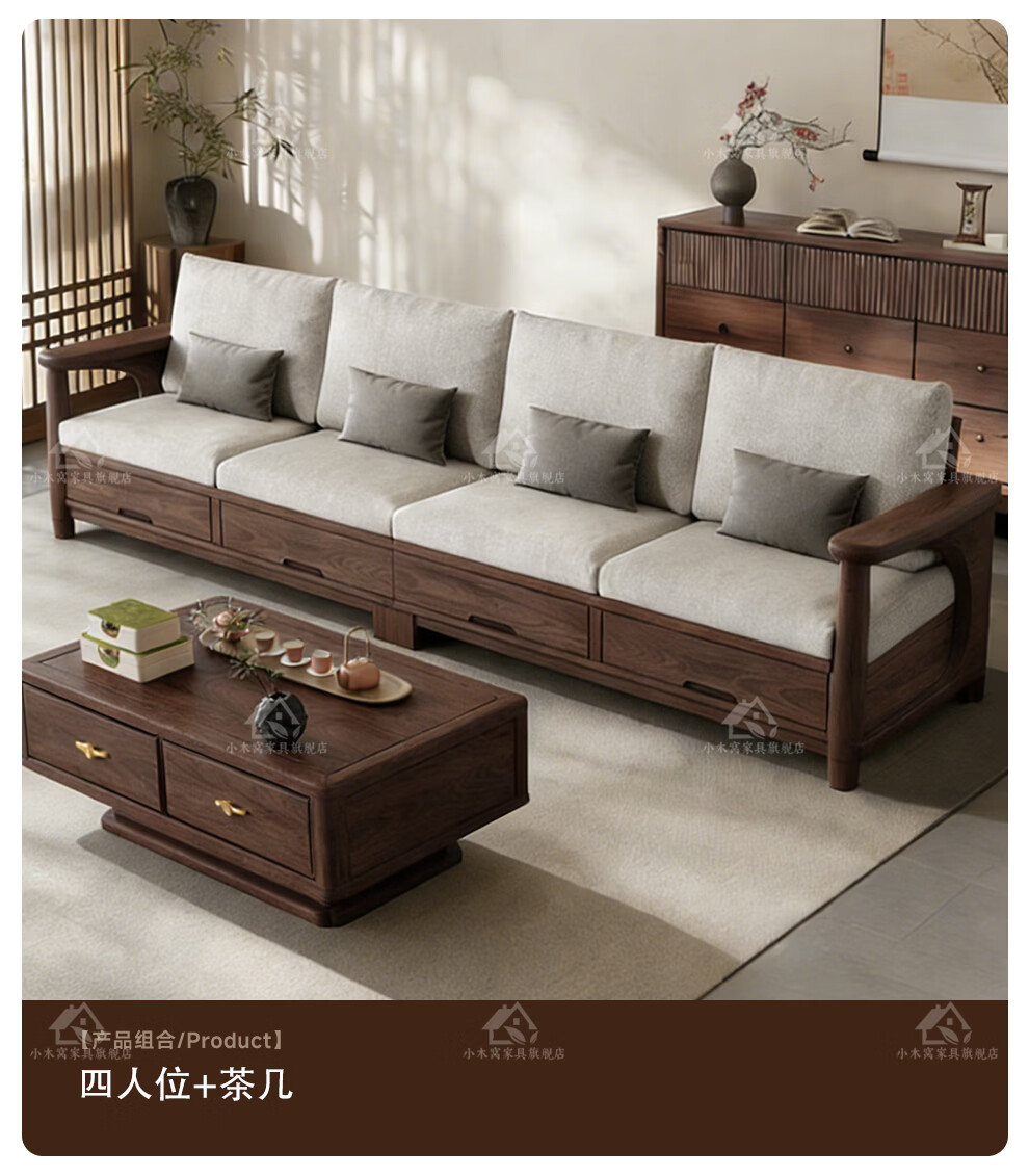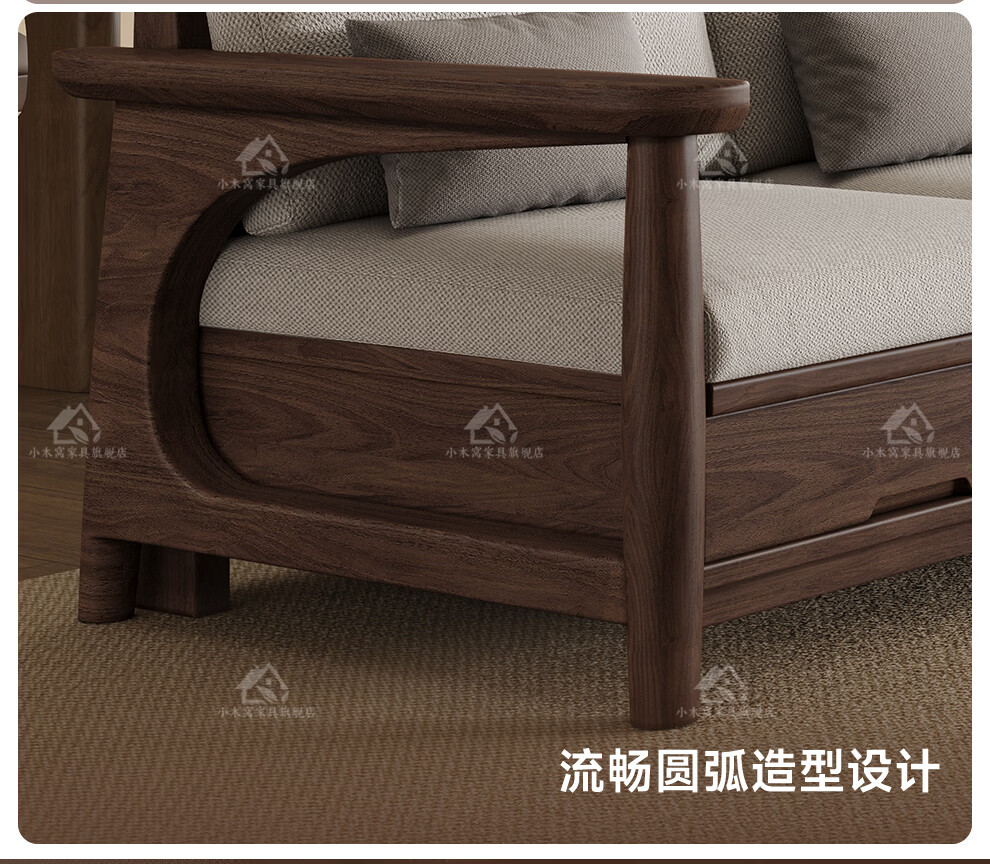 Small wooden nest sofa Song's aesthetic all solid wood sofa living room 2025 new small apartment sofa combination black walnut straight three-seat combination