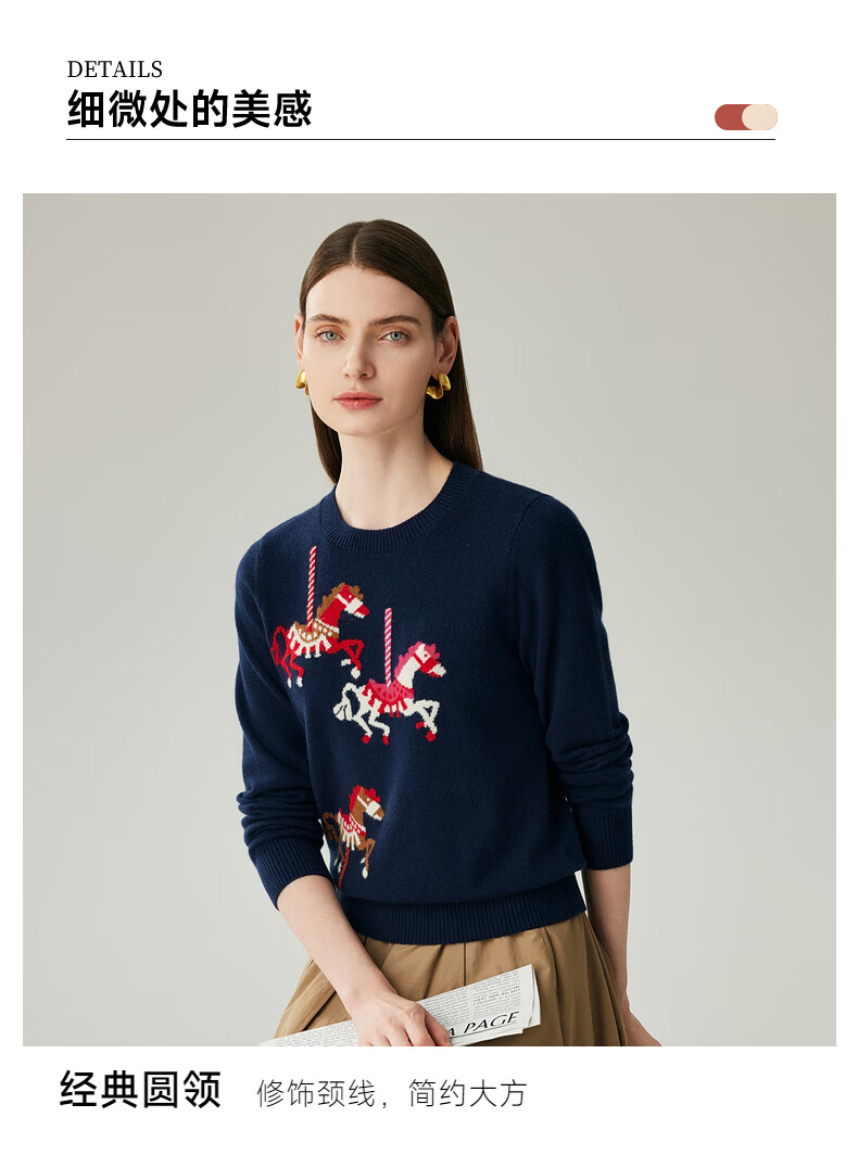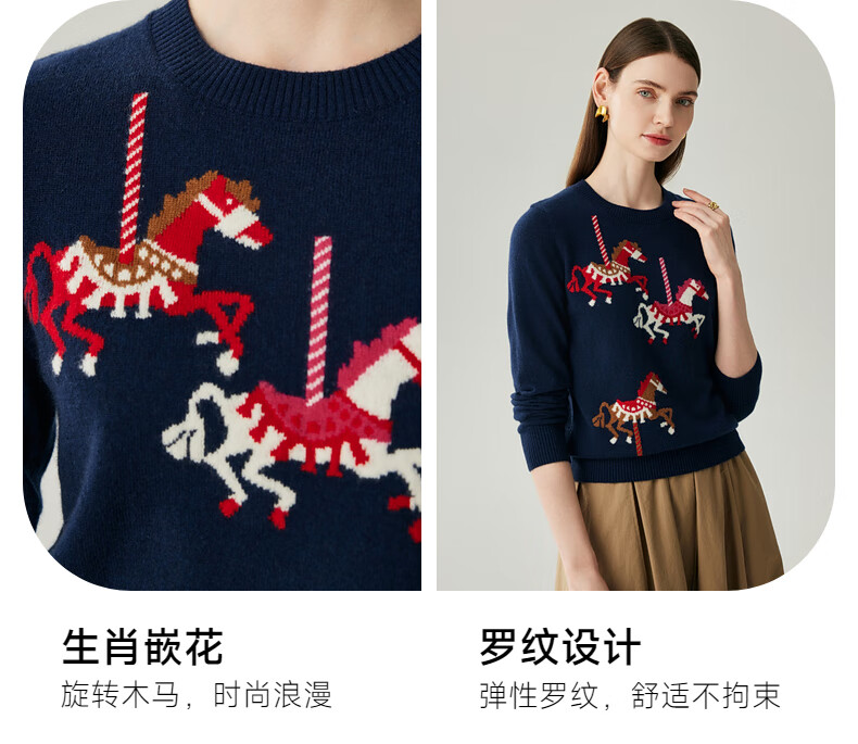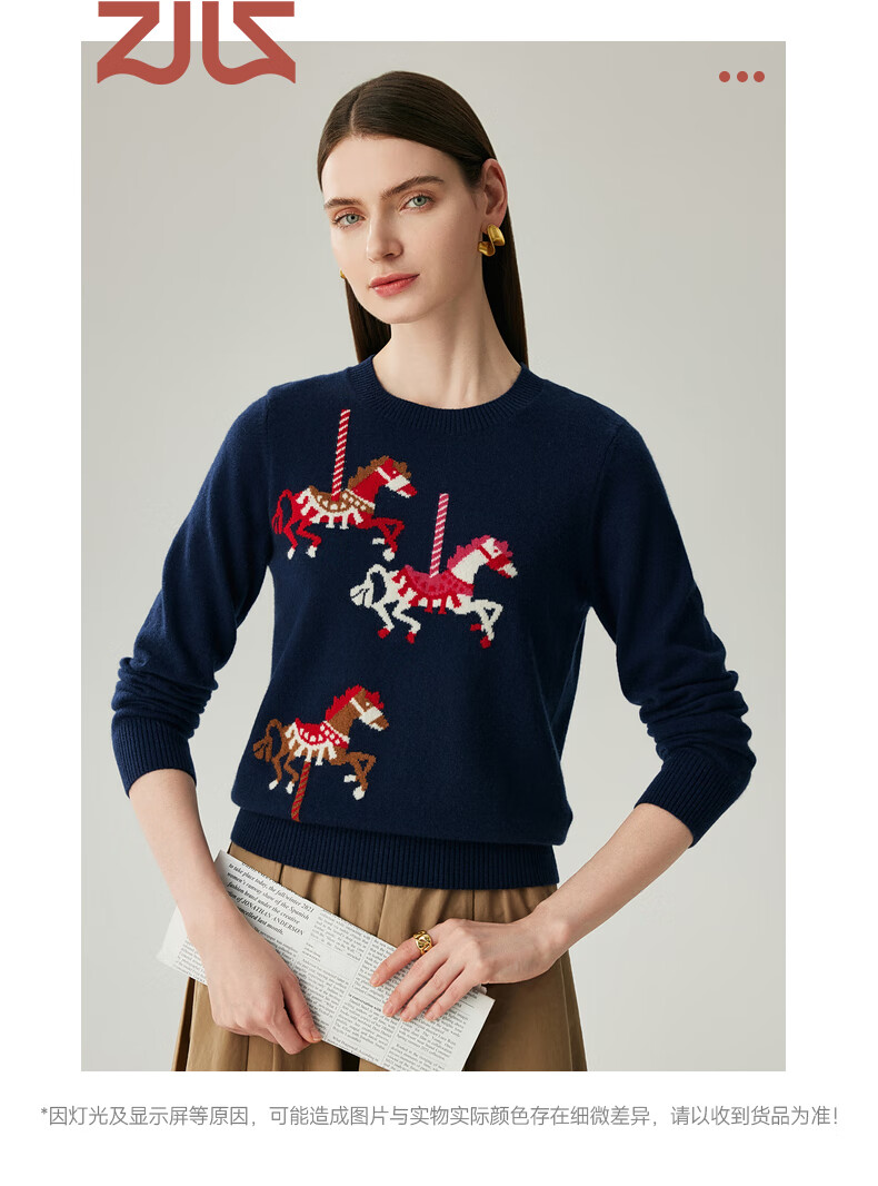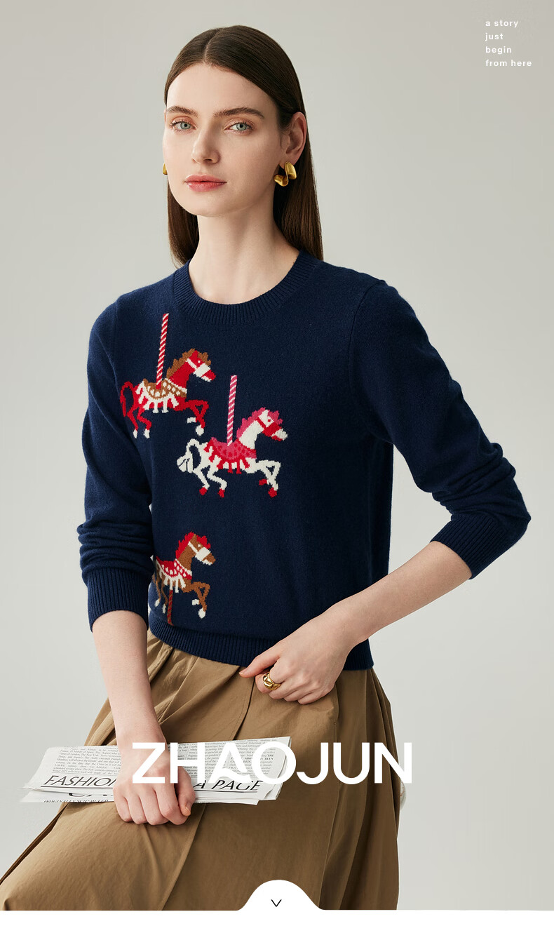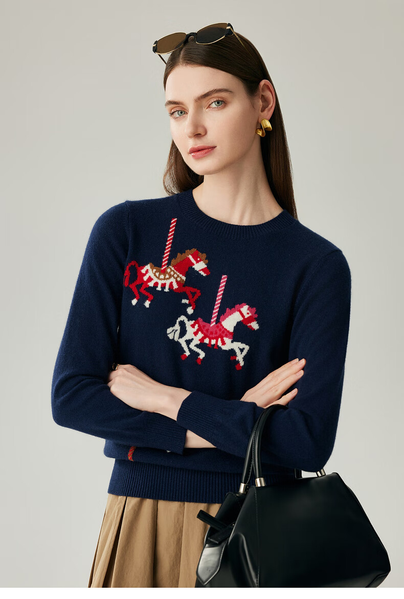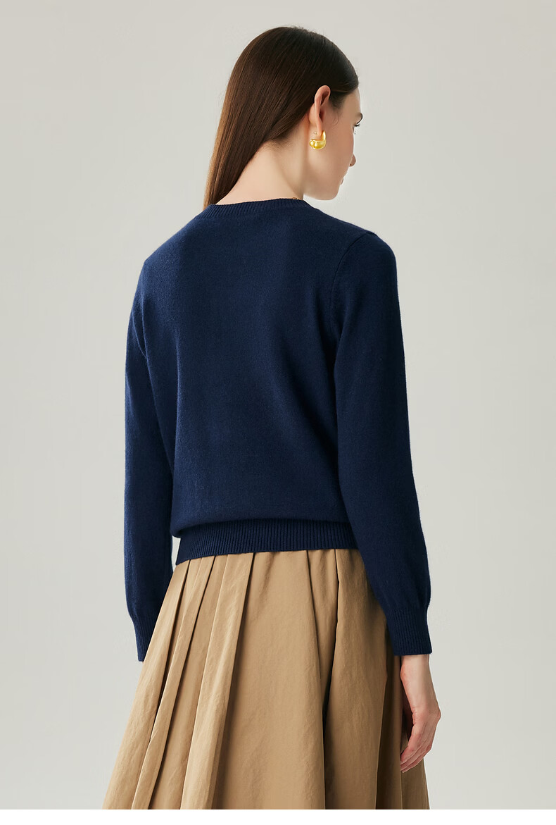 Zhaojun 2025 Autumn and Winter New Round Neck 100% Cashmere Sweater Women's Carousel Sweater Age Reduction Base Sweater Dark Blue XL