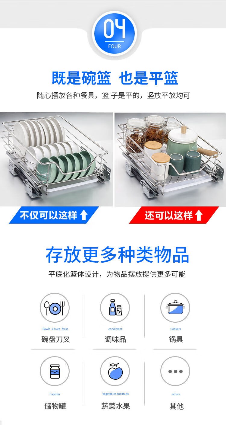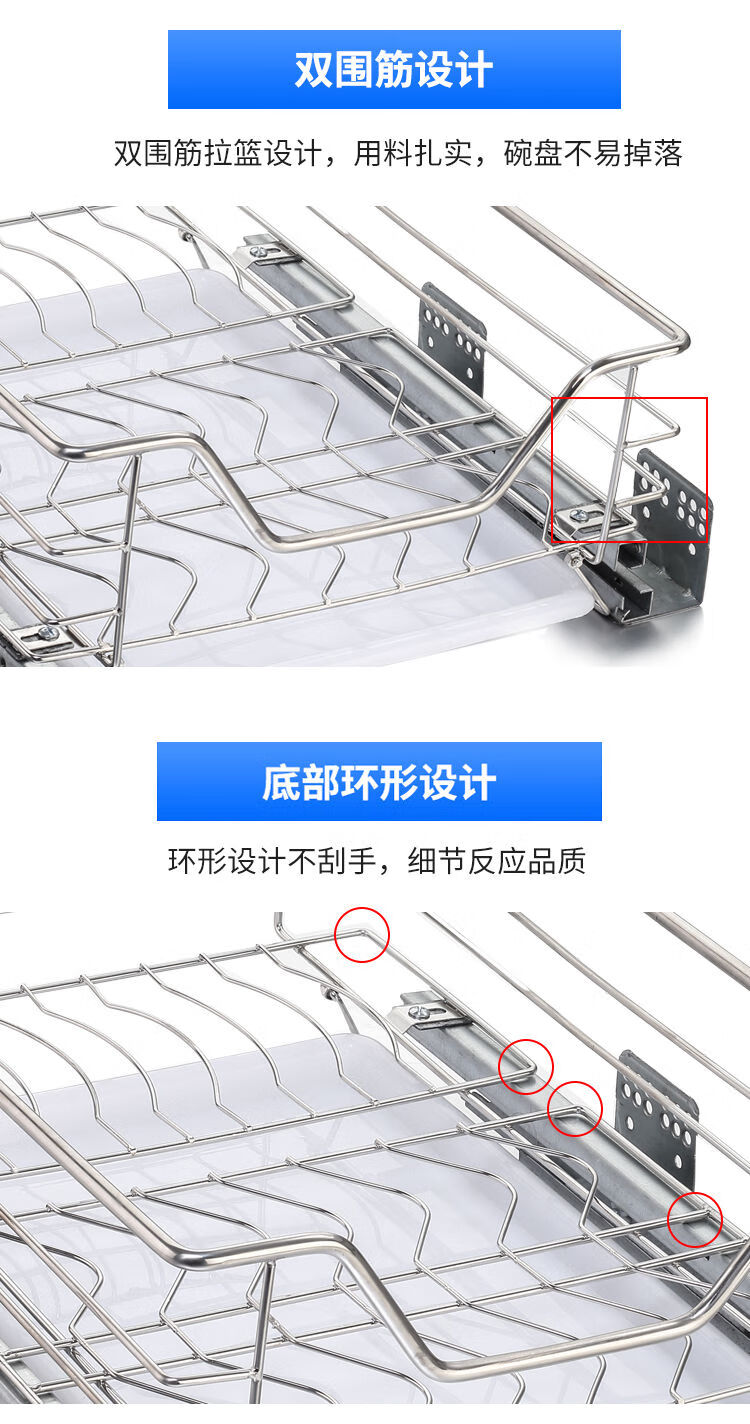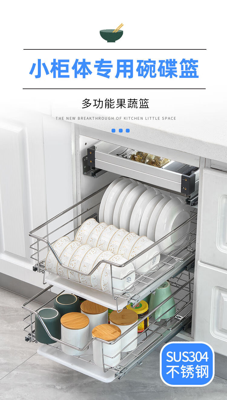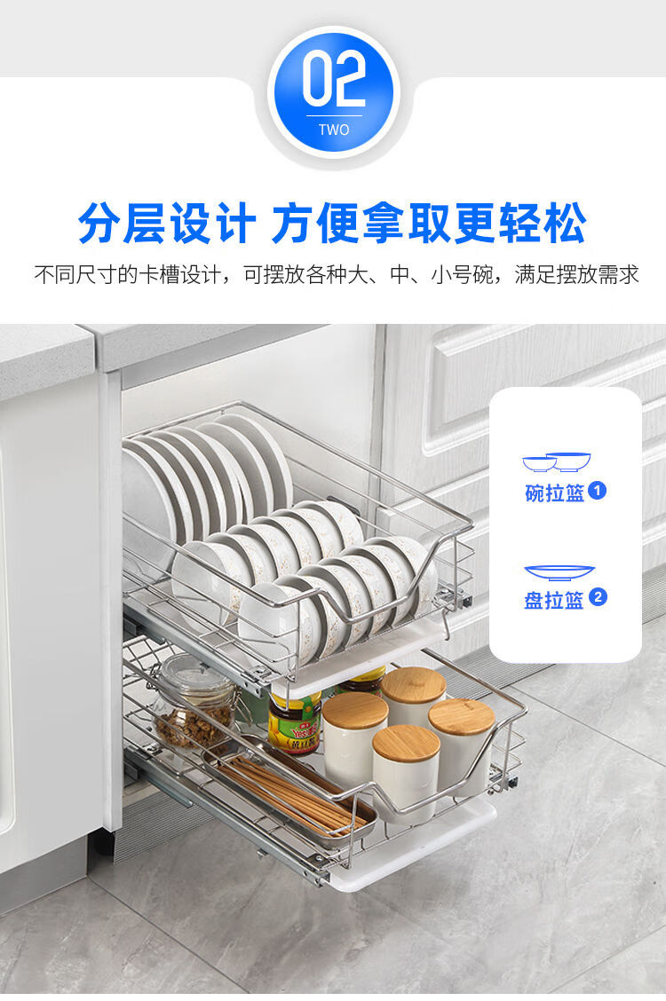 Huili's narrow cabinet pull basket 304 stainless steel double layer kitchen cabinet small size dishes, fruit and vegetable seasoning basket drawer type buffer 300 cabinet tool basket one layer double layer drawer type
