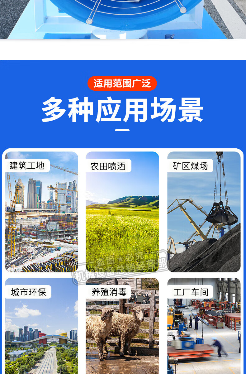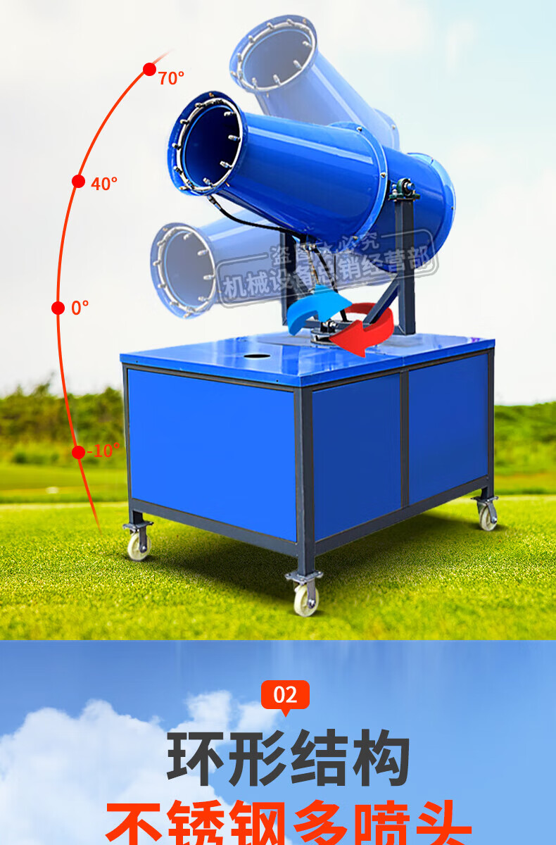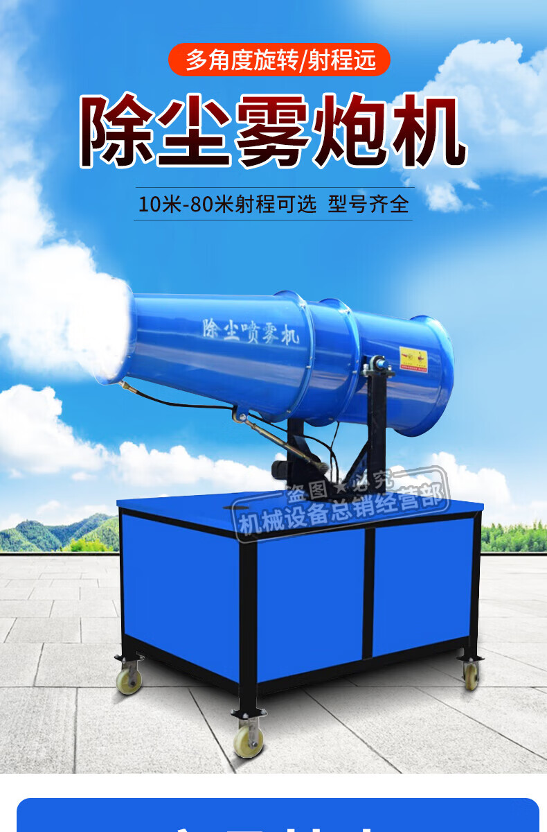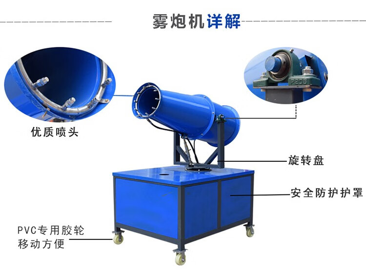 This is a fog cannon machine, construction site dust removal cannon, fog machine, dust-proof, environmentally friendly watering machine, vehicle-mounted movable high-range dust reduction spray machine, environmental impact assessment type three-phase electric fog cannon machine