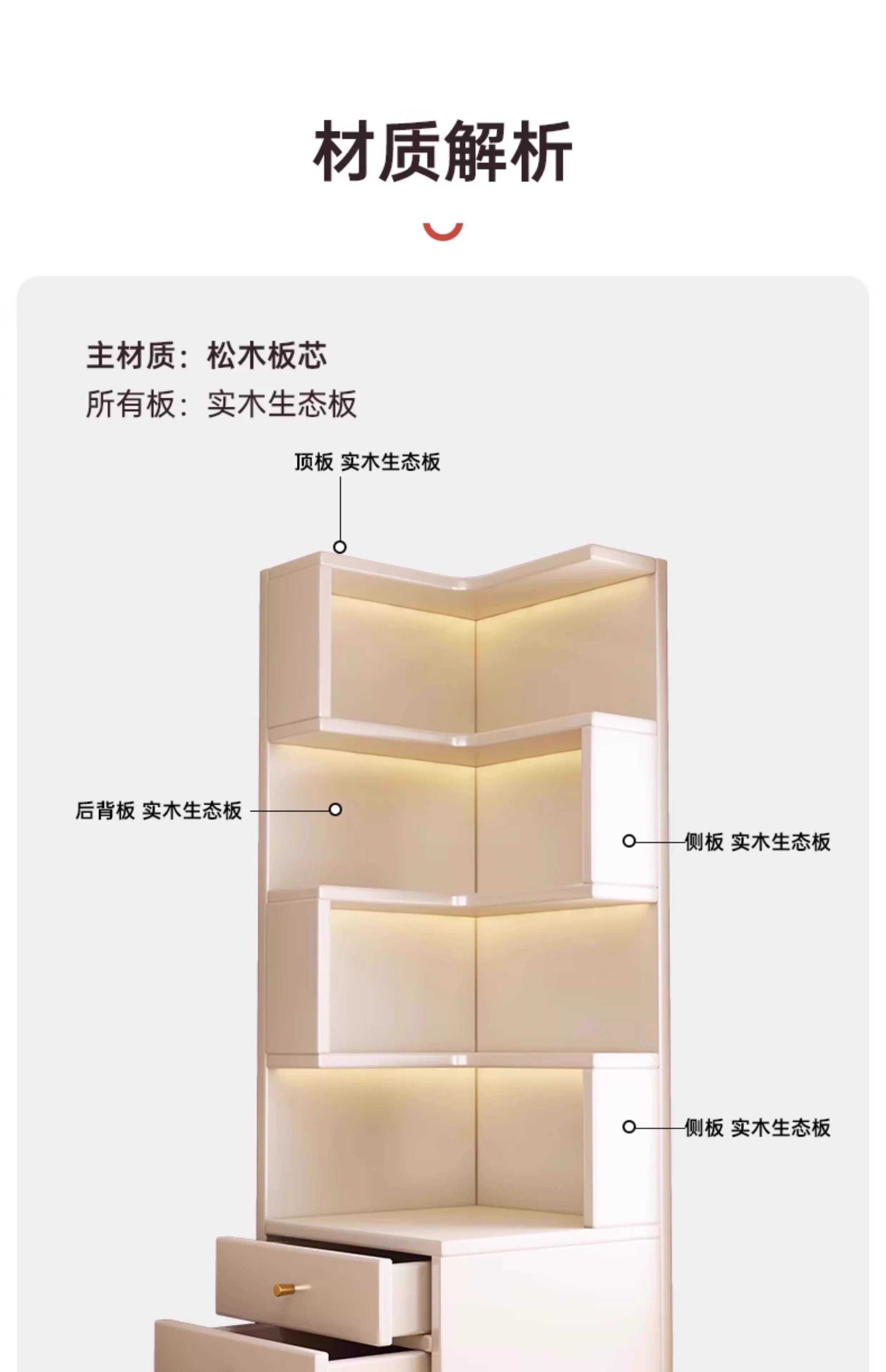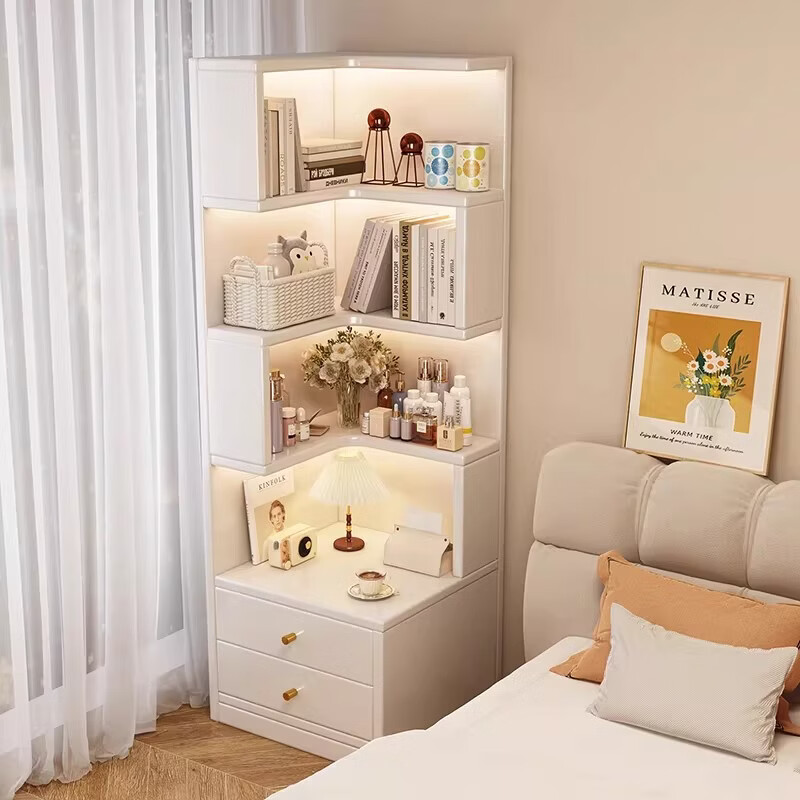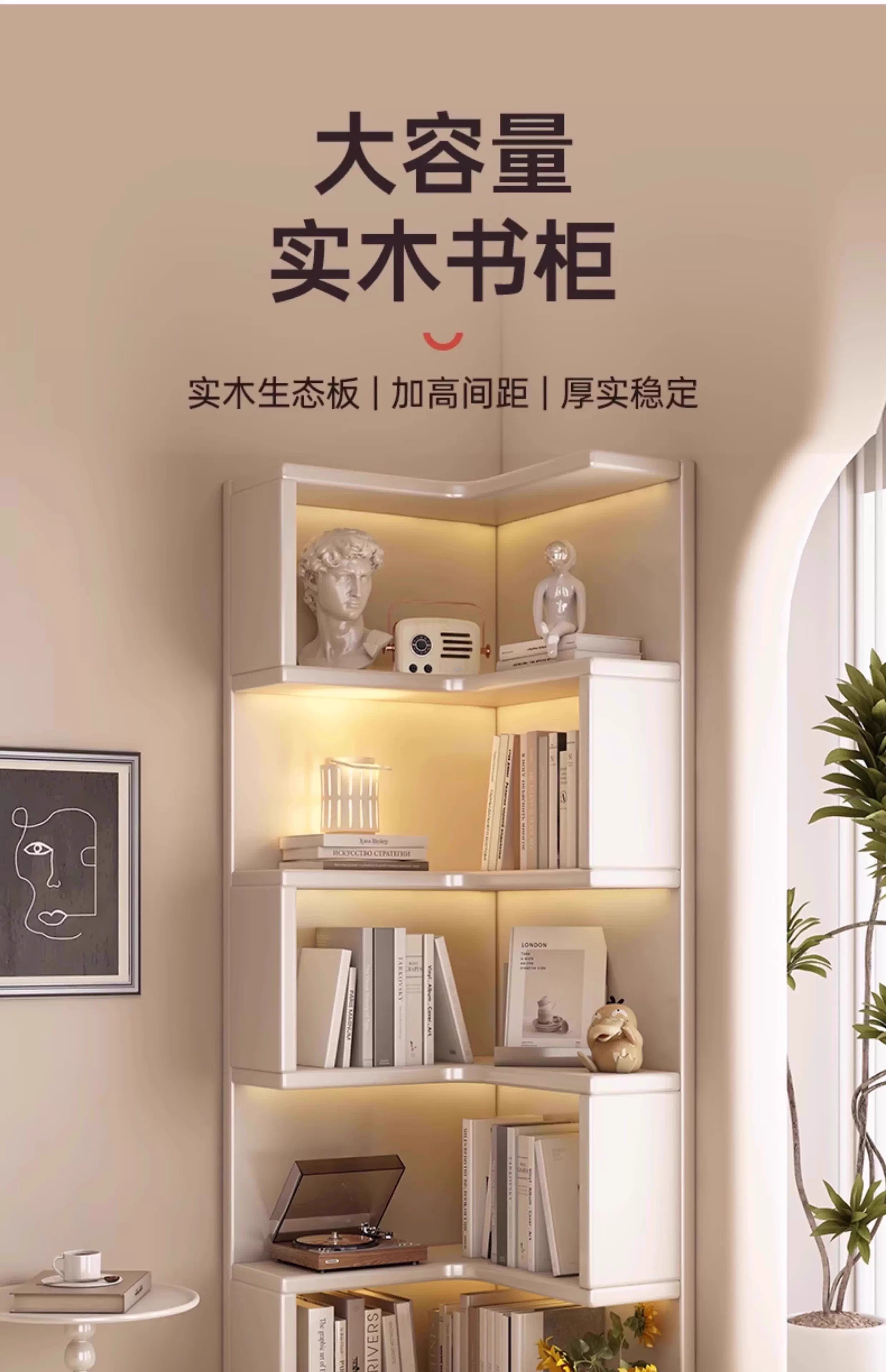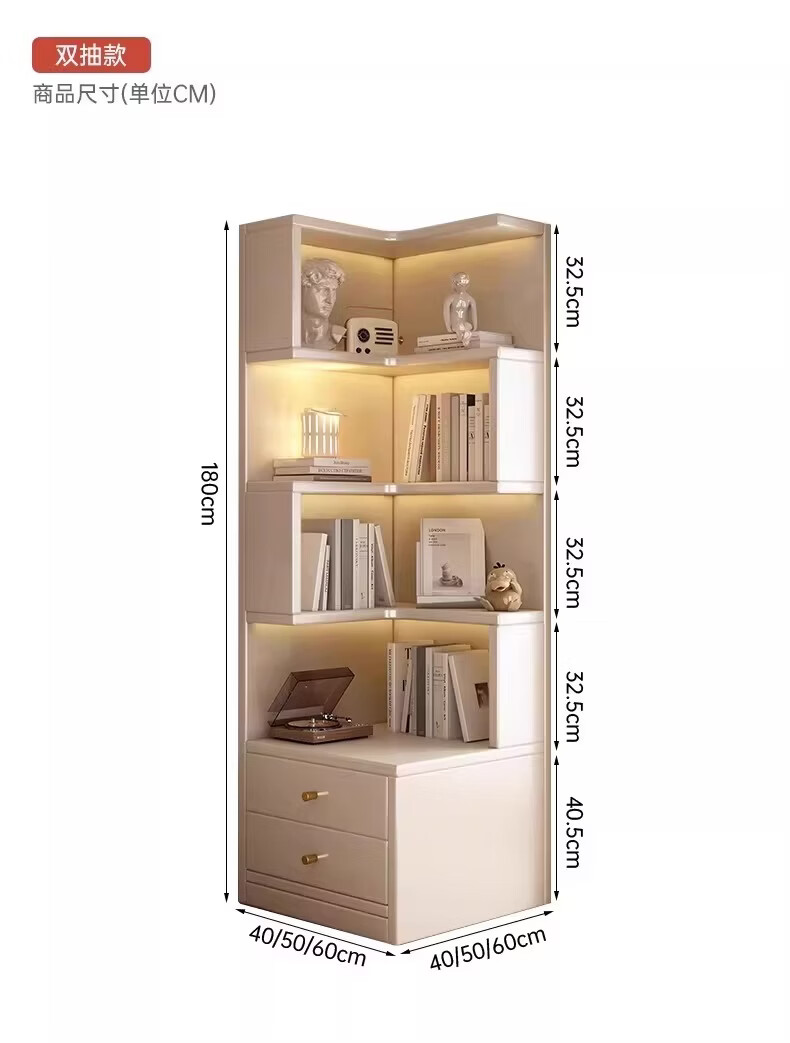 Solid wood corner cabinet corner storage rack home floor-standing children's corner bookcase living room 90-degree triangular storage cabinet solid wood core warm white 50CM double drawer