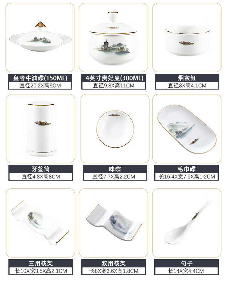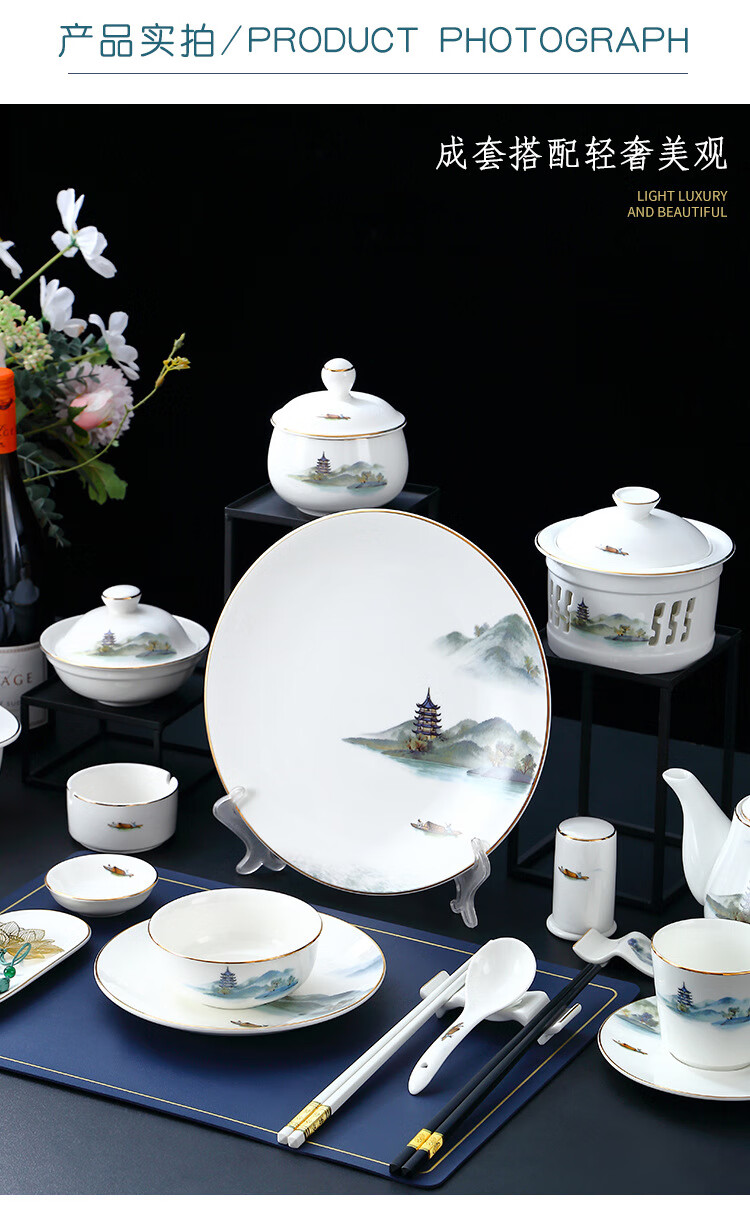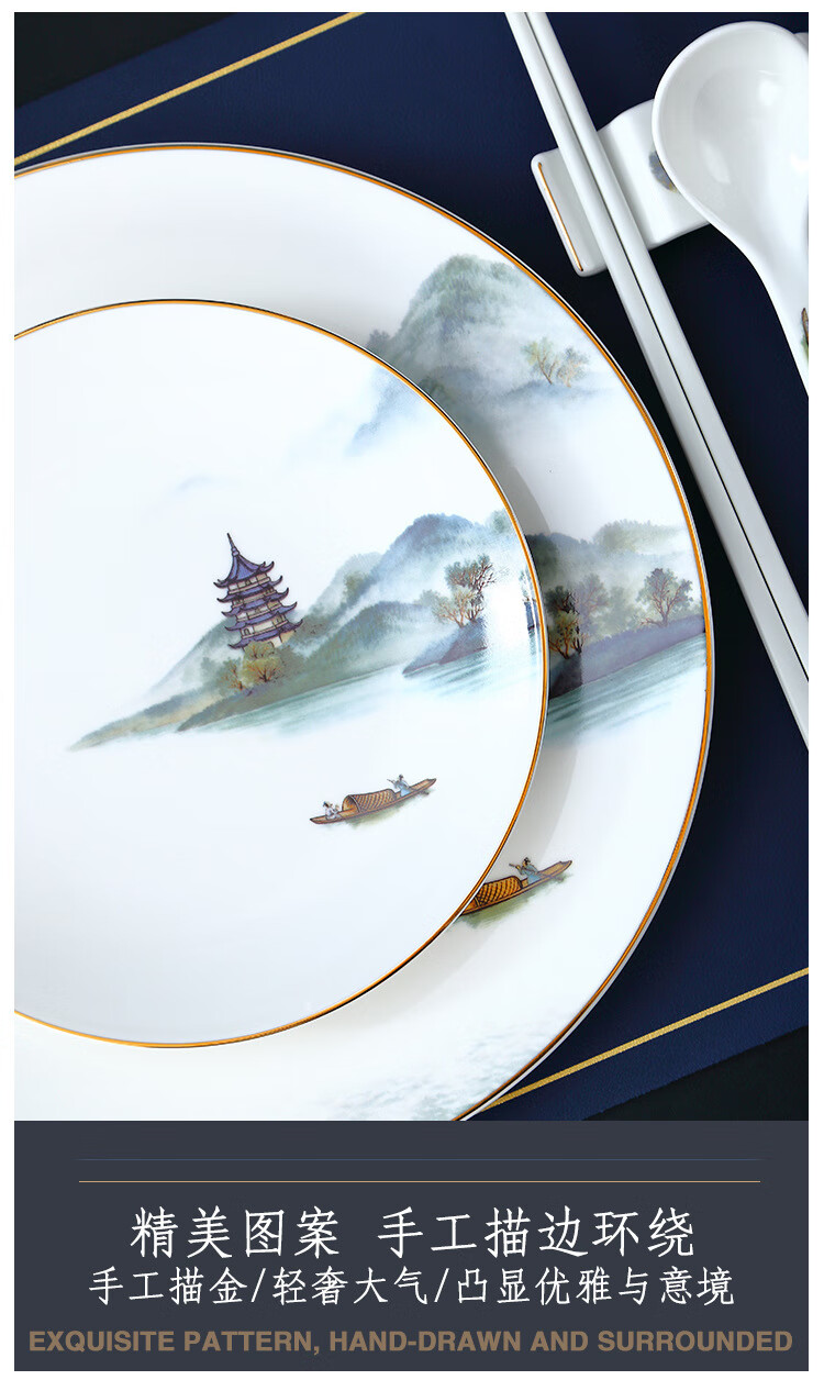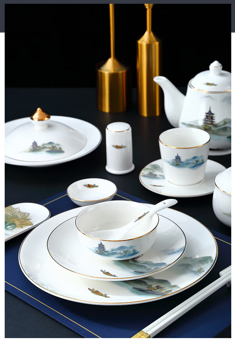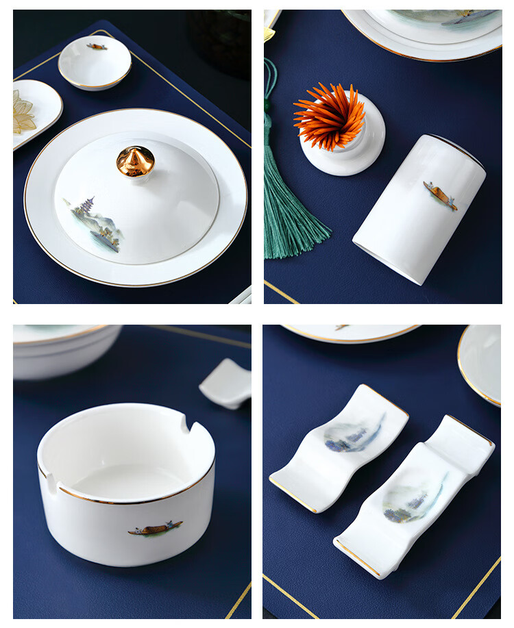 Youmingrui Chinese hotel tableware set, ceramic gold edge five-piece set, hotel eight-piece set, custom logo printing, Tashan Huiying large eight-piece set