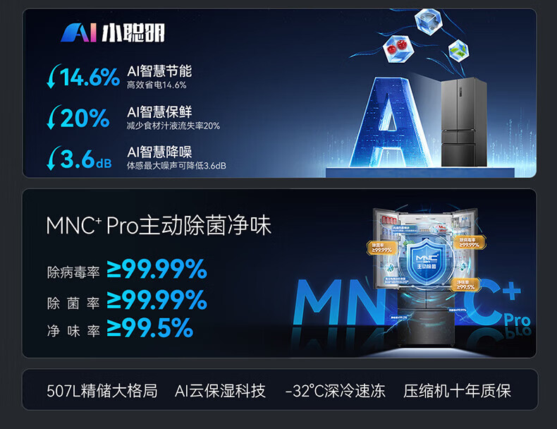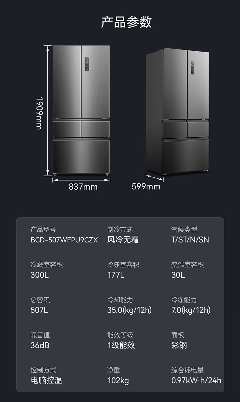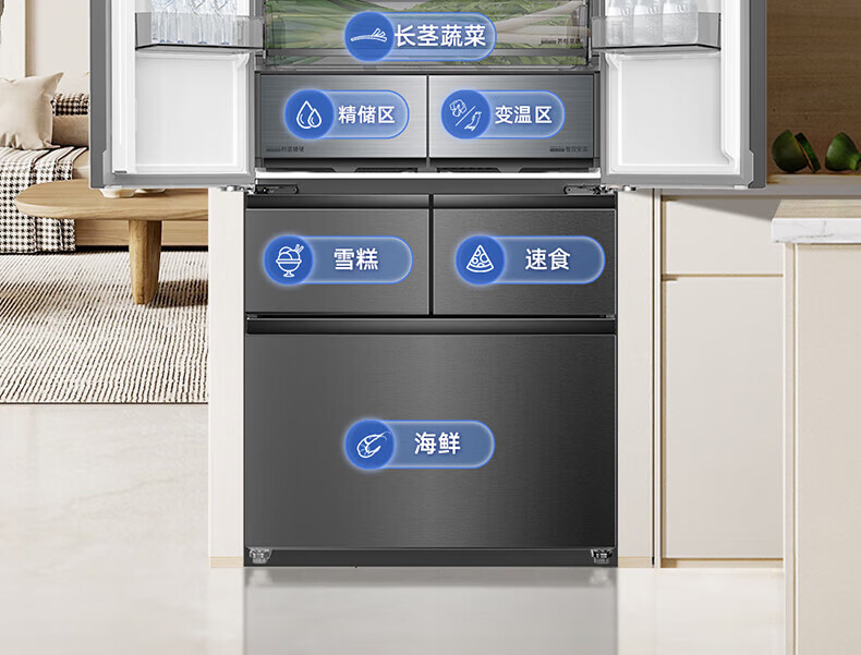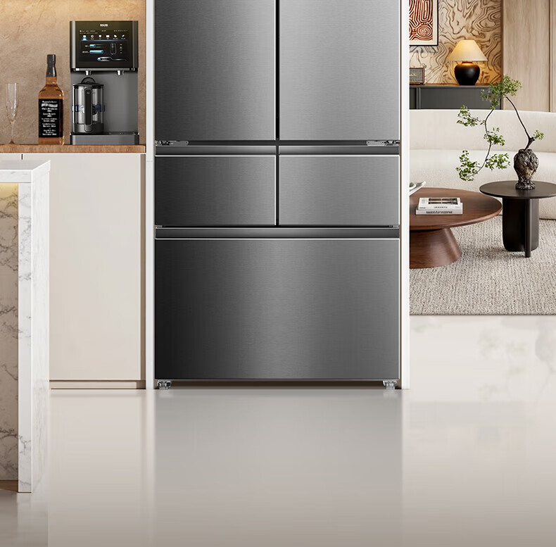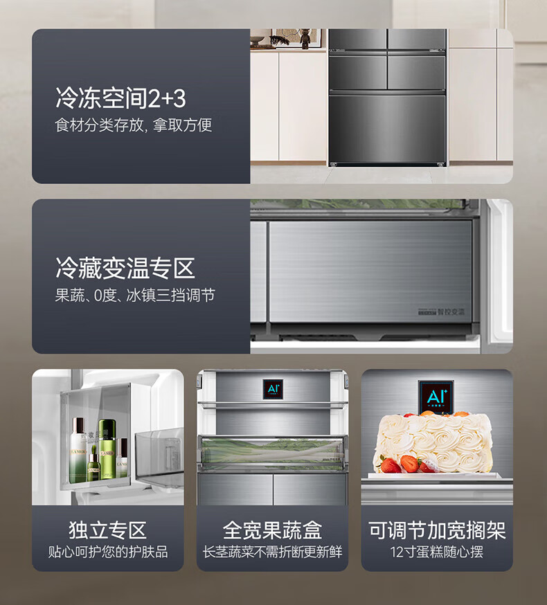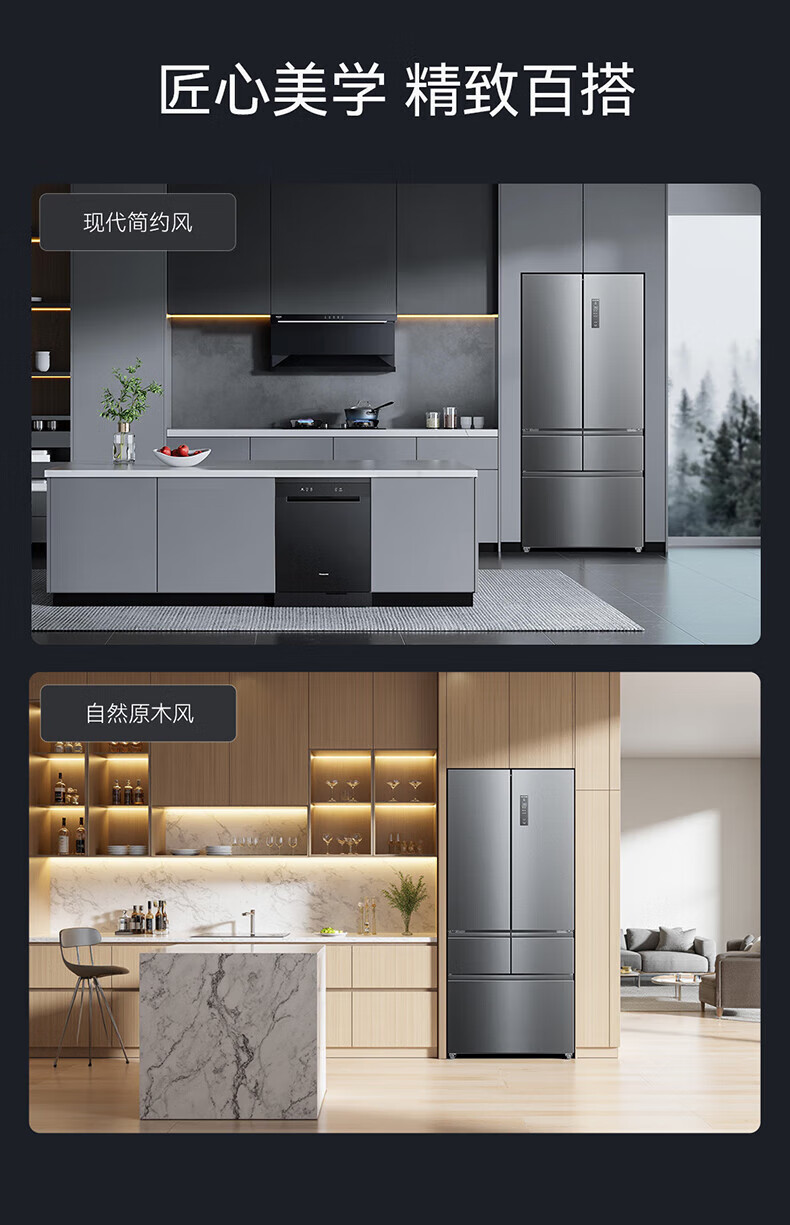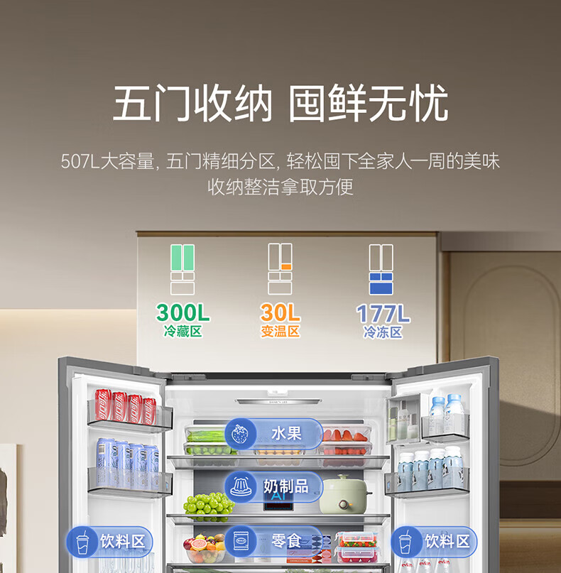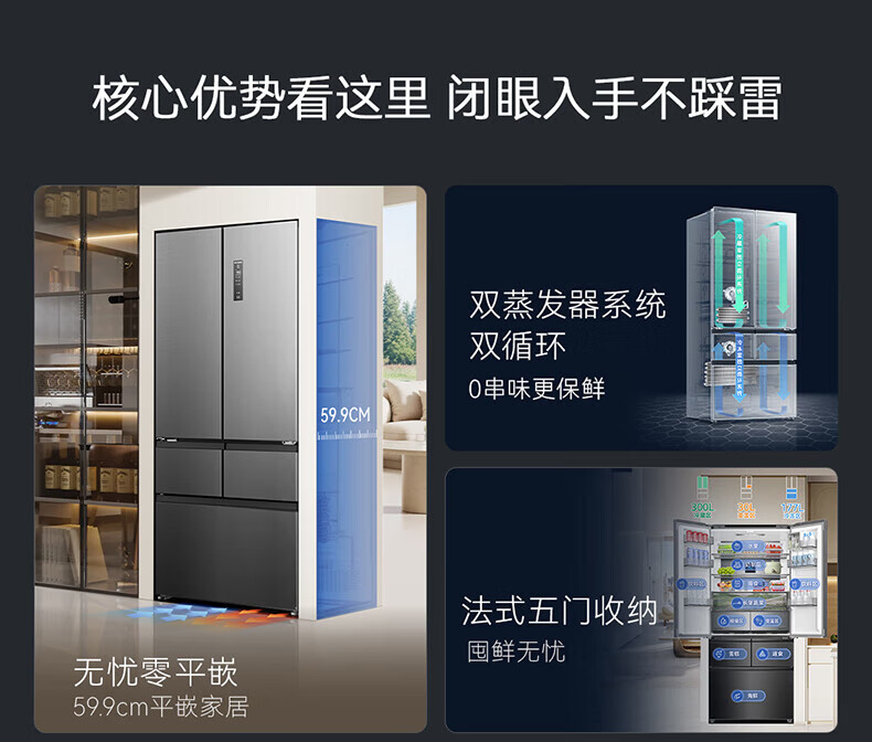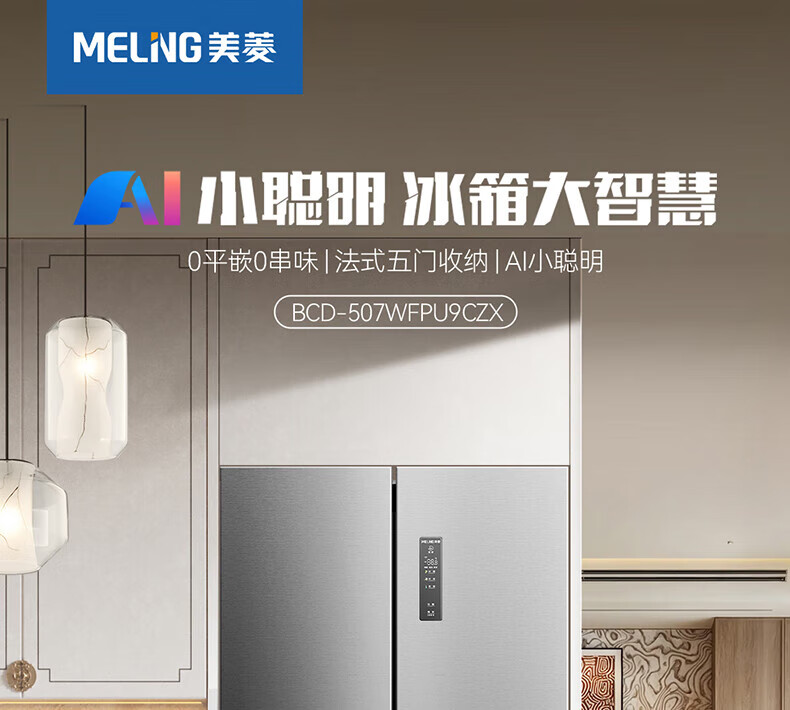 MeiLing 507-liter AI smart French five-door multi-door ultra-thin zero-distance embedded 599mm dual-cycle dual-system active sterilization household large-capacity air-cooled frost-free refrigerator 507 French smart-white