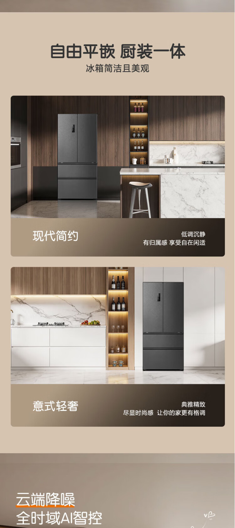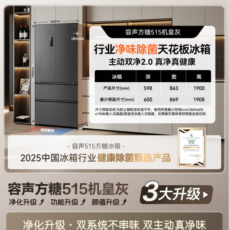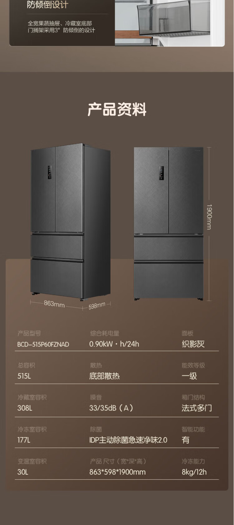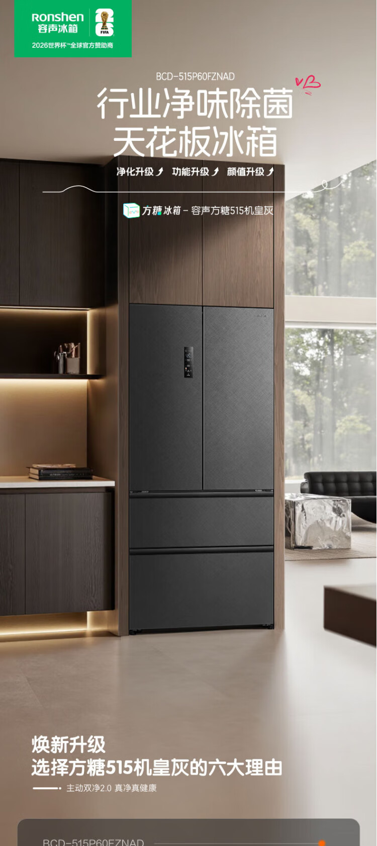 Rongsheng Cube Sugar 515L French-style multi-door refrigerator dual system ultra-thin zero-embedded automatic ice making first-class energy efficiency white BCD-515P60FZNAD National Subsidy World Cup BCD-515P60FZNAD Weaver Gray