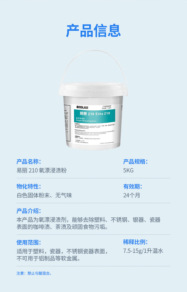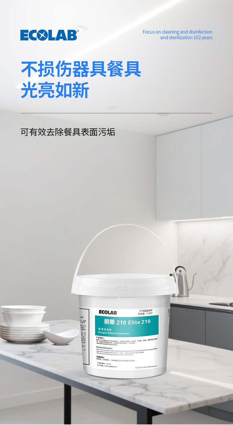 ECOLAB Yili 210 oxygen bleaching impregnation powder phosphorus-free stain removal powder for tableware coffee stains and tea stains 5kg 7100247