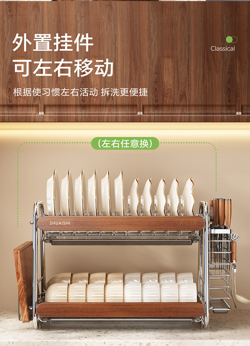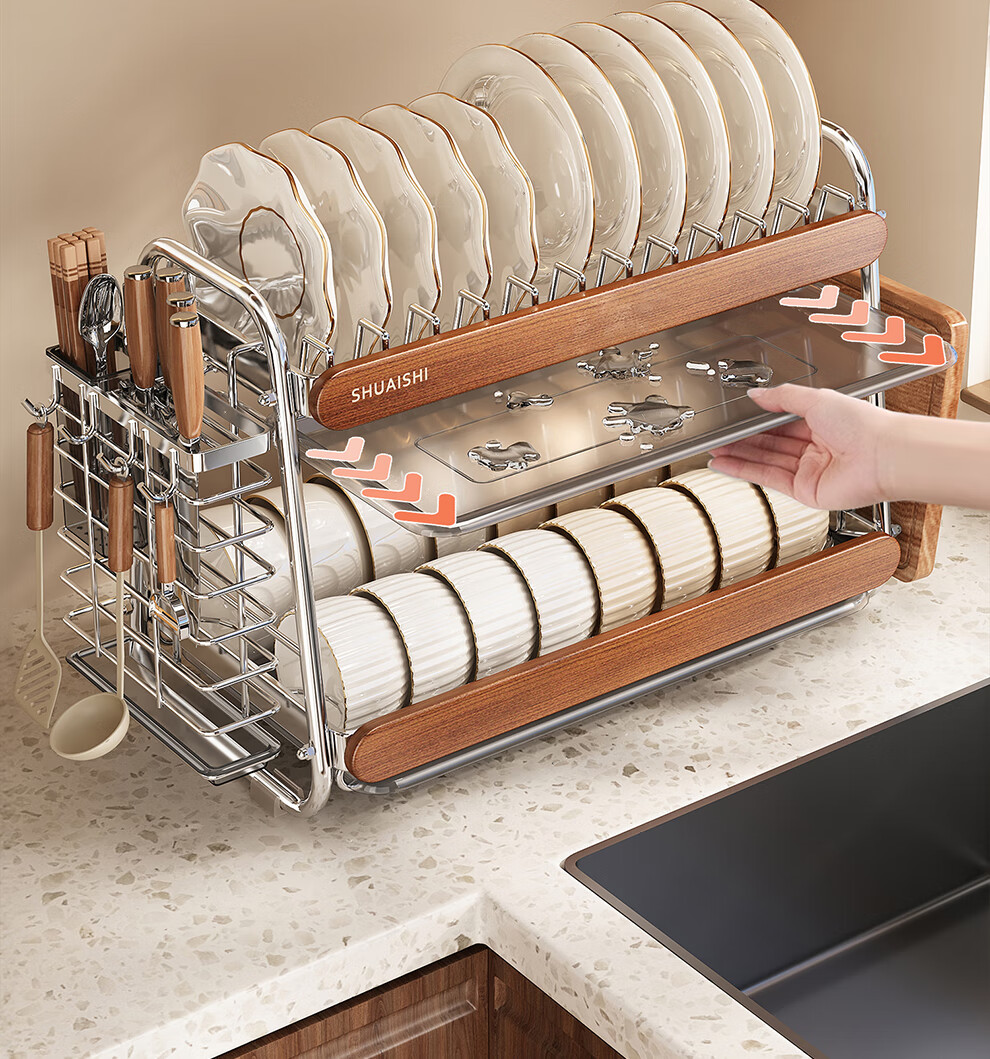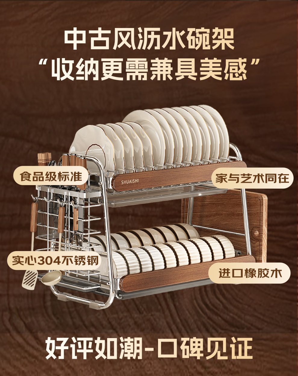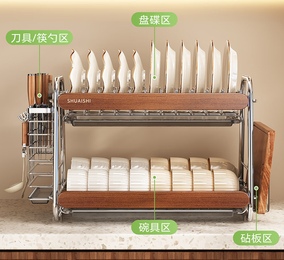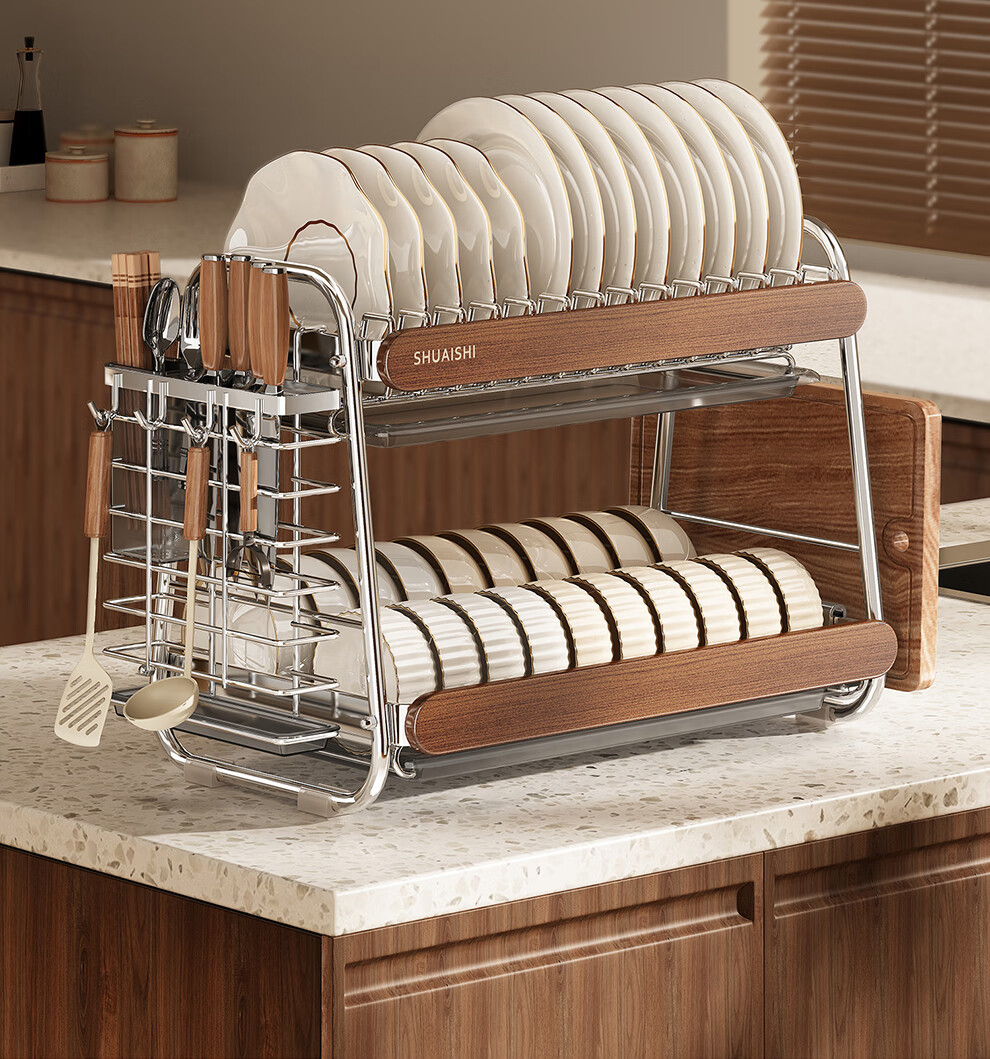 Shuaishi kitchen storage rack dish storage rack 304 stainless steel dish rack drain rack table top for dishes, chopsticks and cutlery cabinet 304 stainless steel 2 layers 44cm top - medieval style丨Solid solid wood