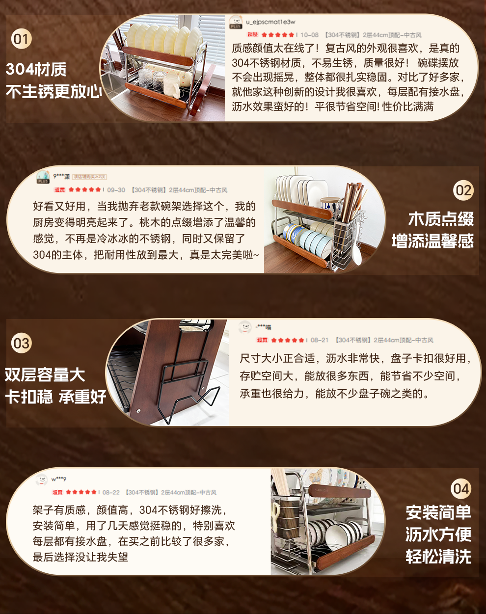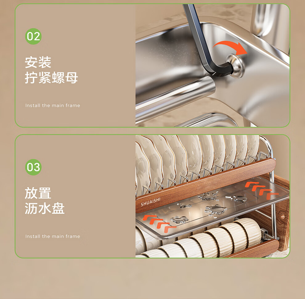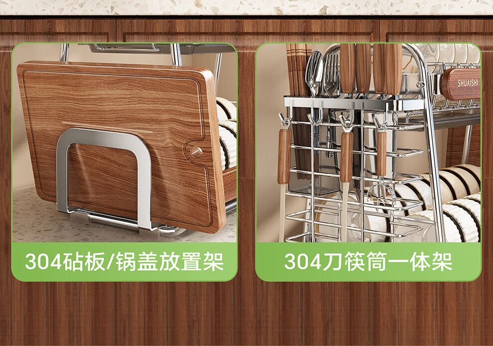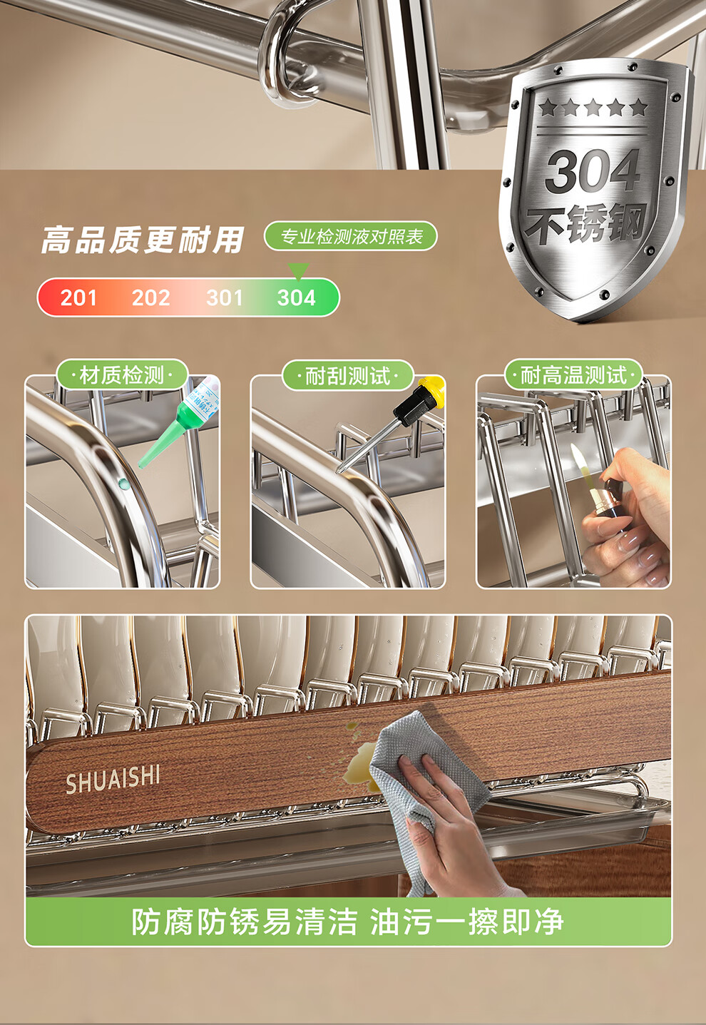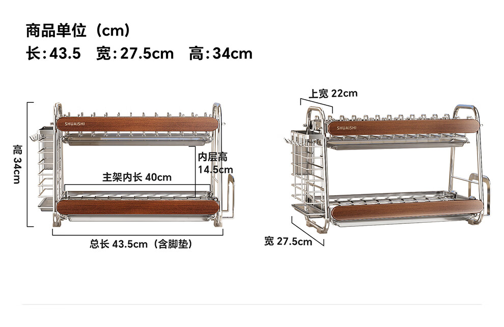 Shuaishi kitchen storage rack dish storage rack 304 stainless steel dish rack drain rack table top for dishes, chopsticks and cutlery cabinet 304 stainless steel 2 layers 44cm top - medieval style丨Solid solid wood
