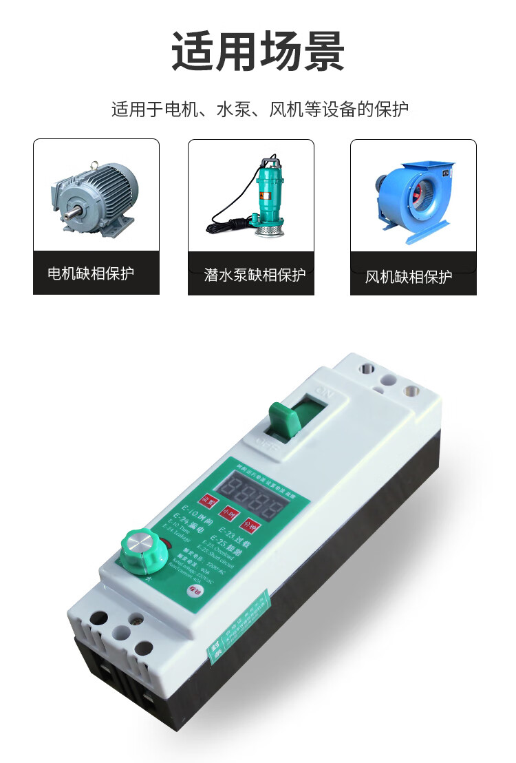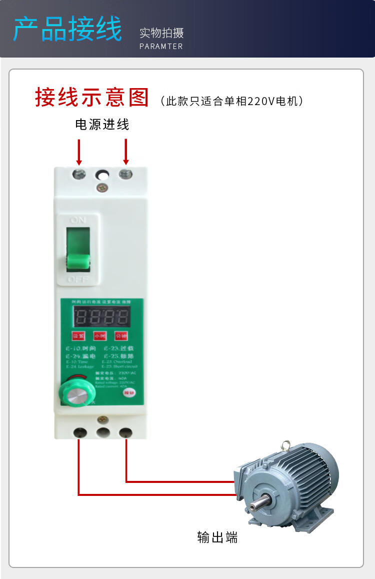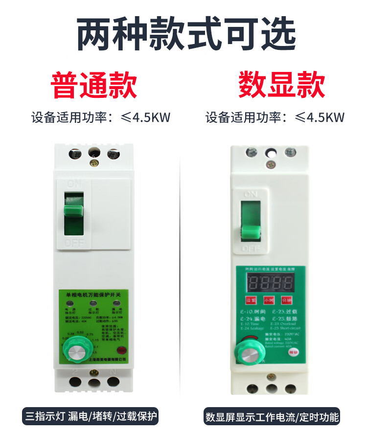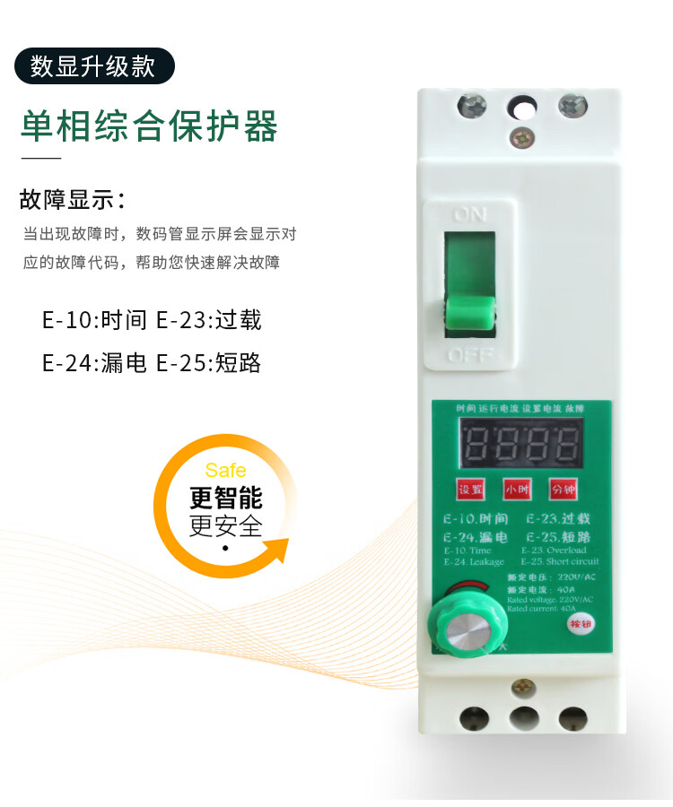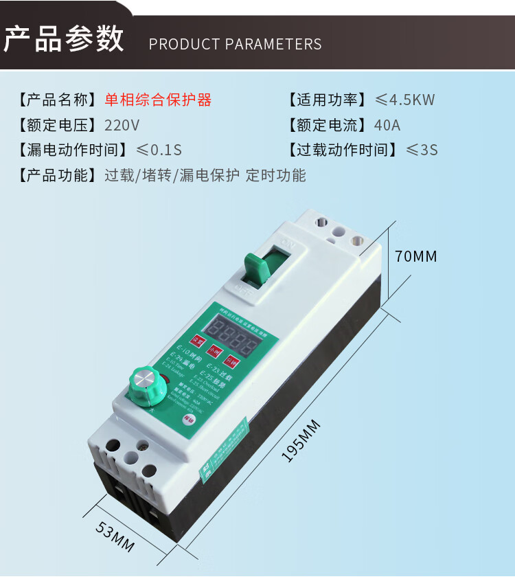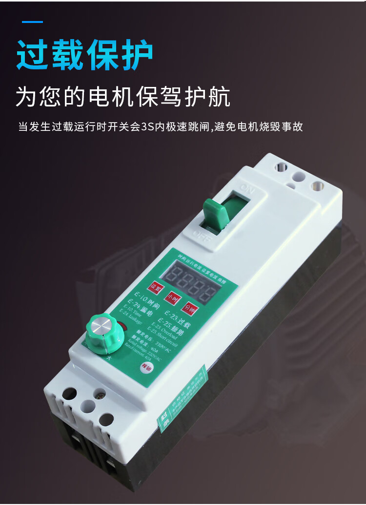 Single-phase motor protector 220V two-phase motor water pump fan leakage overload stall short-circuit protection digital display 40A 2P
