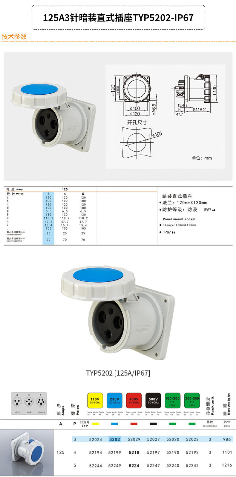 Weipu TYP2702 industrial plug and socket connector 125A3 core IP67 380V WEIPU waterproof