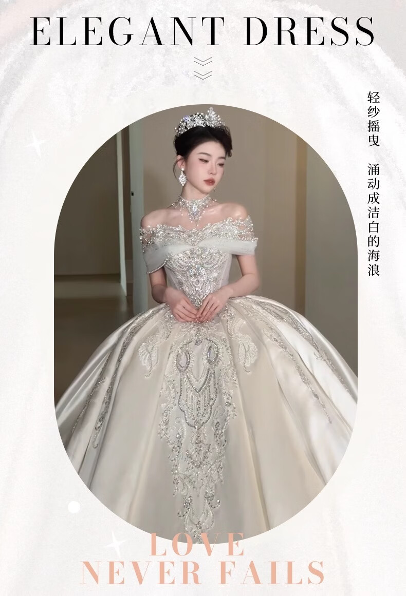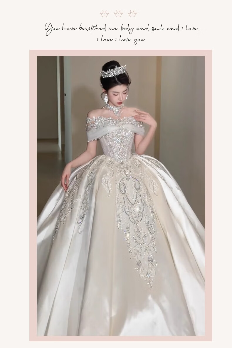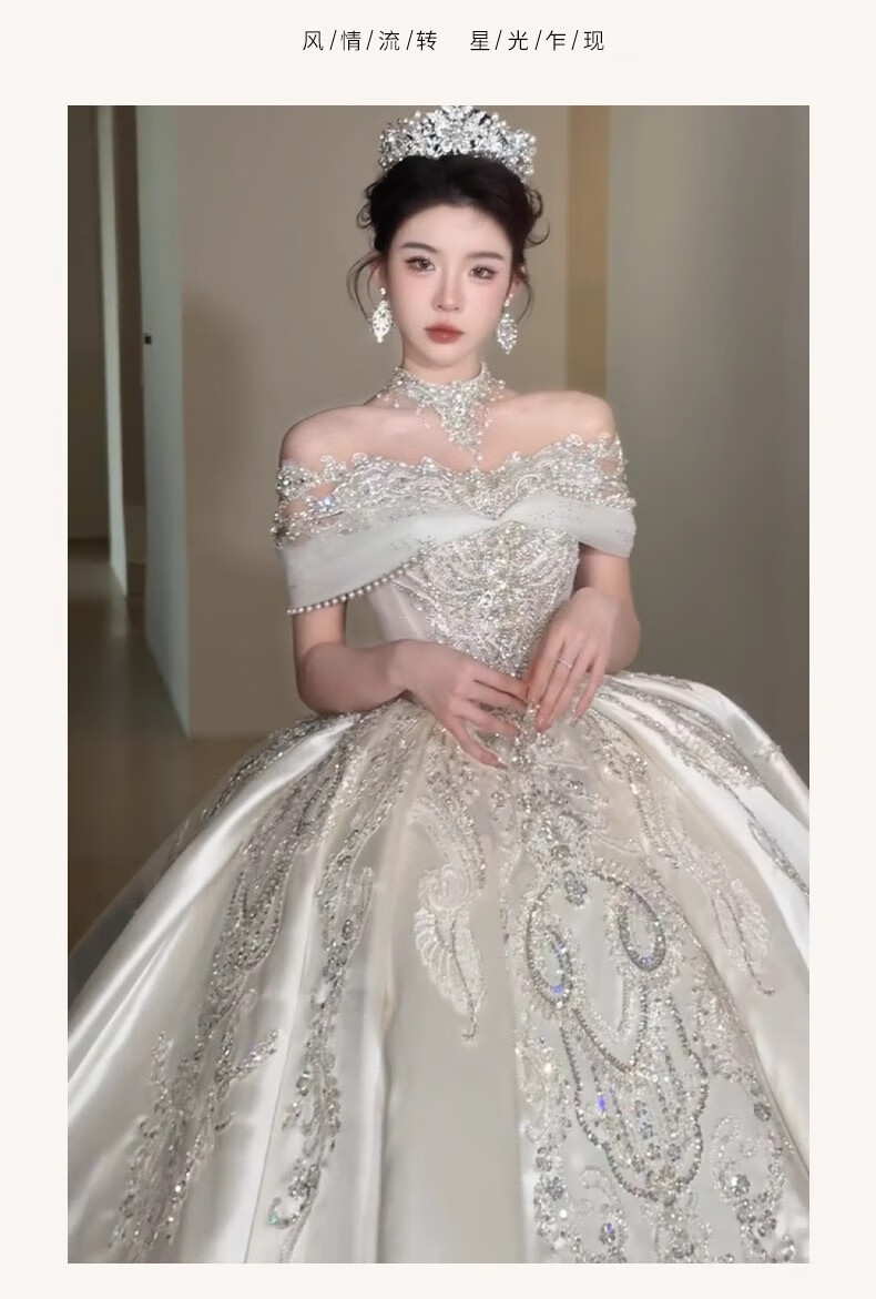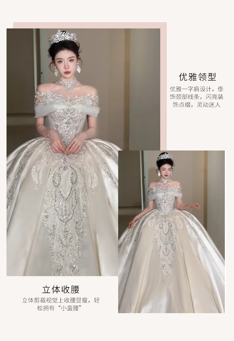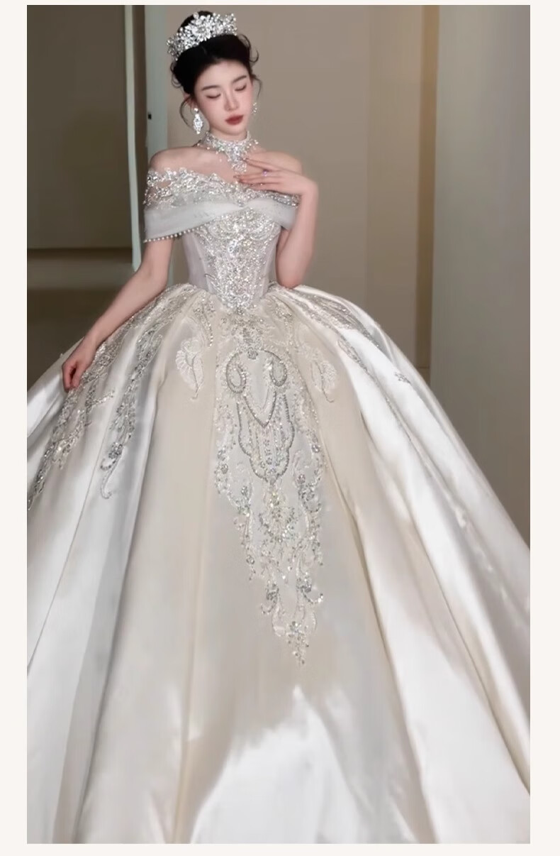Rich collar French wedding dress bridal main yarn one-shoulder fugitive princess 2025 new textured dress satin style trailing three-piece set L