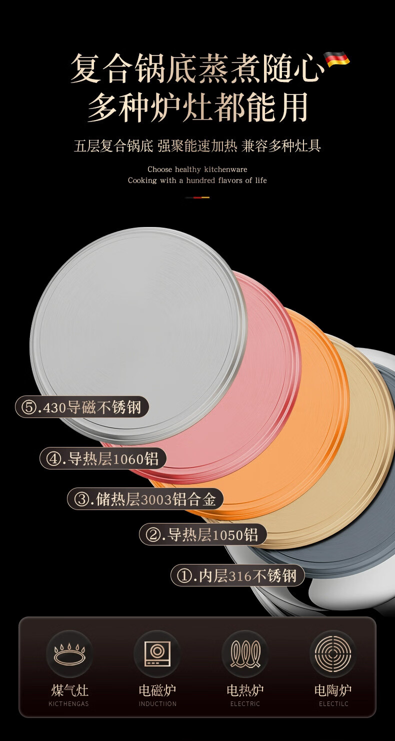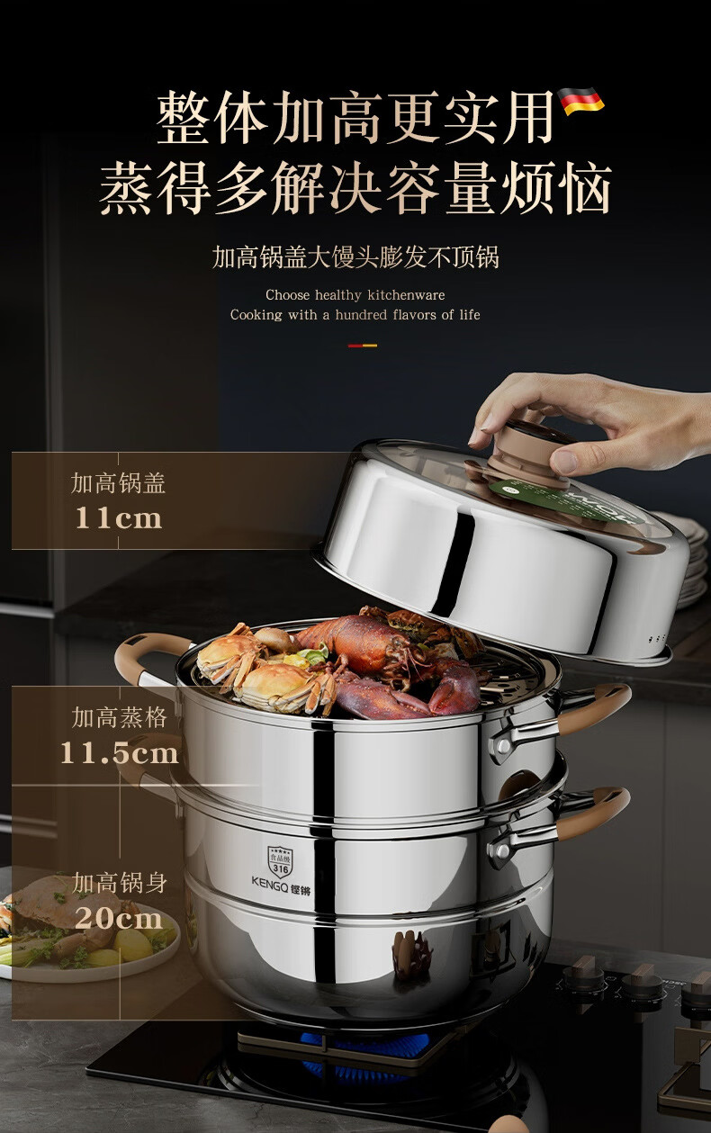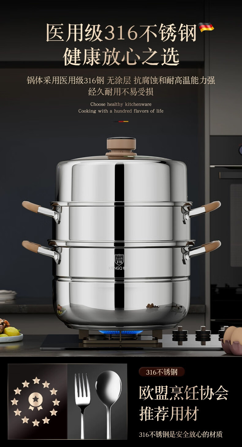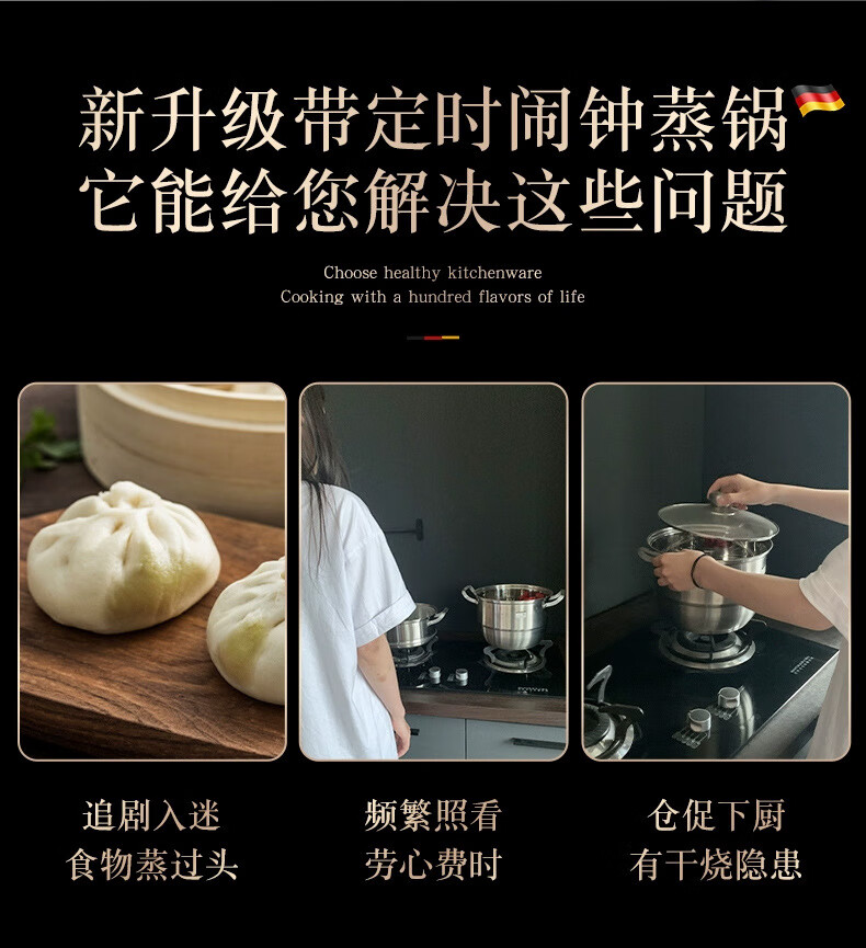 Fat Donglai's same German 316 stainless steel steamer household timer induction cooker gas special large capacity double triple layer double layer upgraded electronic timer alarm clock 28cm