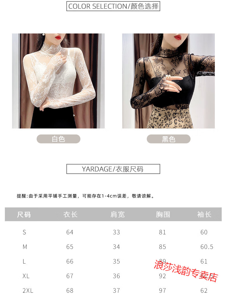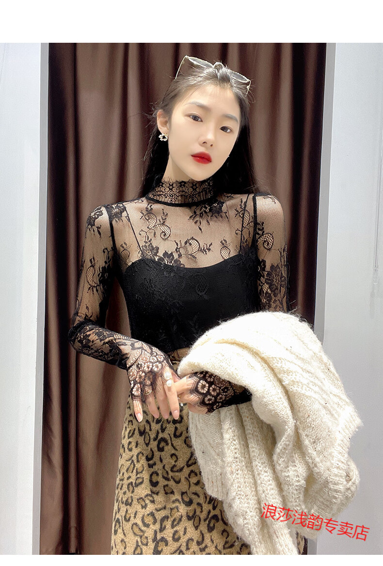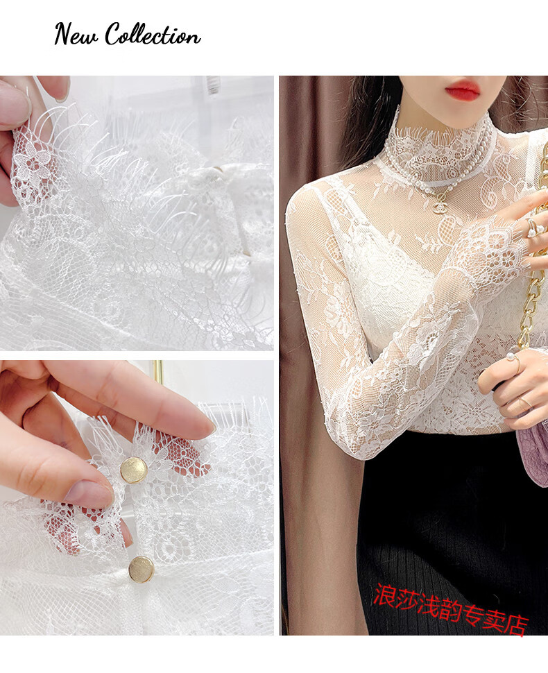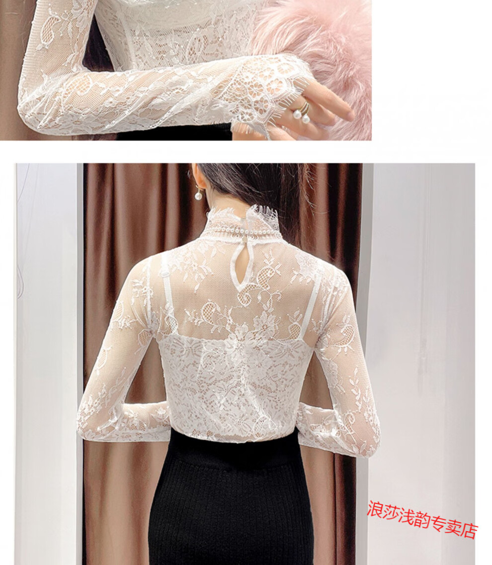 LangSha Half Turtle Collar Eyelash Lace Bottoming Top for Women Autumn and Winter 2025 Western Style Inside Black Tulle Clothes Hollow Mesh Top White L
