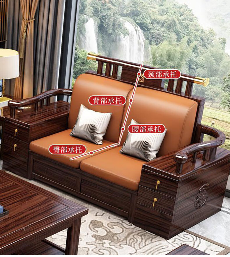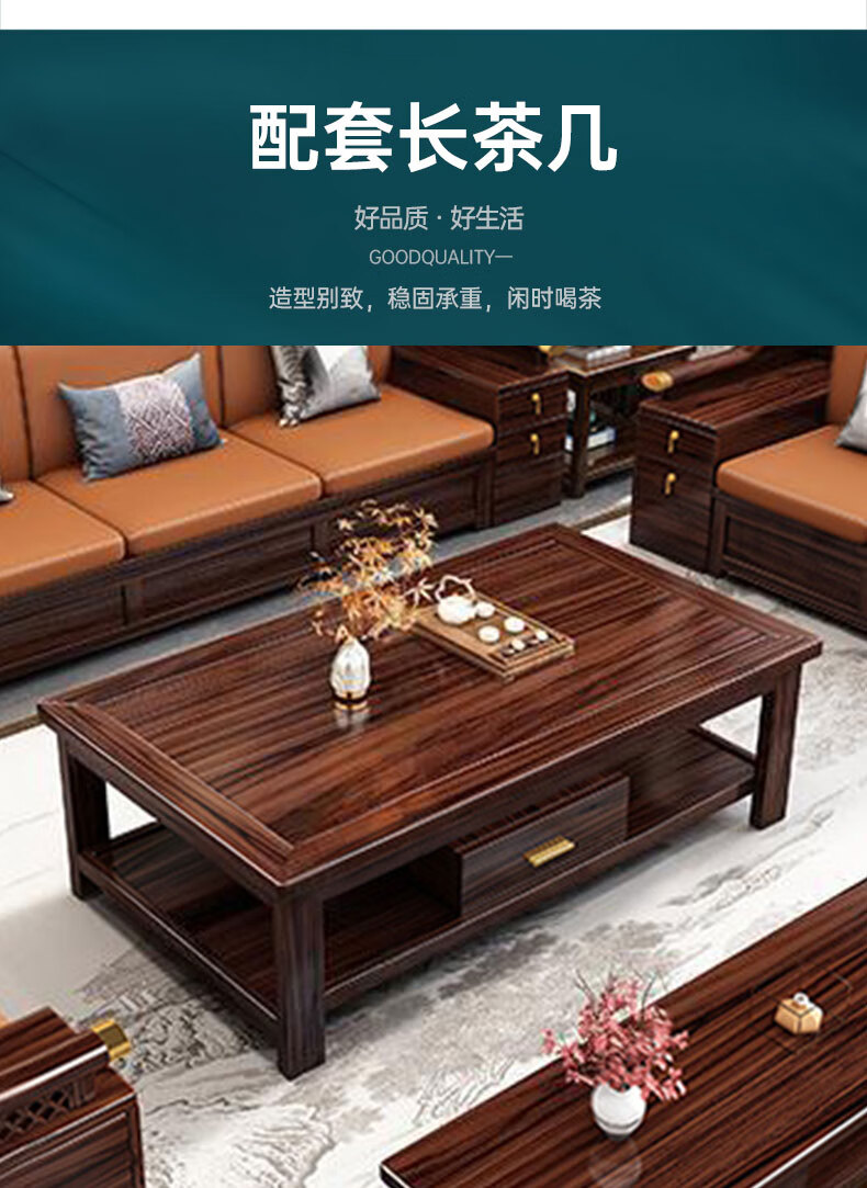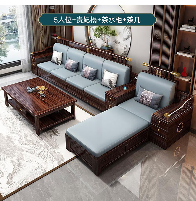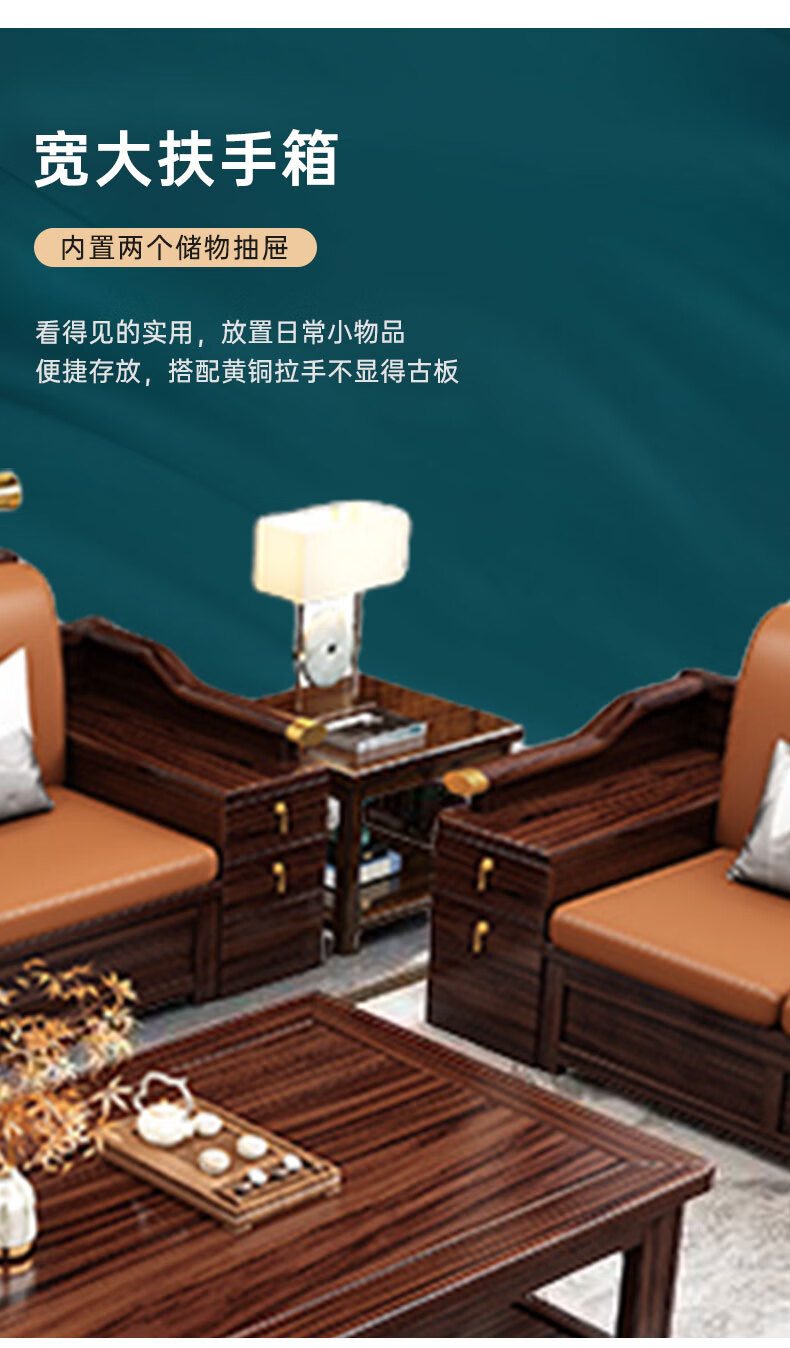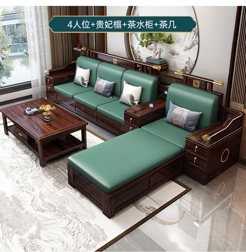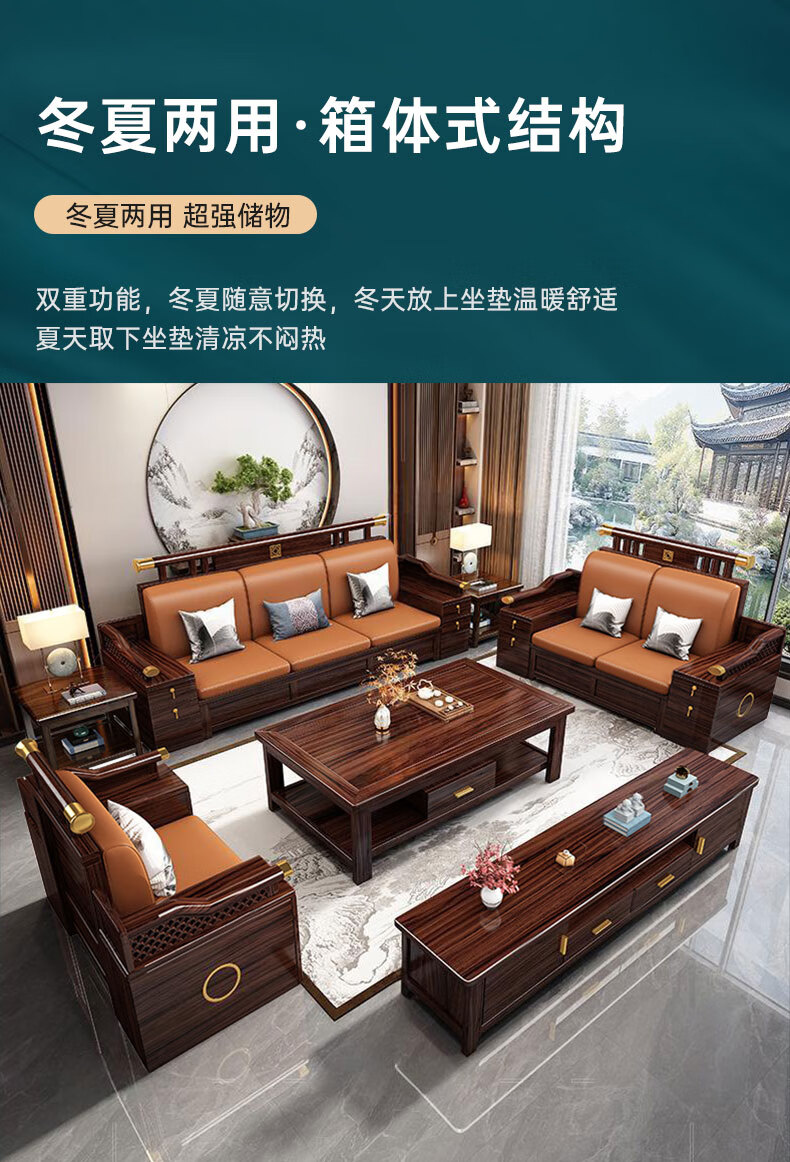 Zihua solid wood sofa, new Chinese style ebony wood single and double three-person combination, imperial concubine winter and summer dual-use living room furniture LY1002# 1+2+3+ coffee table (with drawer), storage model, cat scratching leather cushion