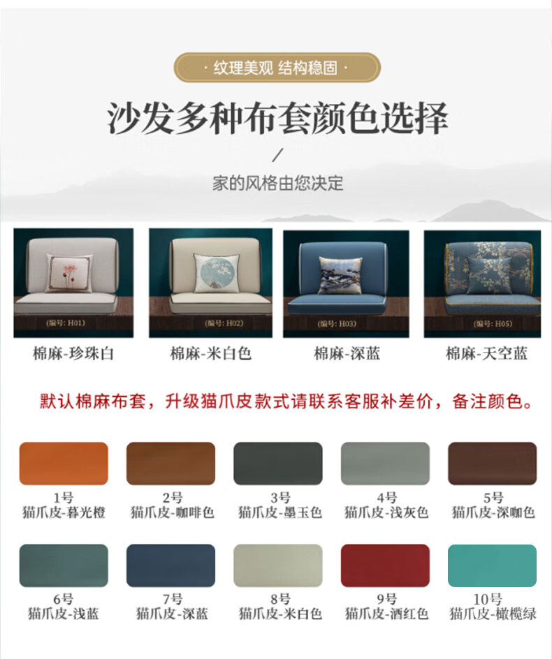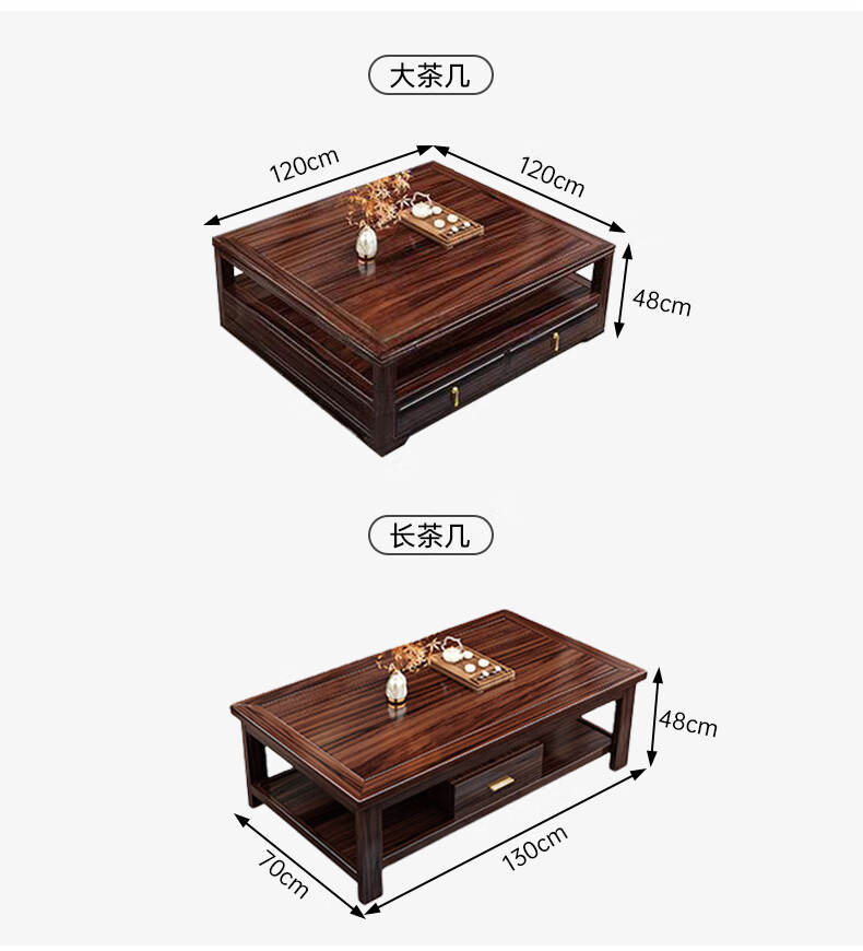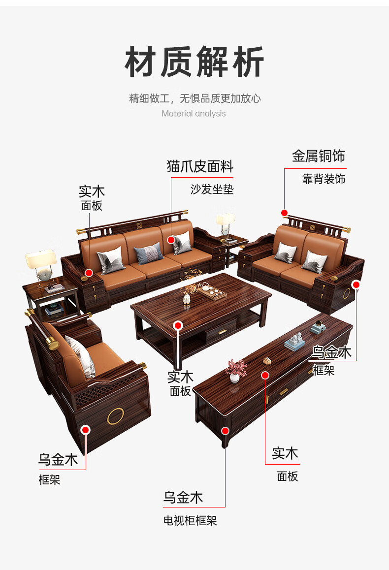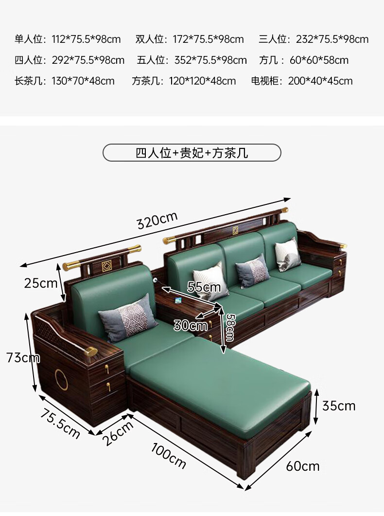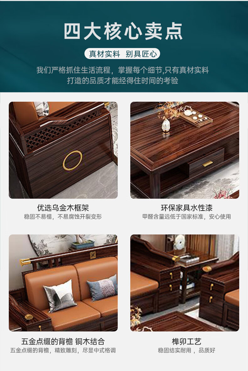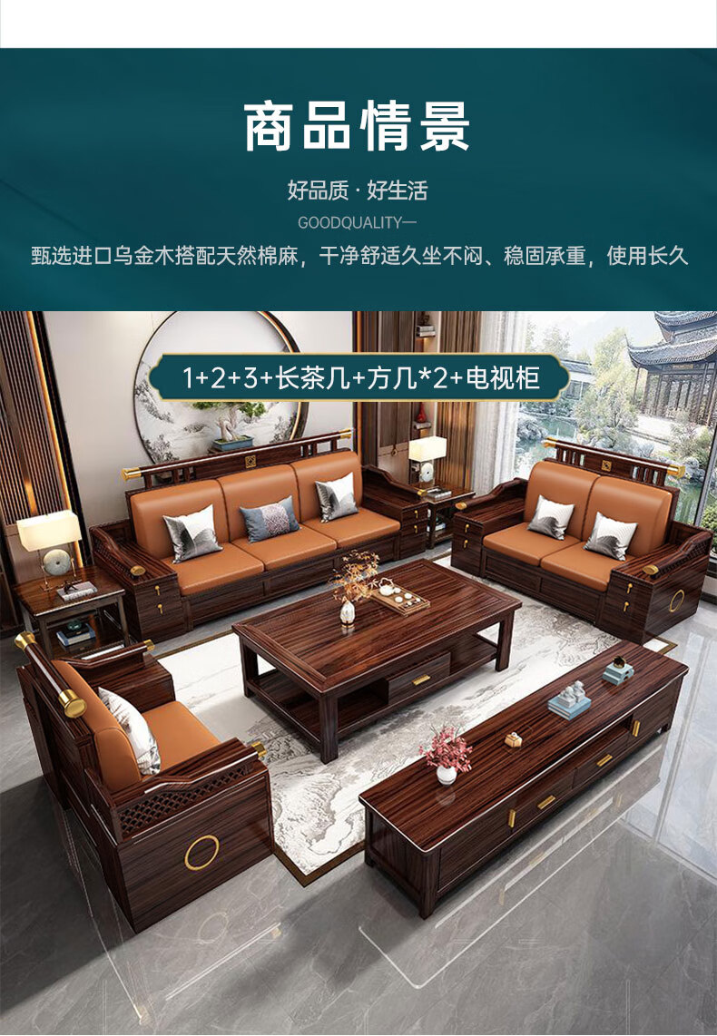 Zihua solid wood sofa, new Chinese style ebony wood single and double three-person combination, imperial concubine winter and summer dual-use living room furniture LY1002# 1+2+3+ coffee table (with drawer), storage model, cat scratching leather cushion