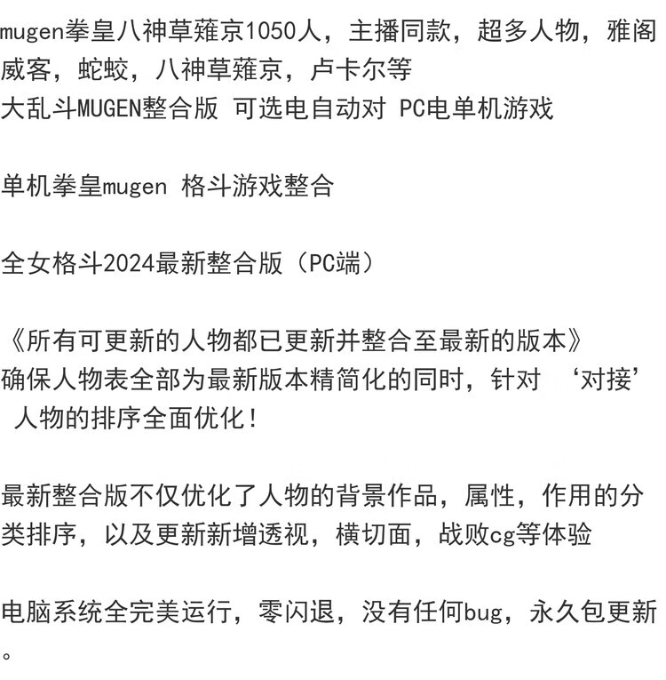 1050 character collection, stand-alone King of Fighters mugen, free all-female fighting game integration, collector's edition, all languages