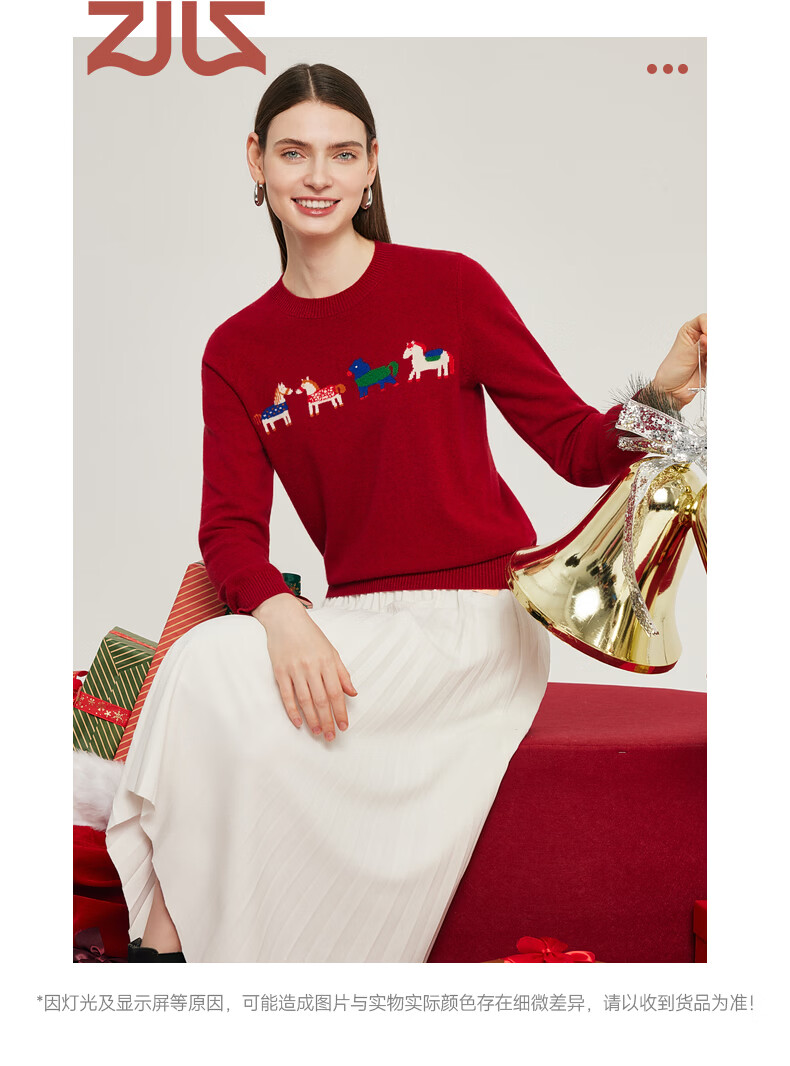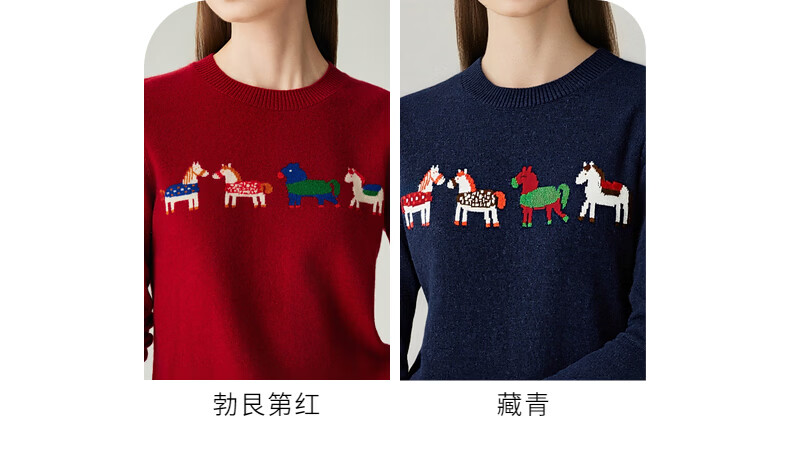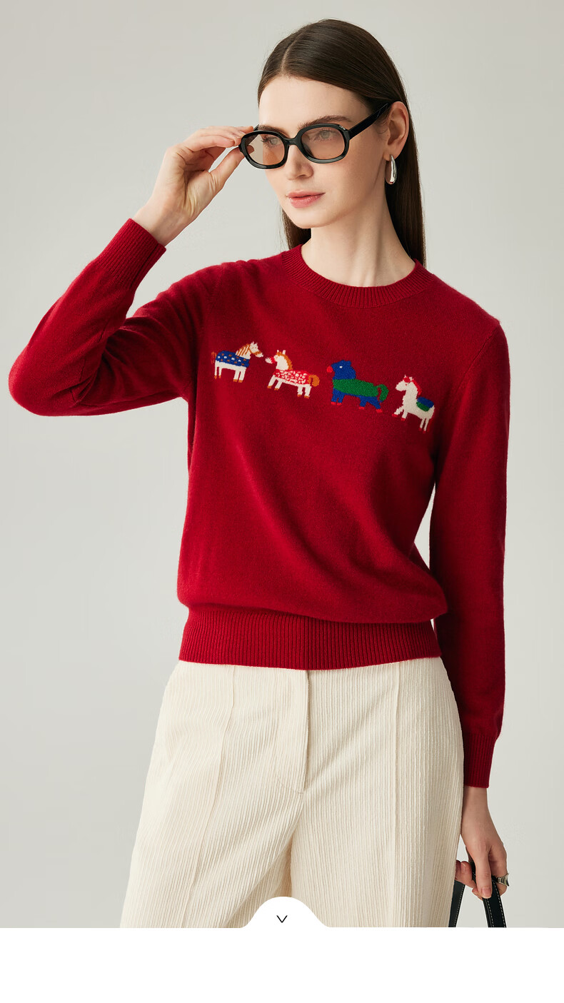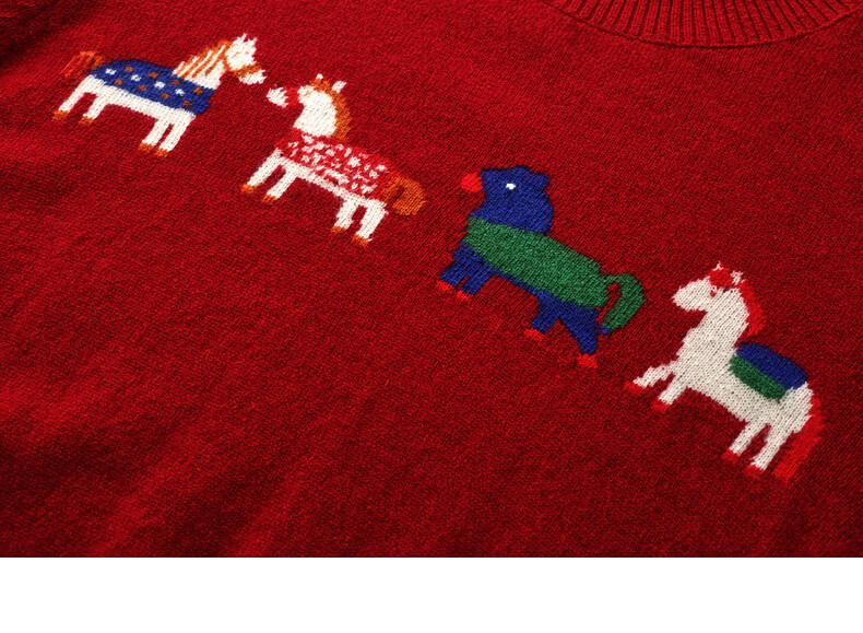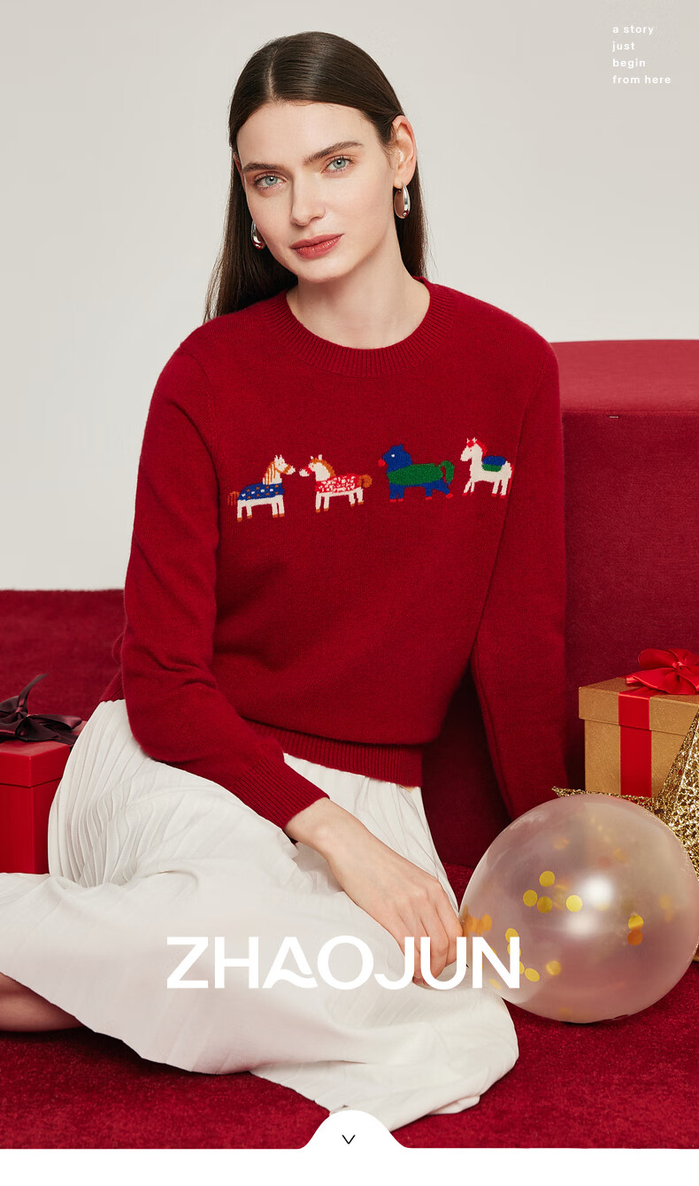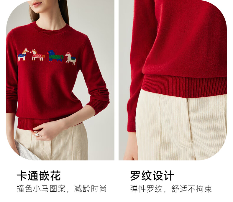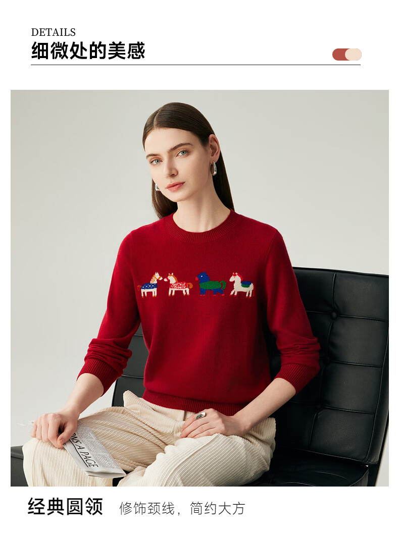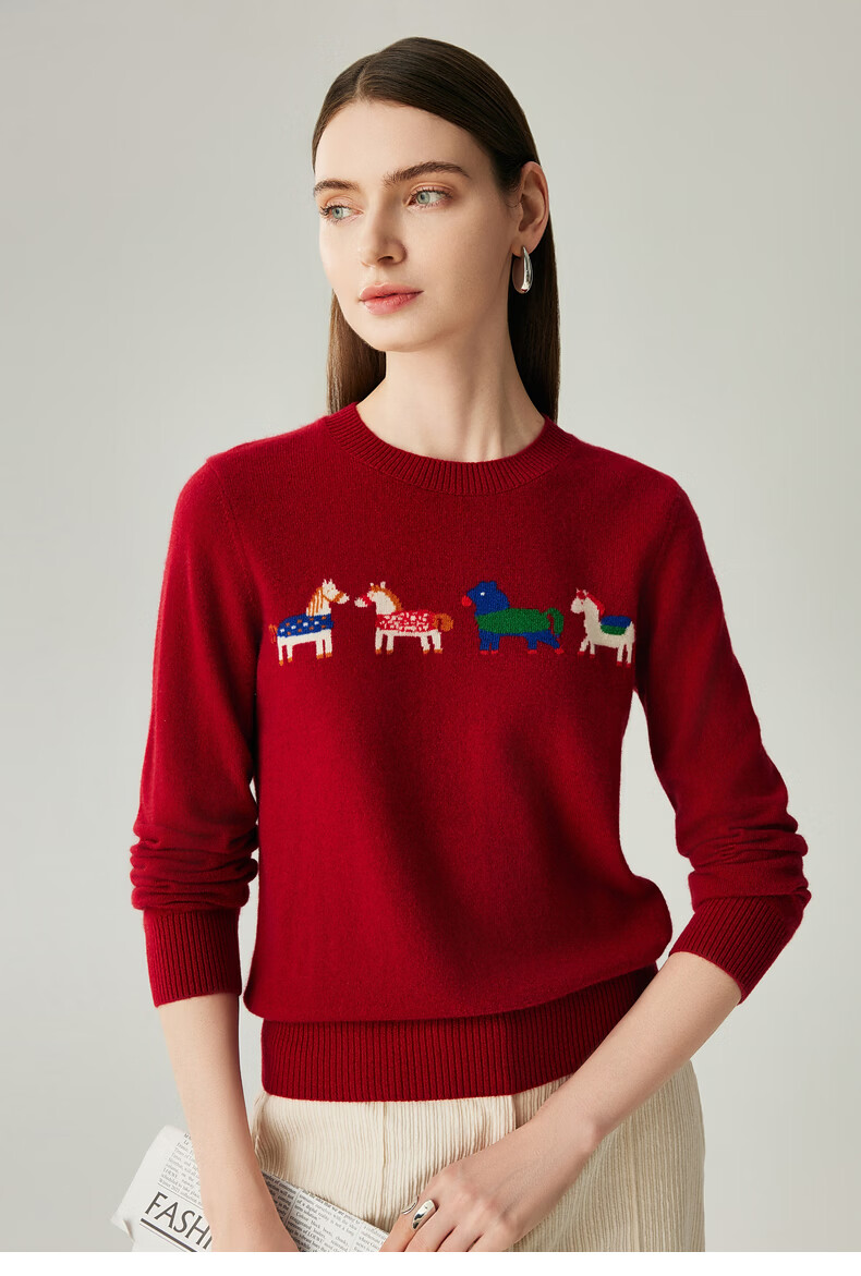 Zhaojun 2025 Autumn and Winter New Contrast Color Horse Zodiac Style Cashmere Sweater Women's Red Knitted Sweater Round Neck Bottoming Sweater Burgundy Red L