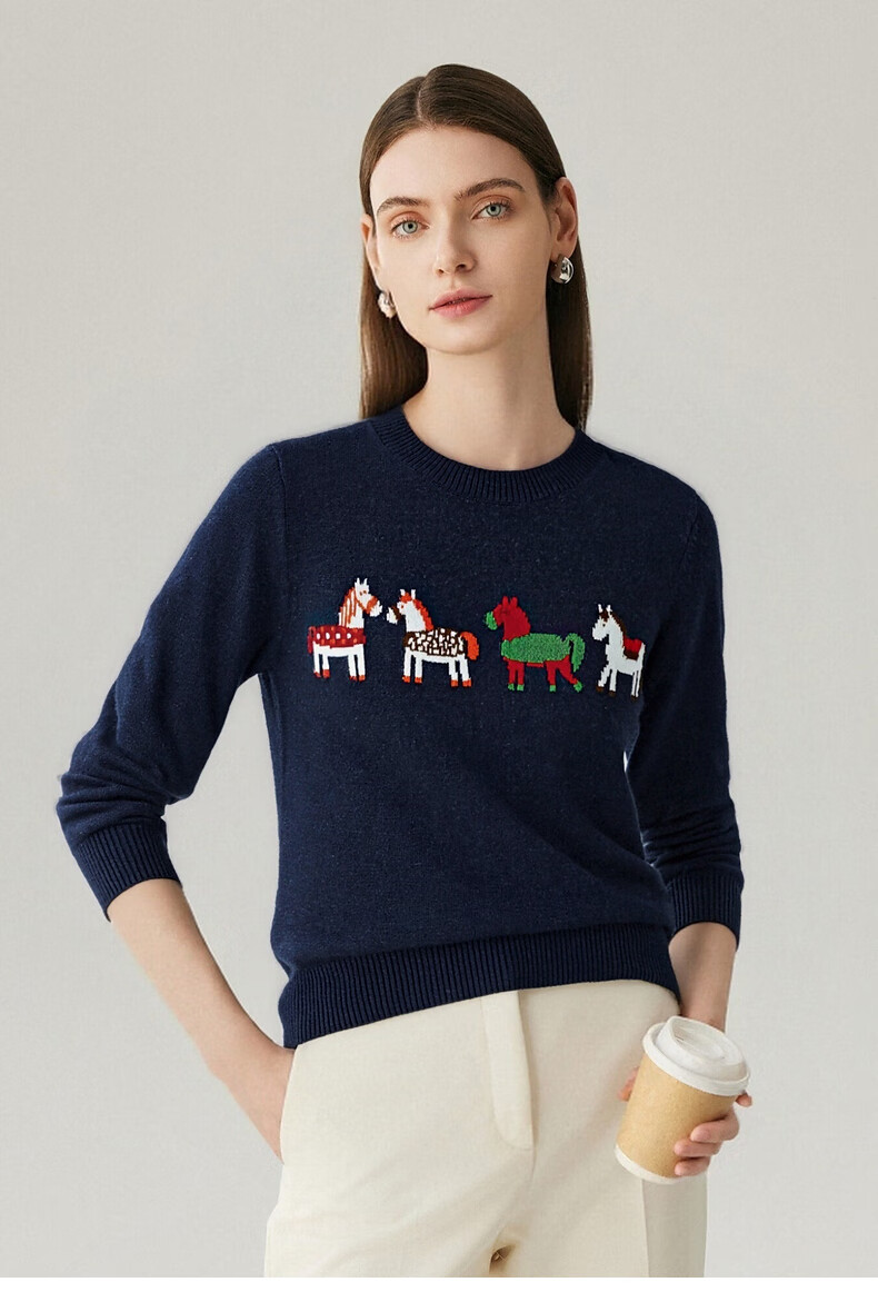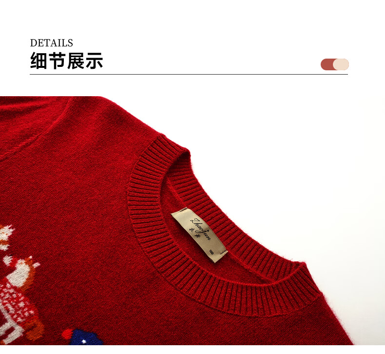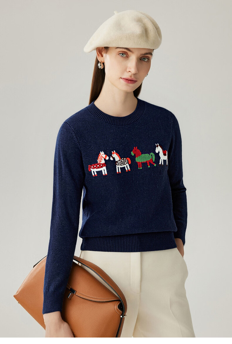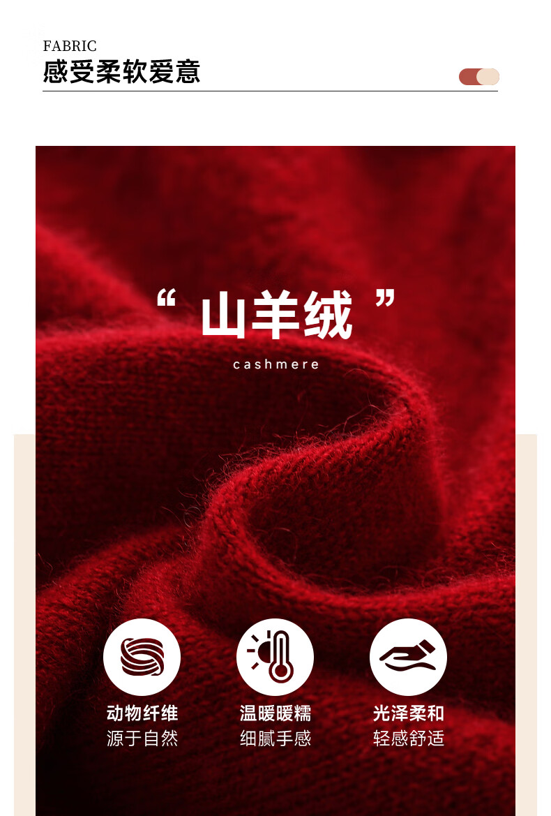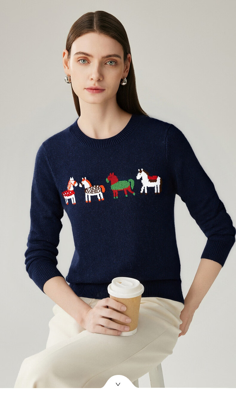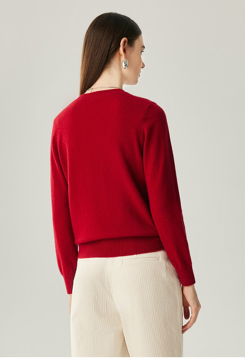 Zhaojun 2025 Autumn and Winter New Contrast Color Horse Zodiac Style Cashmere Sweater Women's Red Knitted Sweater Round Neck Bottoming Sweater Burgundy Red L