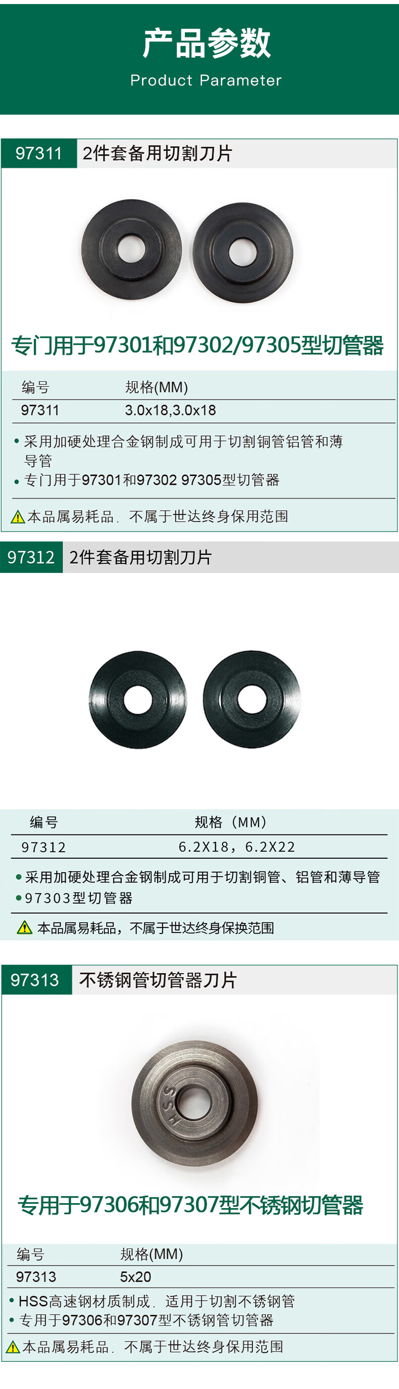 Shida Sata/Shida blade bearing cutter copper pipe cutter stainless steel aluminum pipe thin conduit cutter 97311_2-piece set spare cutting blade 3x18MM