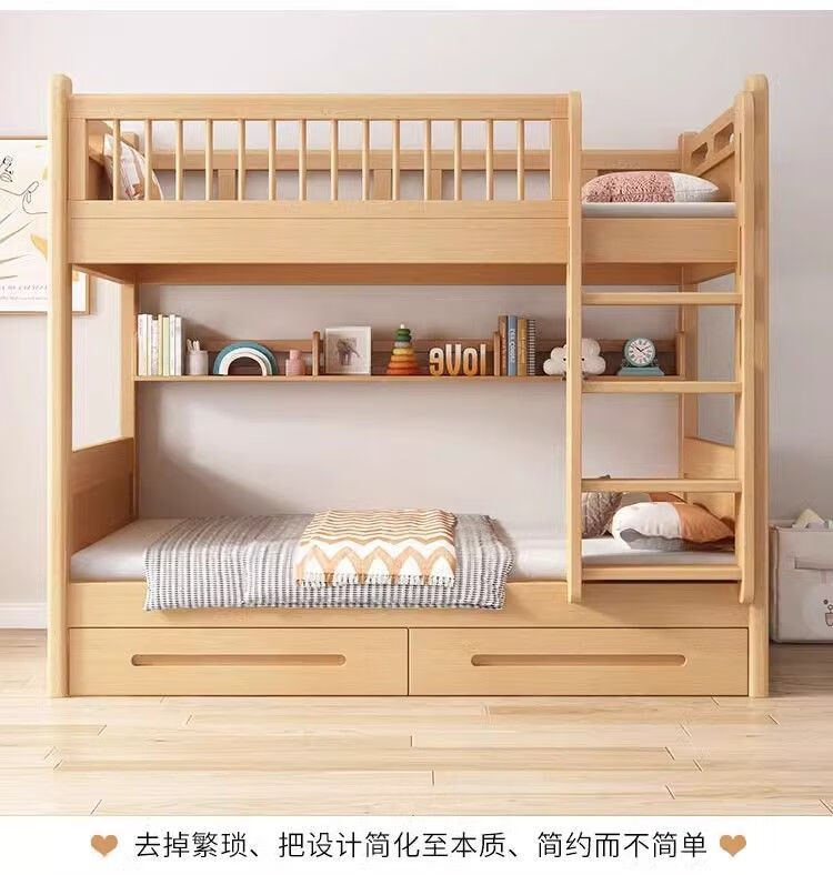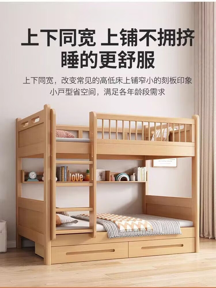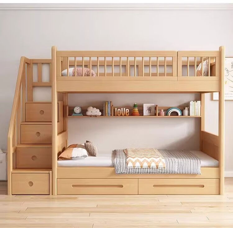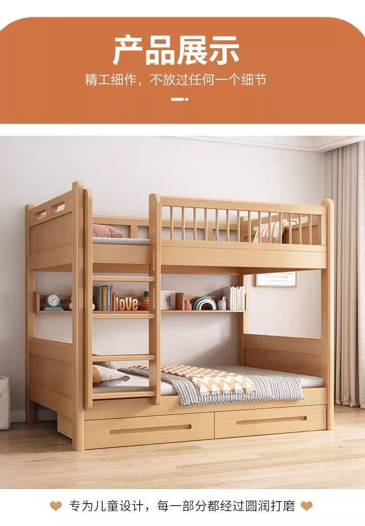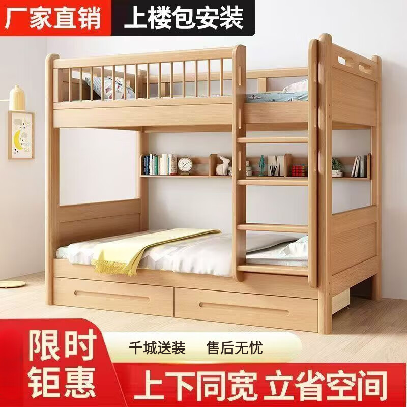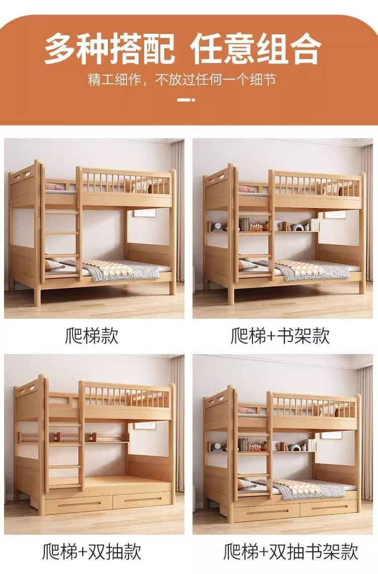 Ou Xufeng's 2026 new beech bunk bed, solid wood bunk bed, high and low small apartment bed, double bed, bunk bed, beech ladder bed + drawer + solid wood bookshelf + free mattress (upper and lower * same width) 1.5 meters wide * 2.0 meters long